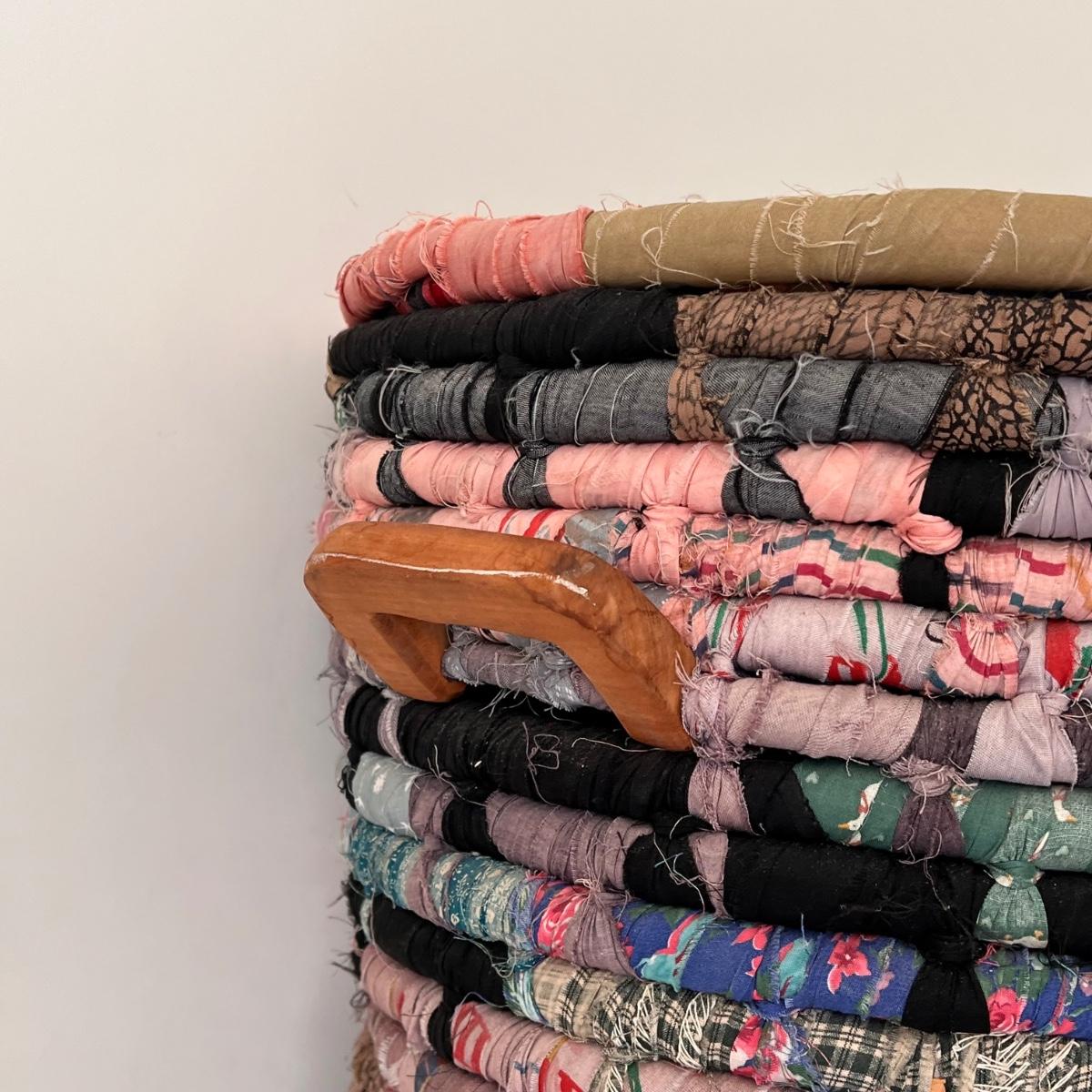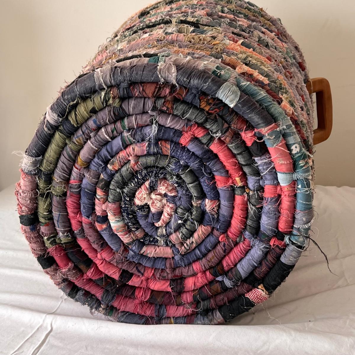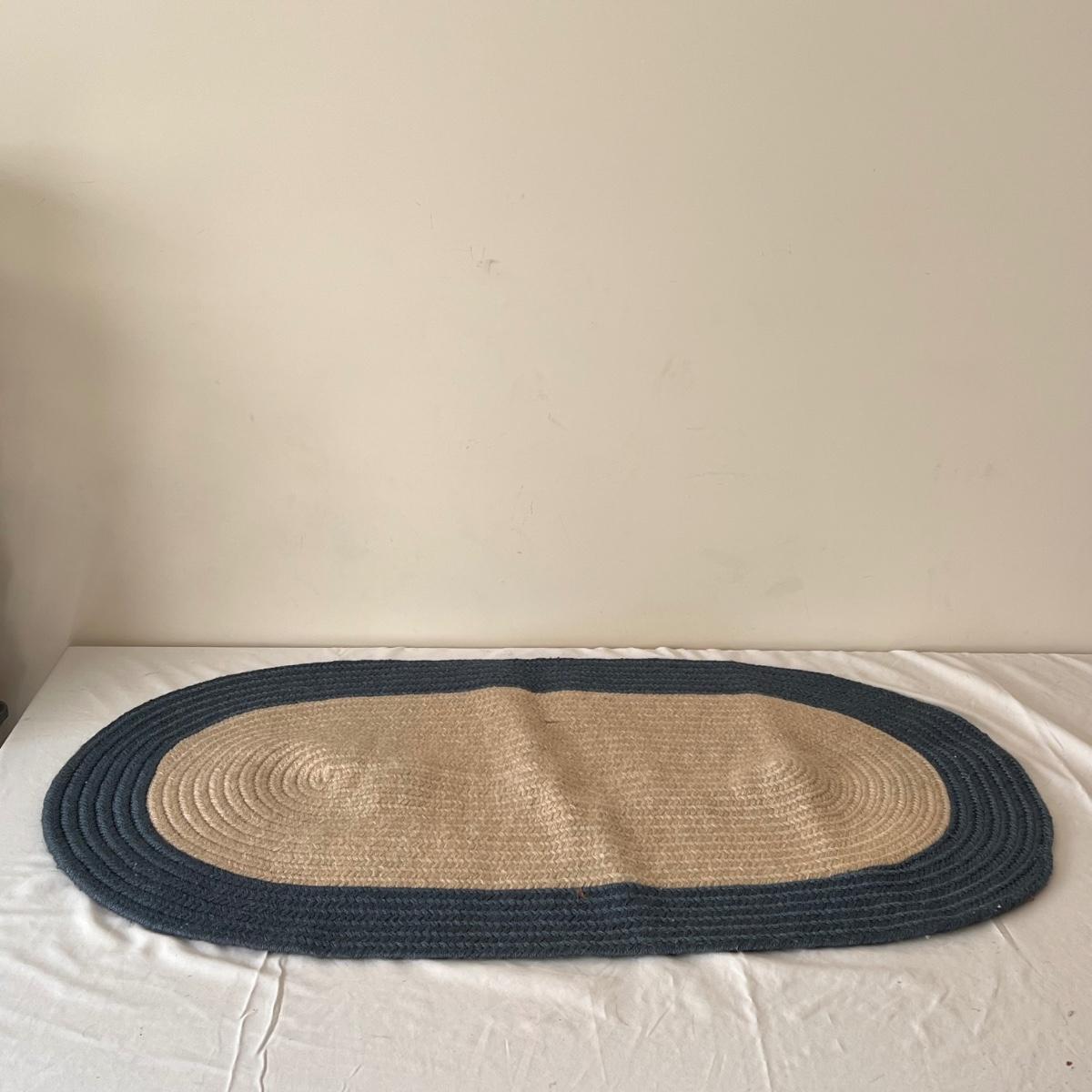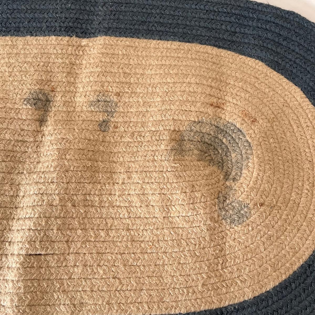 This lot includes three rugs, one large basket with a removable lid, a round mat, and a smaller basket. Two of the rugs appear to be hand woven into a heart braid. The largest is the tan and blue rug that measures 44” x 26”H. The large basket measures 21”D x 23”H. Shipping available.