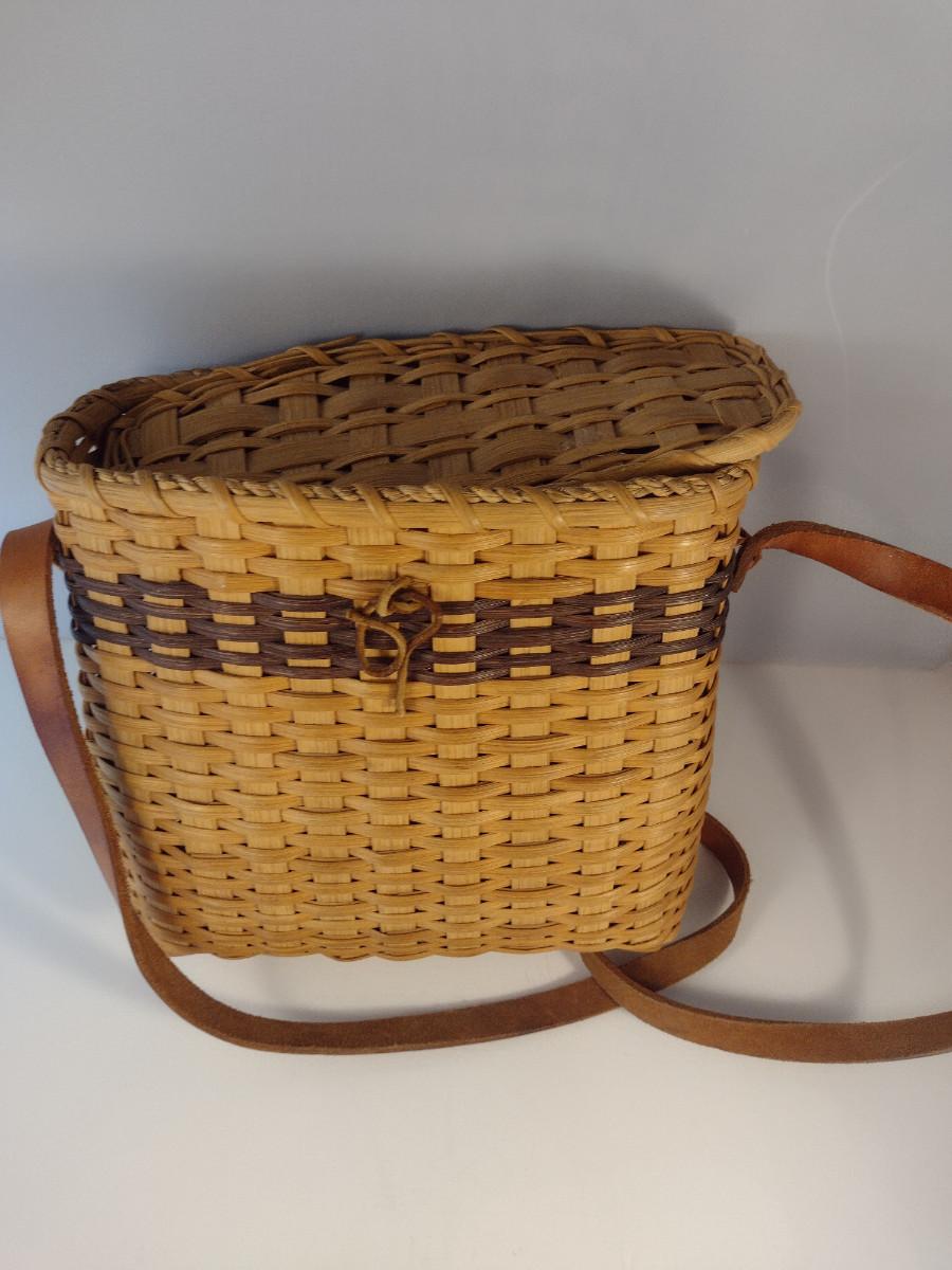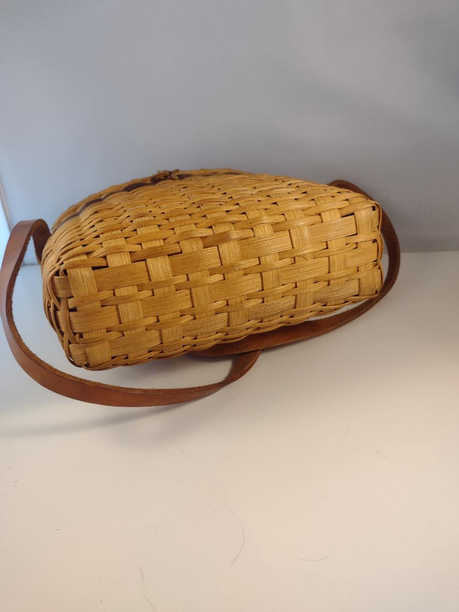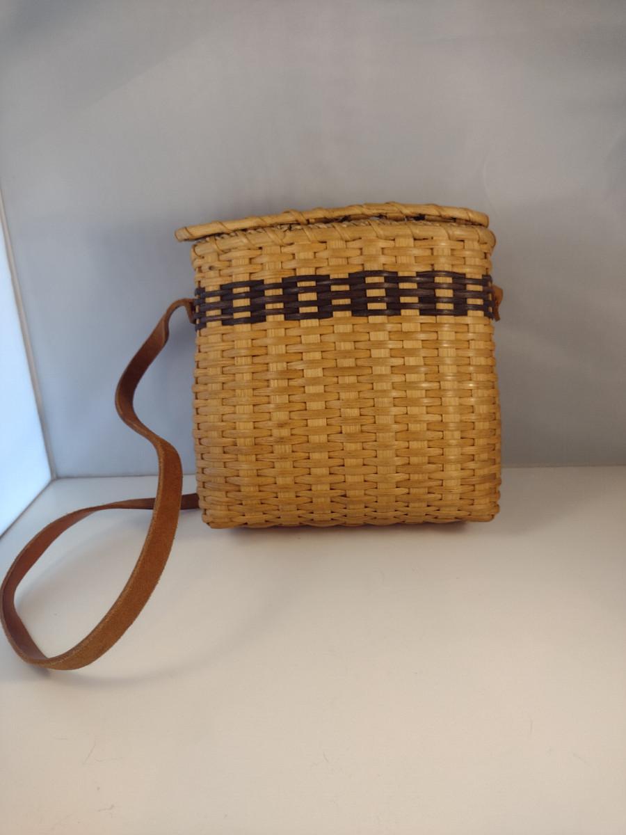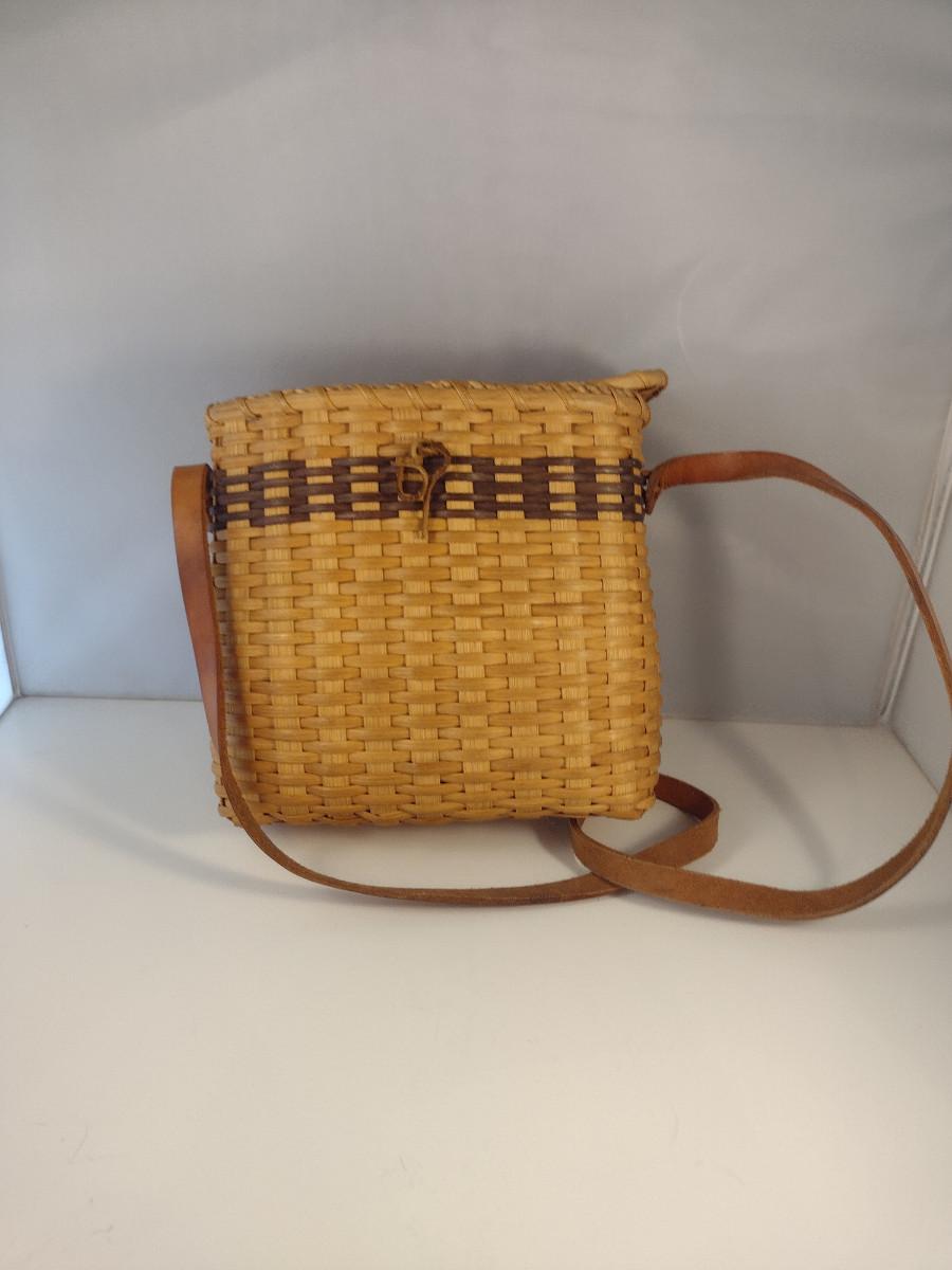 Hand Woven, Artisan Created Purse Style Basket with Lid and Leather Strap. Measures approx 9" x 5" x 9 1/2" tall.