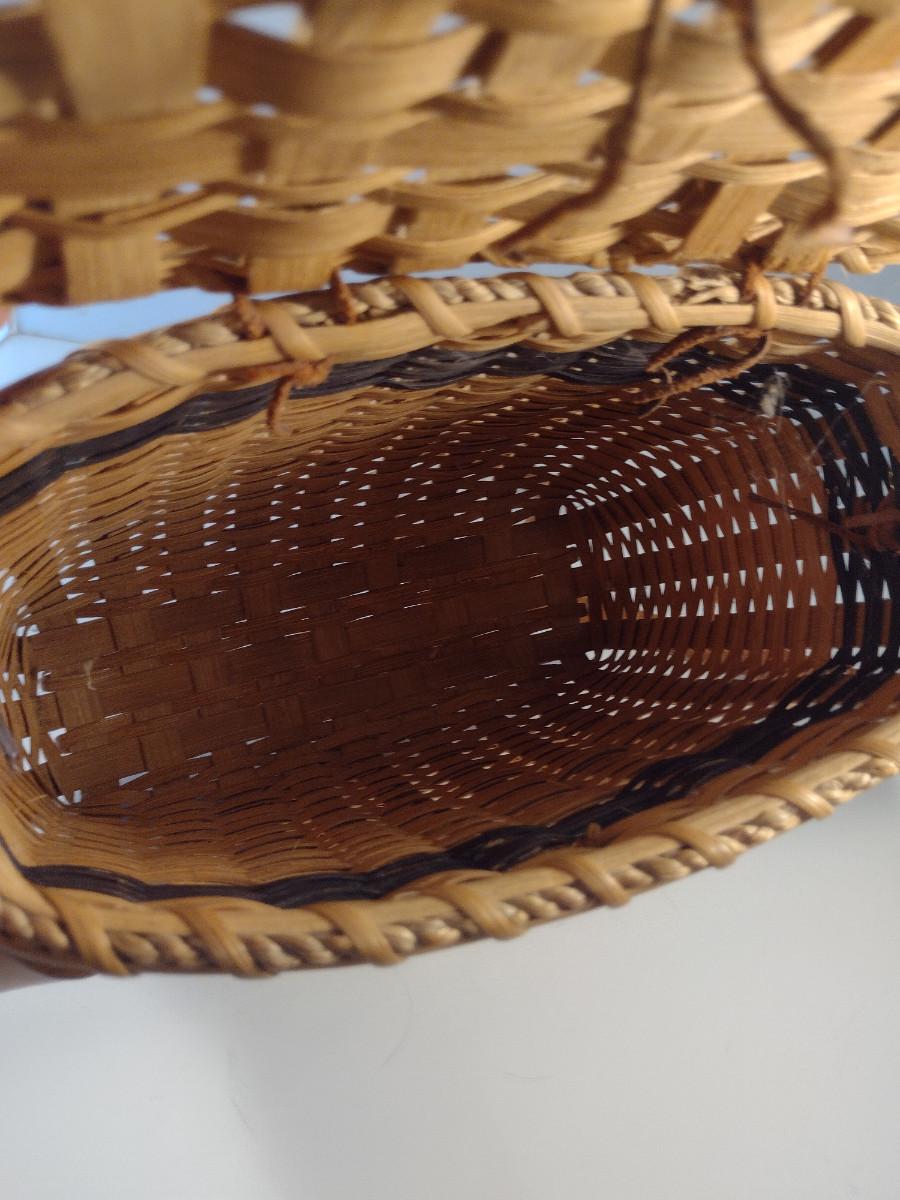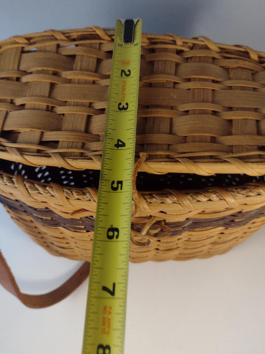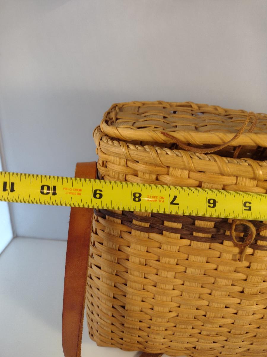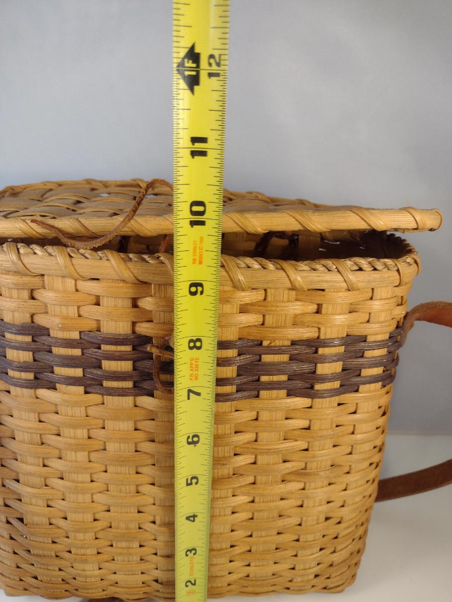 Hand Woven, Artisan Created Purse Style Basket with Lid and Leather Strap. Measures approx 9" x 5" x 9 1/2" tall.
