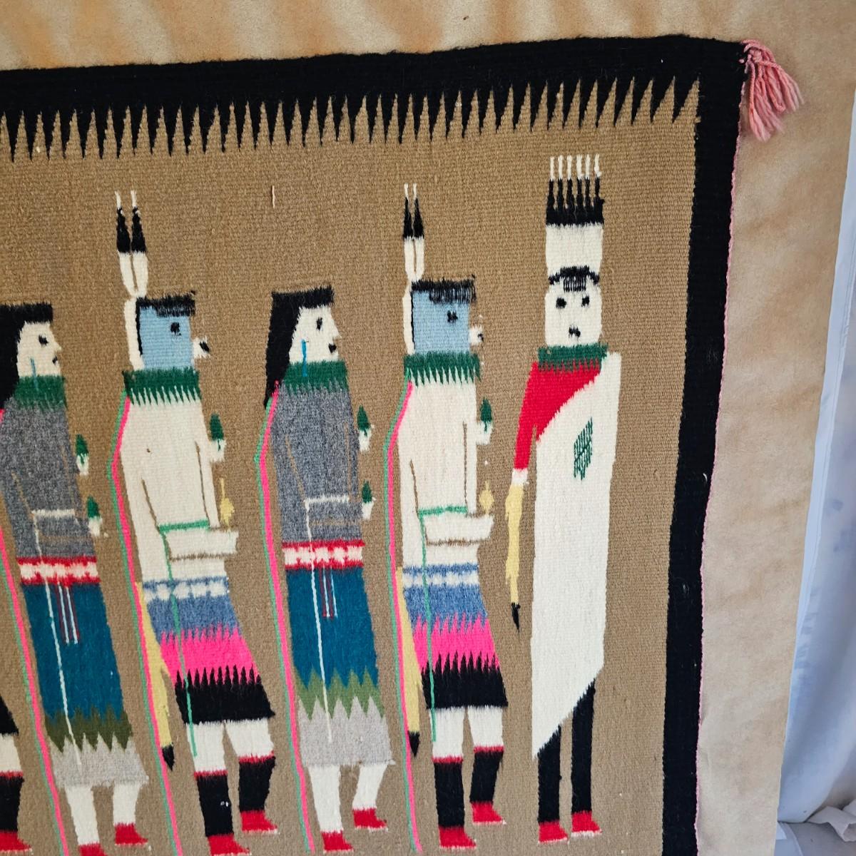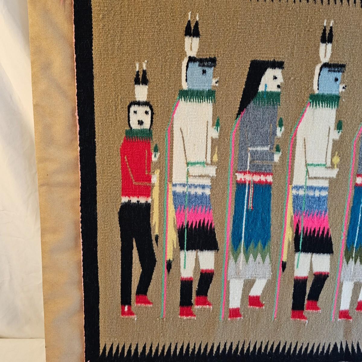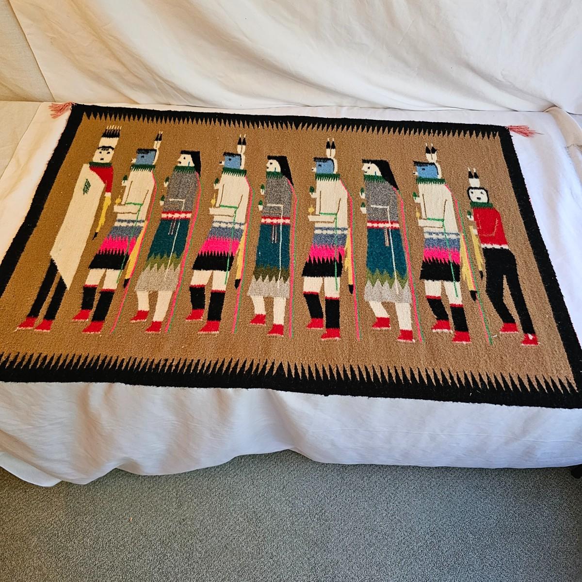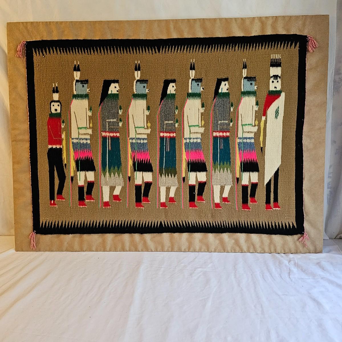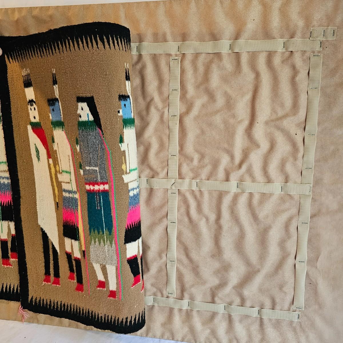 Beautiful Navajo art and design expressed in this rug. Traditional figures march across the surface. Rug is 41.5" x 29" (approximately 3.5' x 2.5'), mounting board is 48" x 2" x 35"H. Rug is secure to board by velcro, can be easily removed. See photos for details. Shipping available.