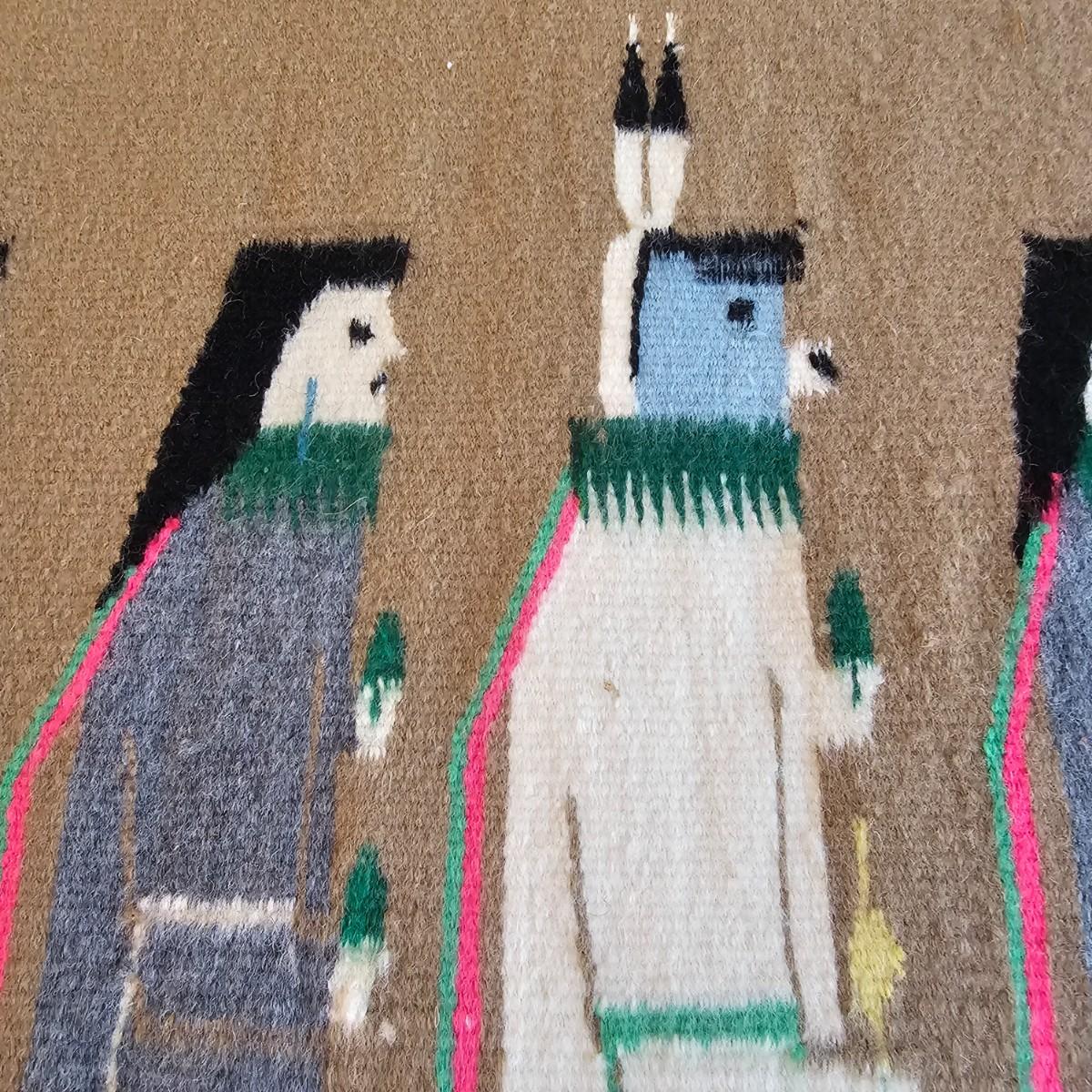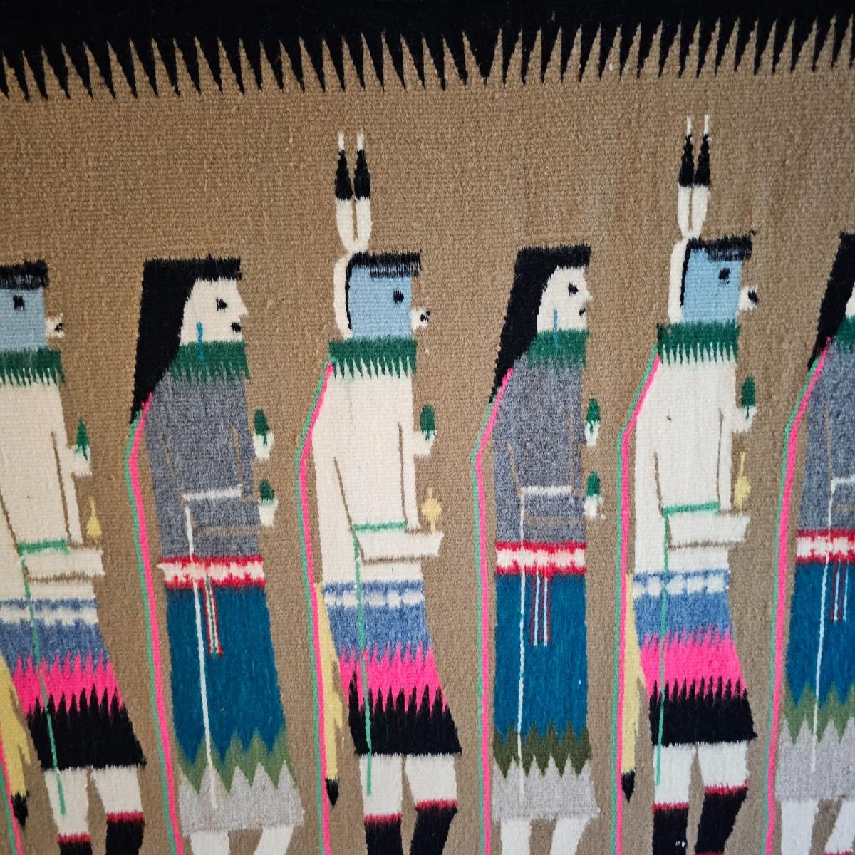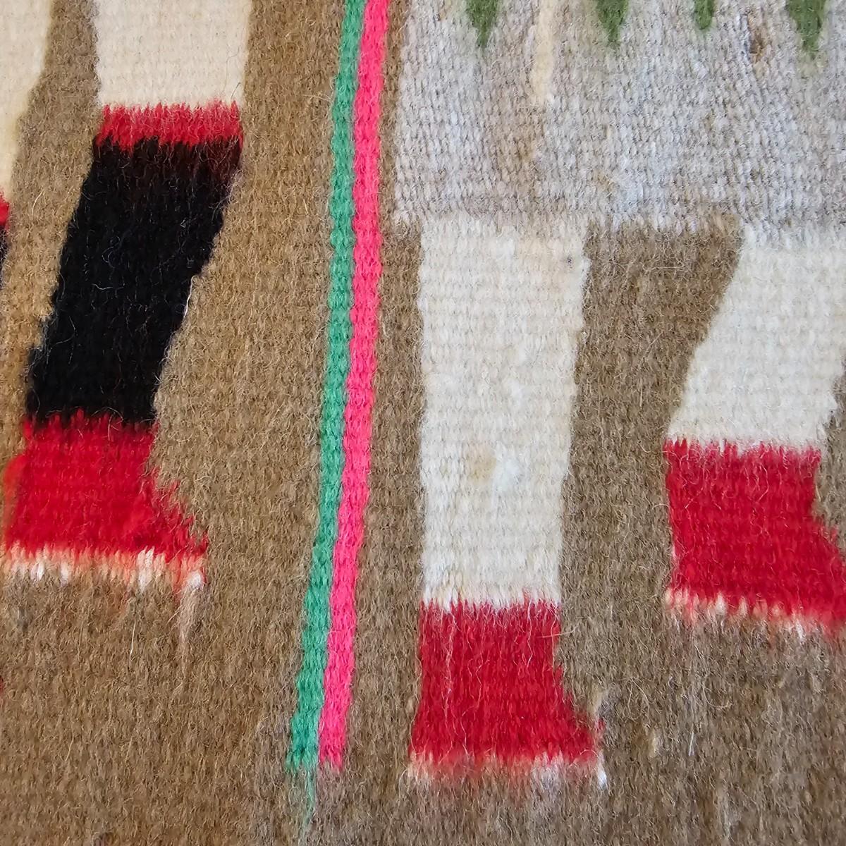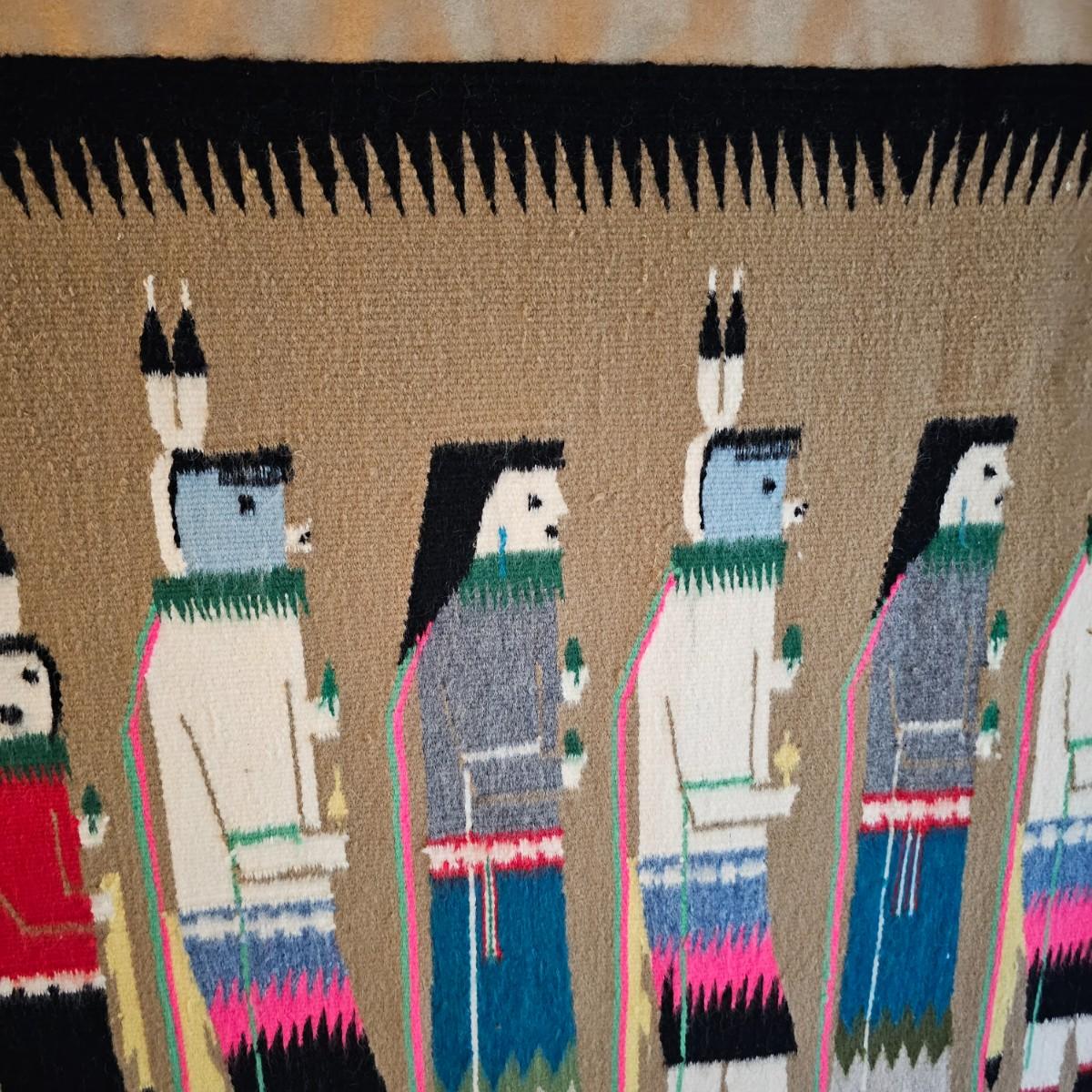 Beautiful Navajo art and design expressed in this rug. Traditional figures march across the surface. Rug is 41.5" x 29" (approximately 3.5' x 2.5'), mounting board is 48" x 2" x 35"H. Rug is secure to board by velcro, can be easily removed. See photos for details. Shipping available.