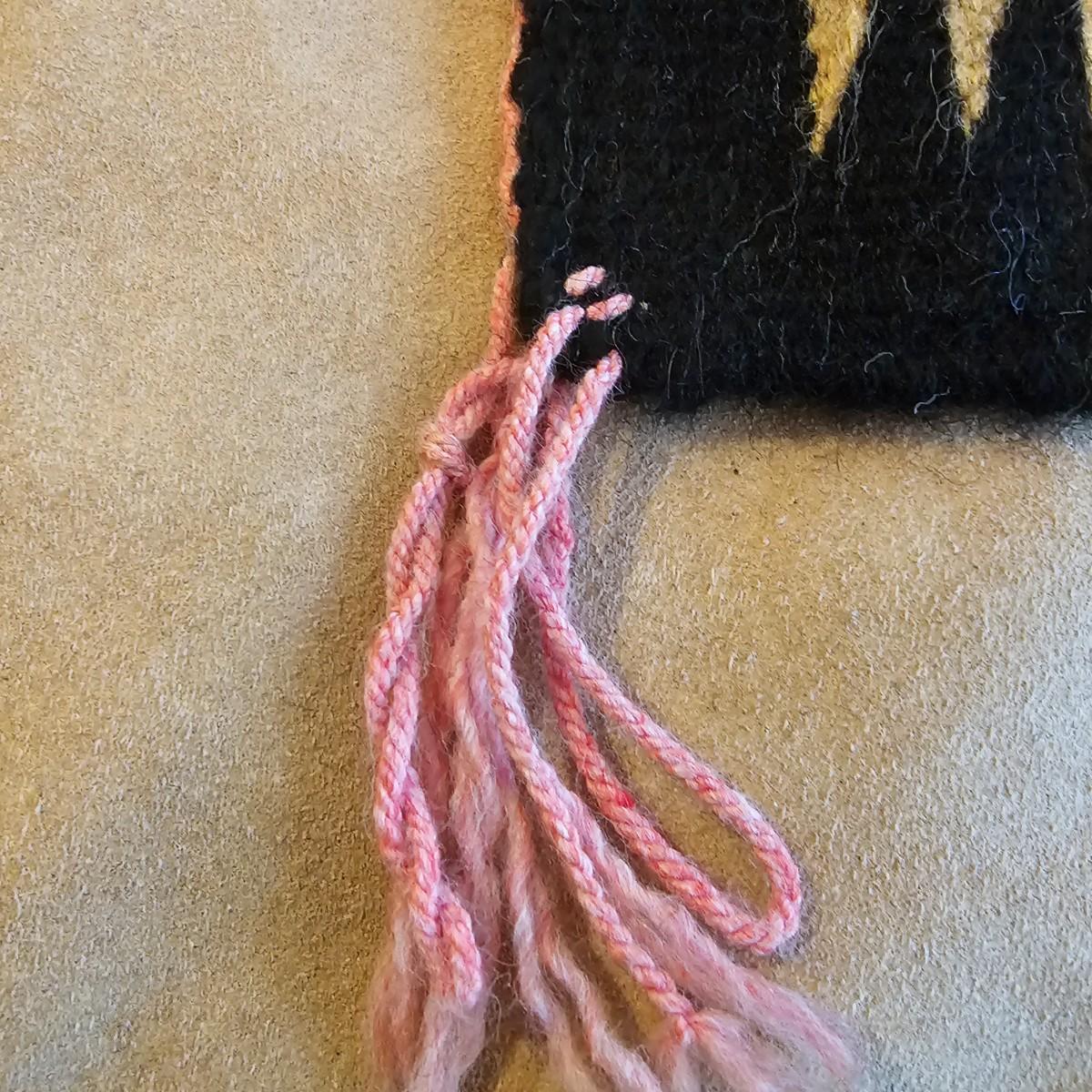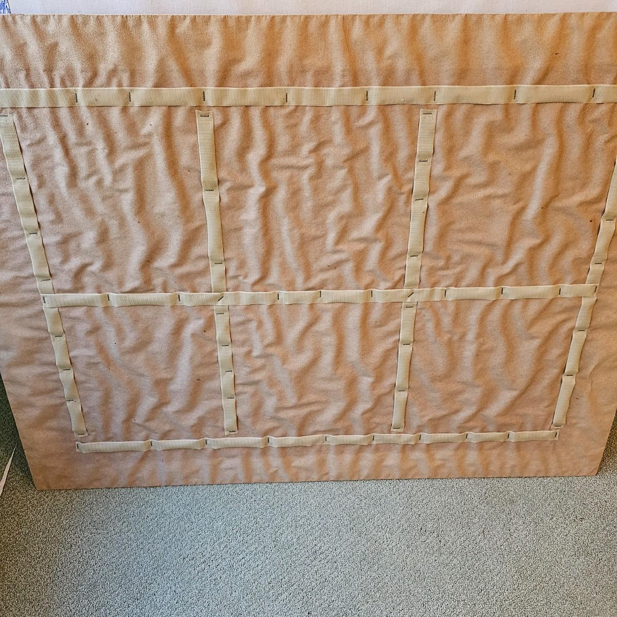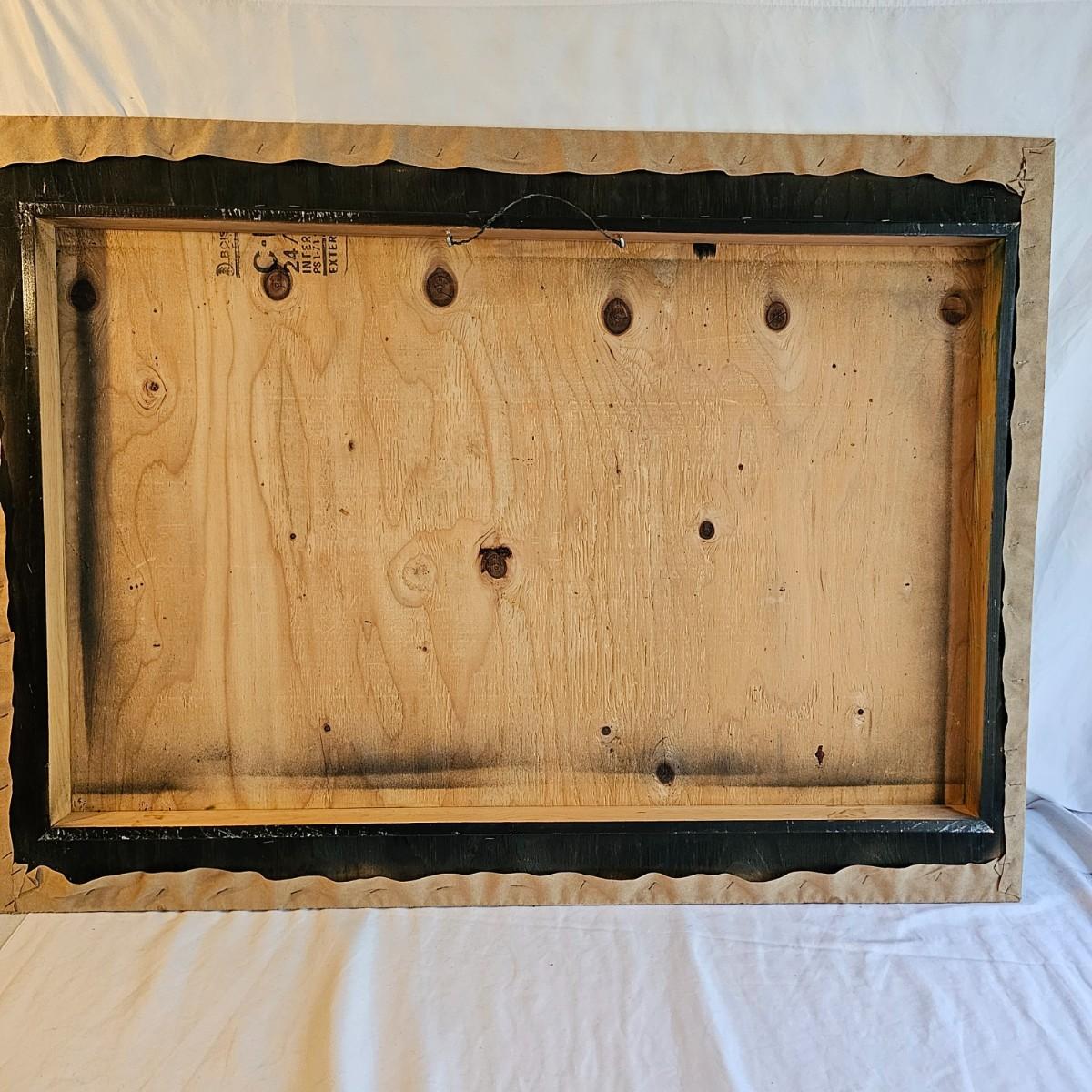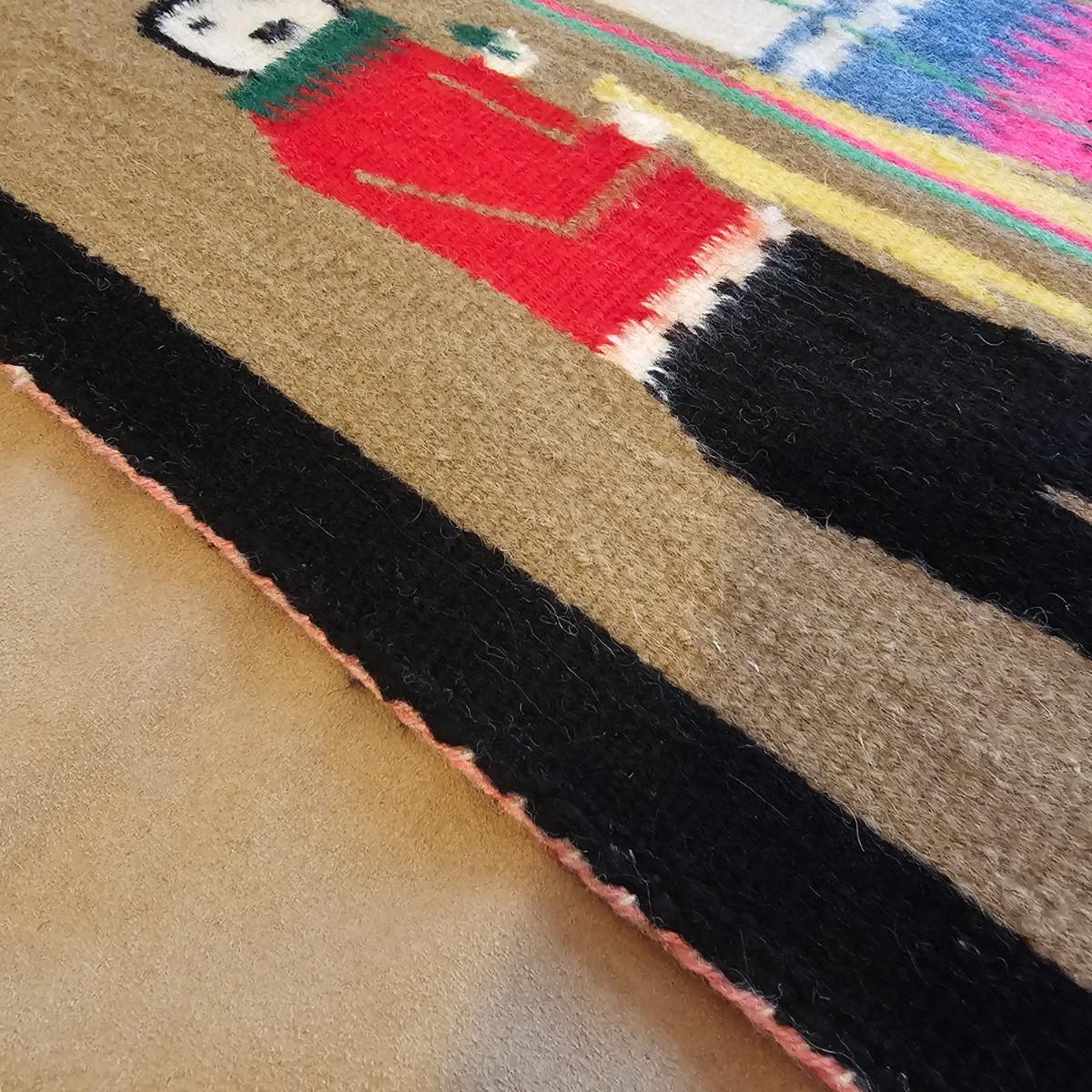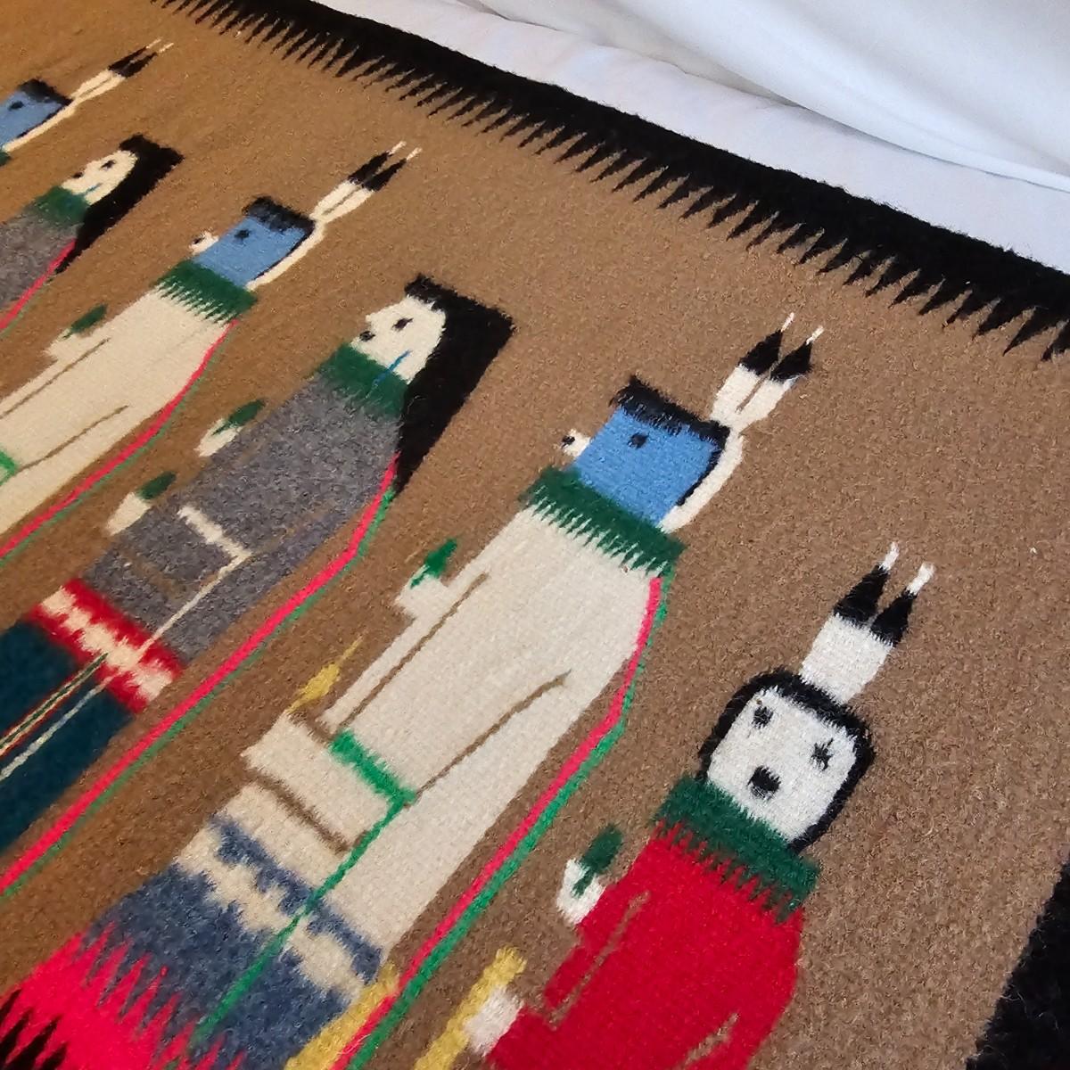 Beautiful Navajo art and design expressed in this rug. Traditional figures march across the surface. Rug is 41.5" x 29" (approximately 3.5' x 2.5'), mounting board is 48" x 2" x 35"H. Rug is secure to board by velcro, can be easily removed. See photos for details. Shipping available.