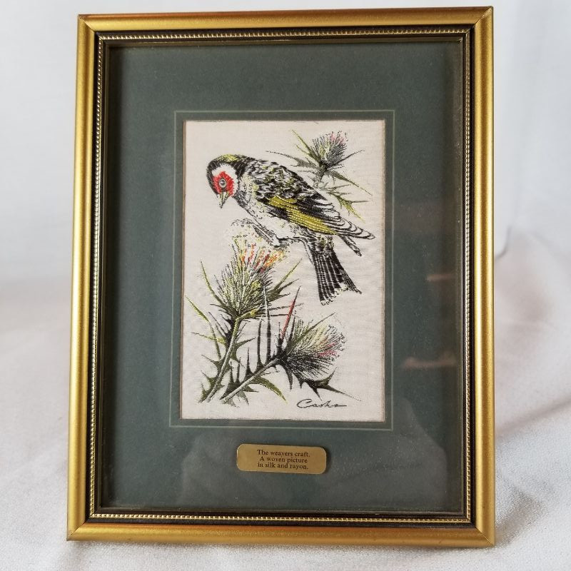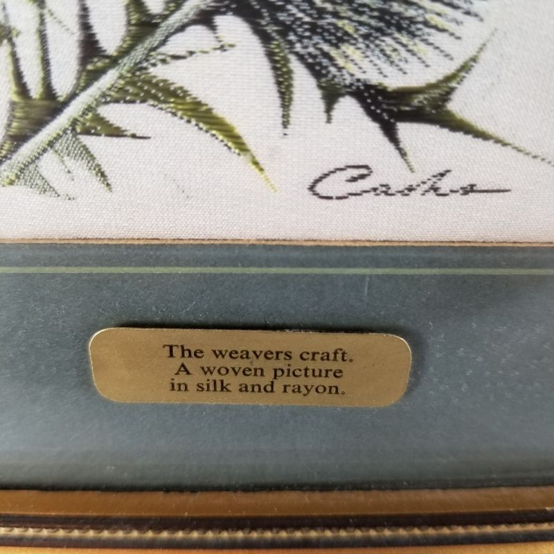 Beautiful bird woven art picture by Cashsa. Woven craft in silk and rayon - nicely framed in a table stand frame. Frame size is 6-inches wide X 7-1/2-inches wide. Something different and beautiful.