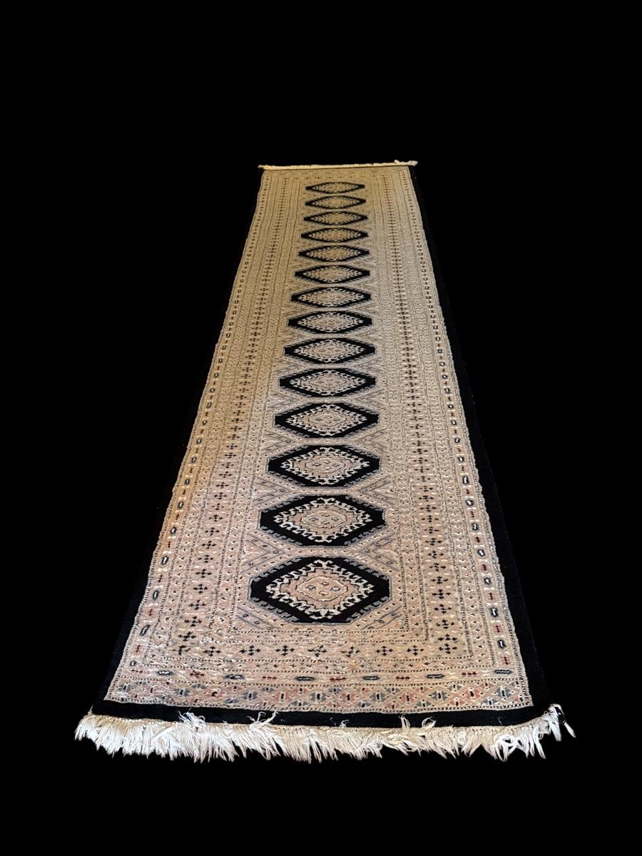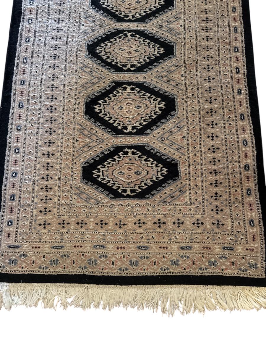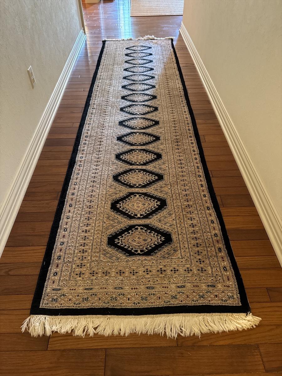 Wool runner rug with traditional Bokhara-style pattern. Hand-knotted with fringe ends. Soft, durable, and perfect for a hallway.