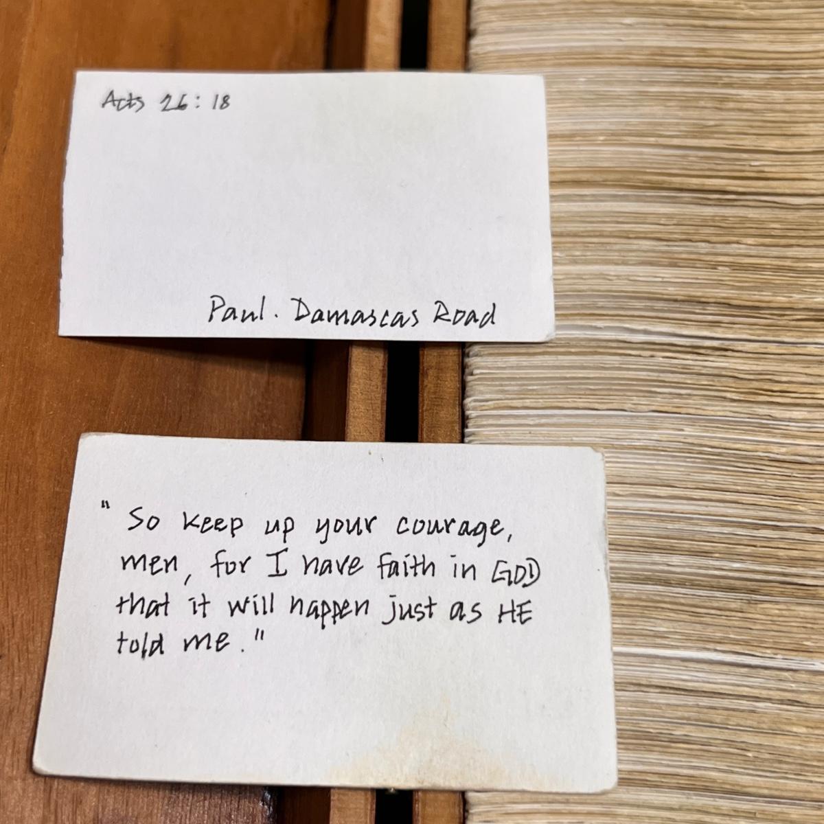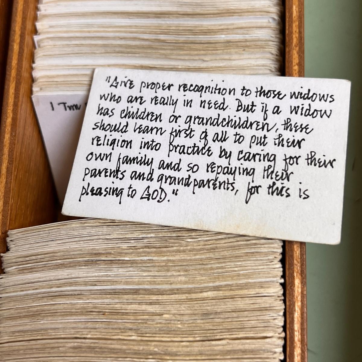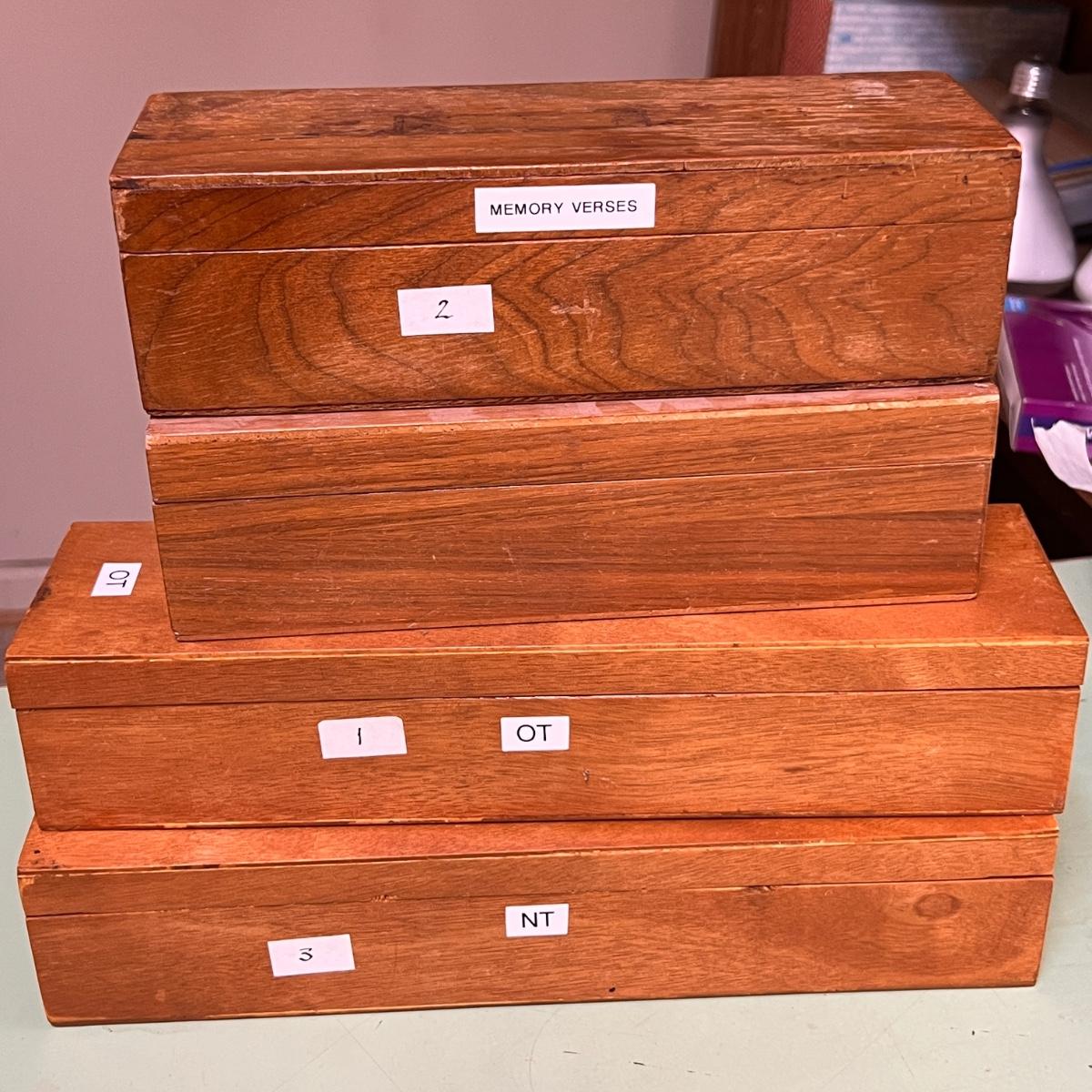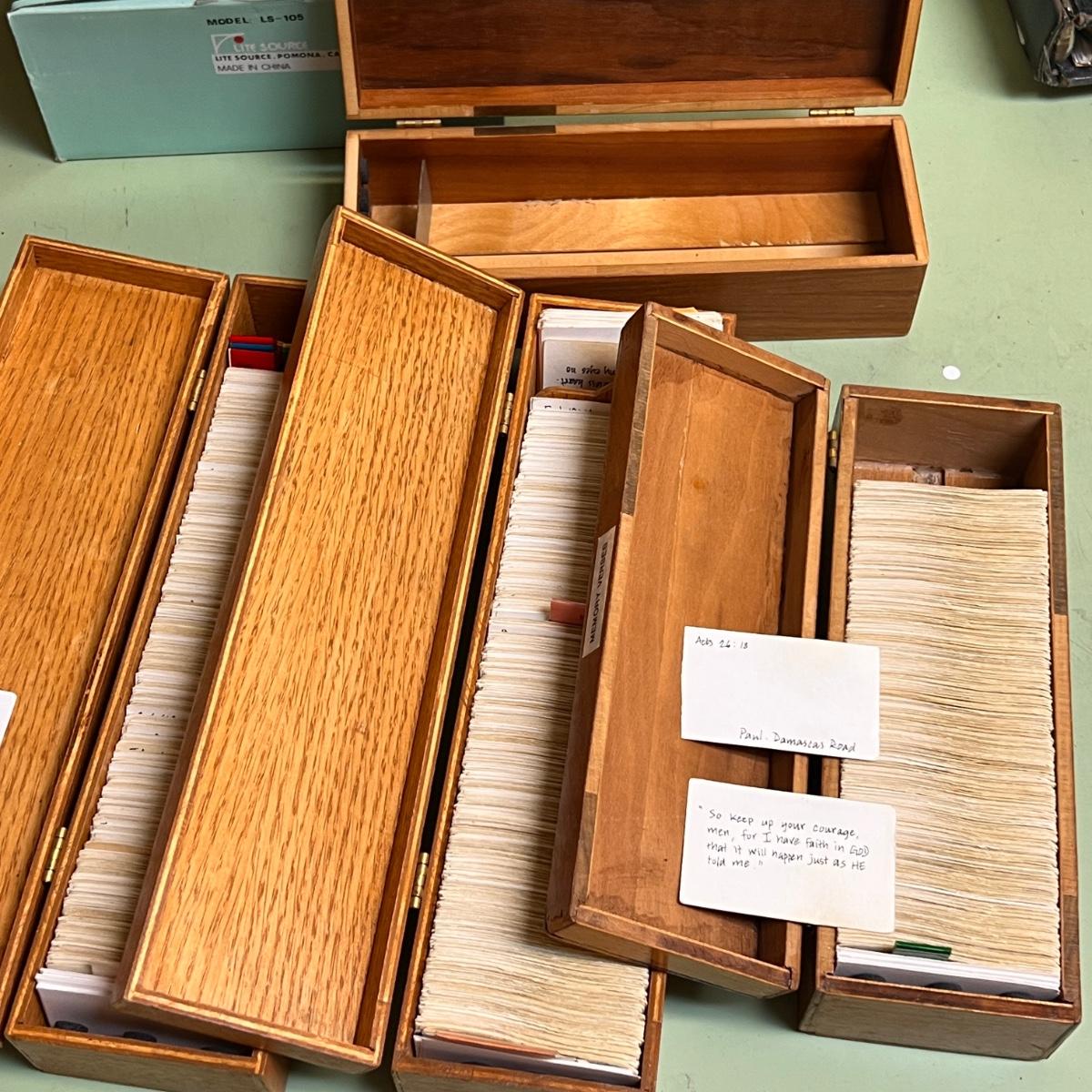 This really is an amazing lot. 100’s of beautifully hand written indexed bible verses on business size cards. 3 wooden boxes full plus one empty wooden box. YOU WILL NOT FIND THESE ANYWHERE ELSE.