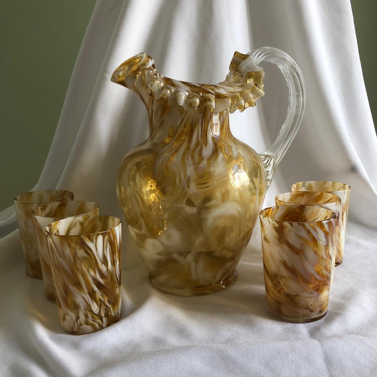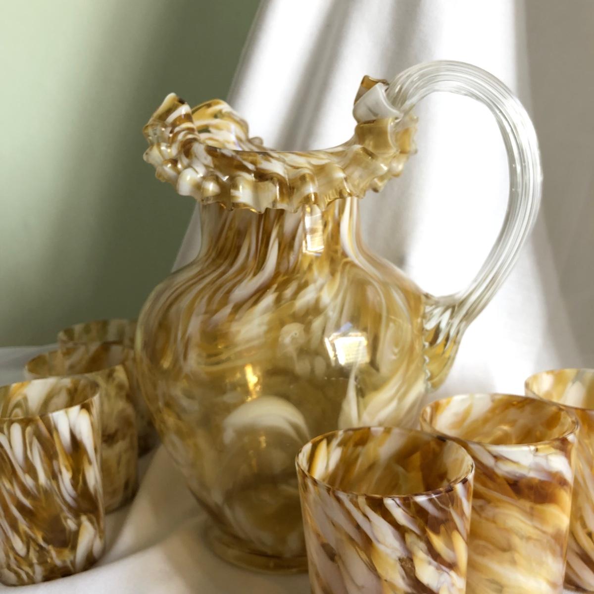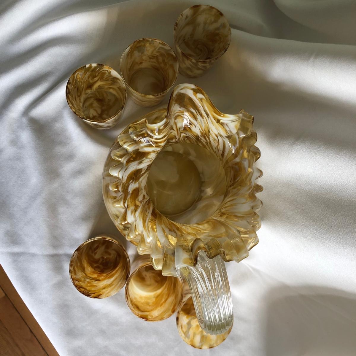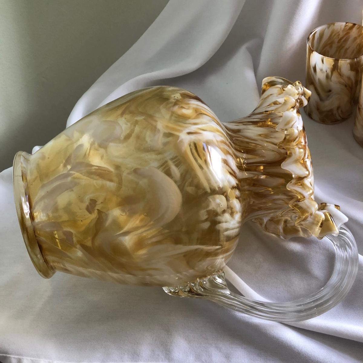 Swirls of yellow amber and white handblown glass make this pitcher and 11 cup matching set unique. The pitcher measures 9” x 10” x 6.5”, and each cup is 2.5” x 3.75” x 2.75”. Shipping available.
