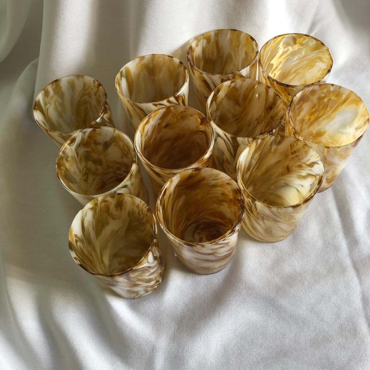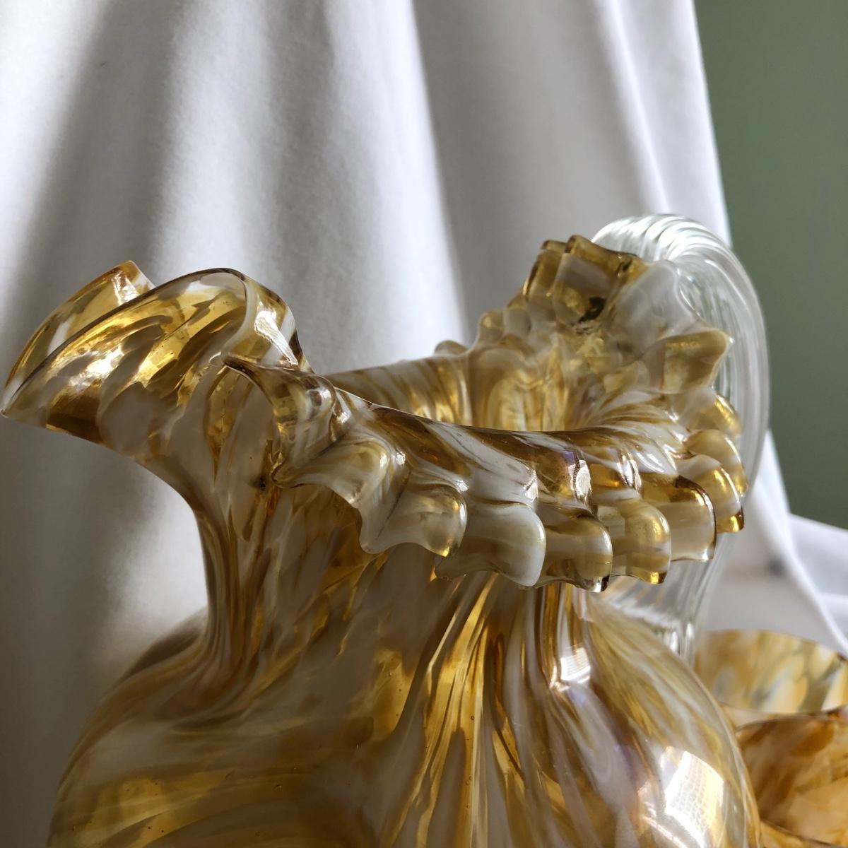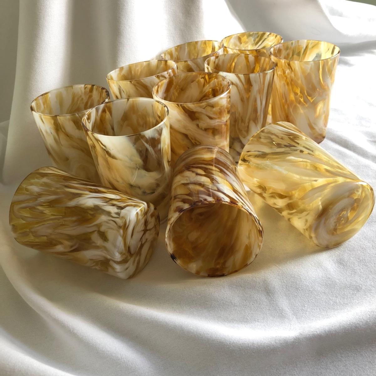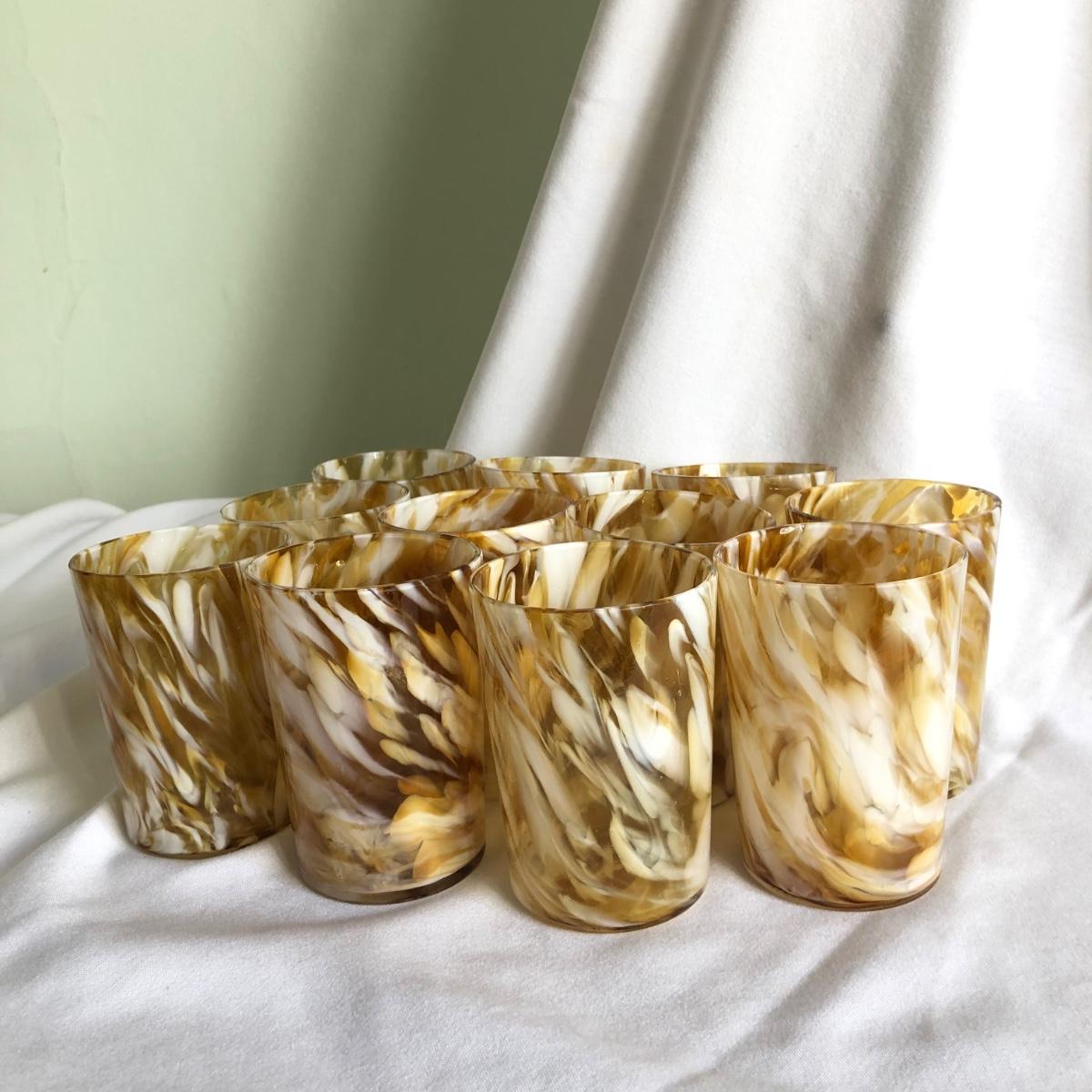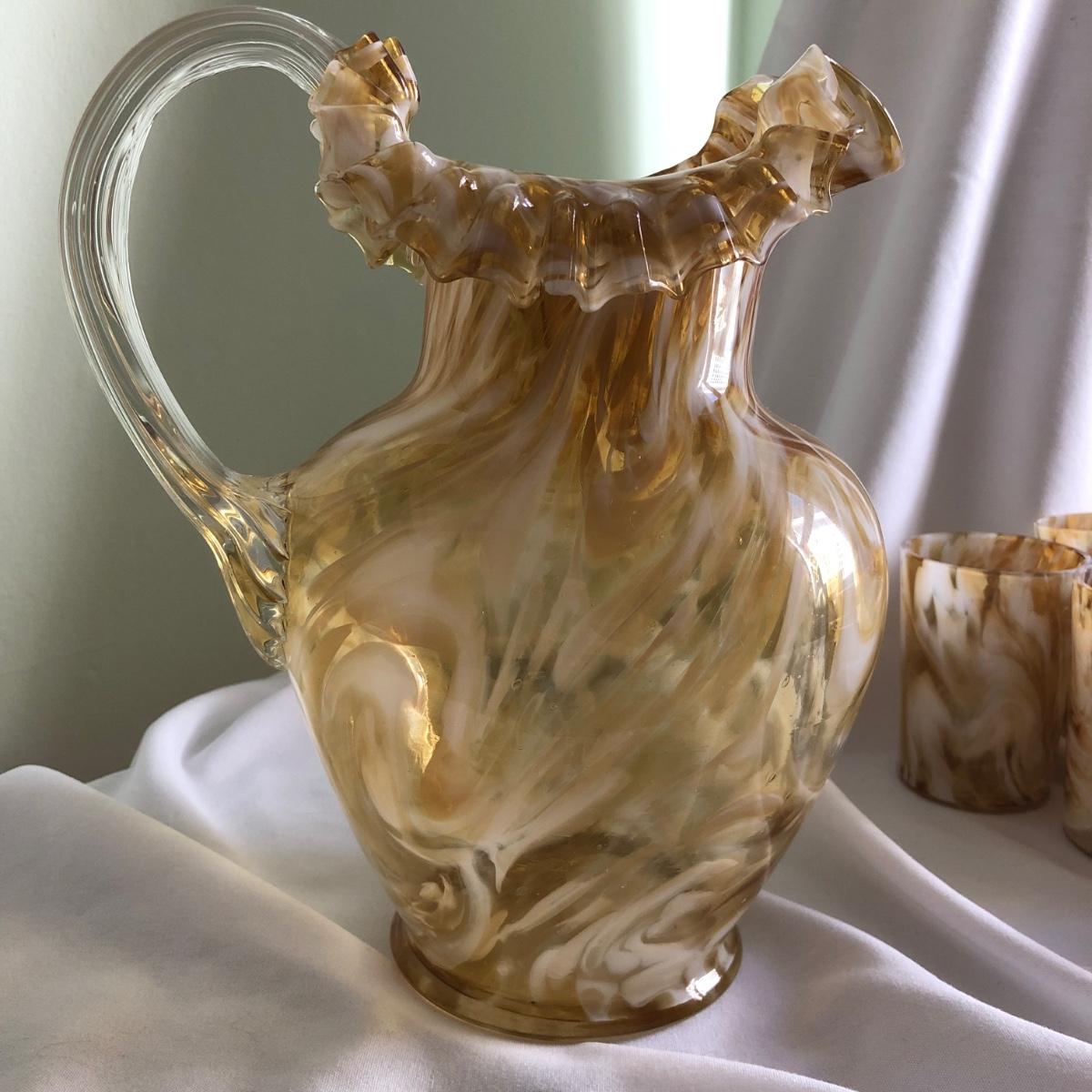 Swirls of yellow amber and white handblown glass make this pitcher and 11 cup matching set unique. The pitcher measures 9” x 10” x 6.5”, and each cup is 2.5” x 3.75” x 2.75”. Shipping available.