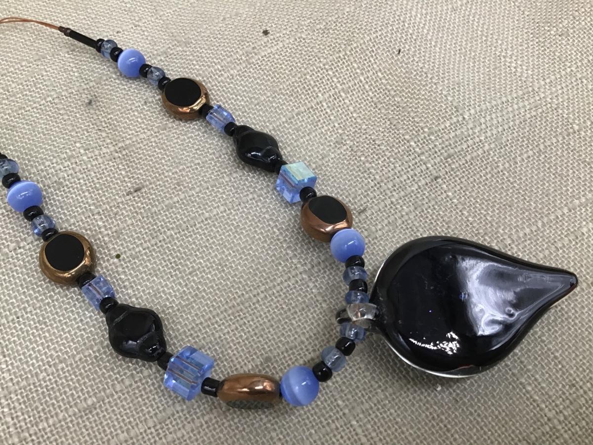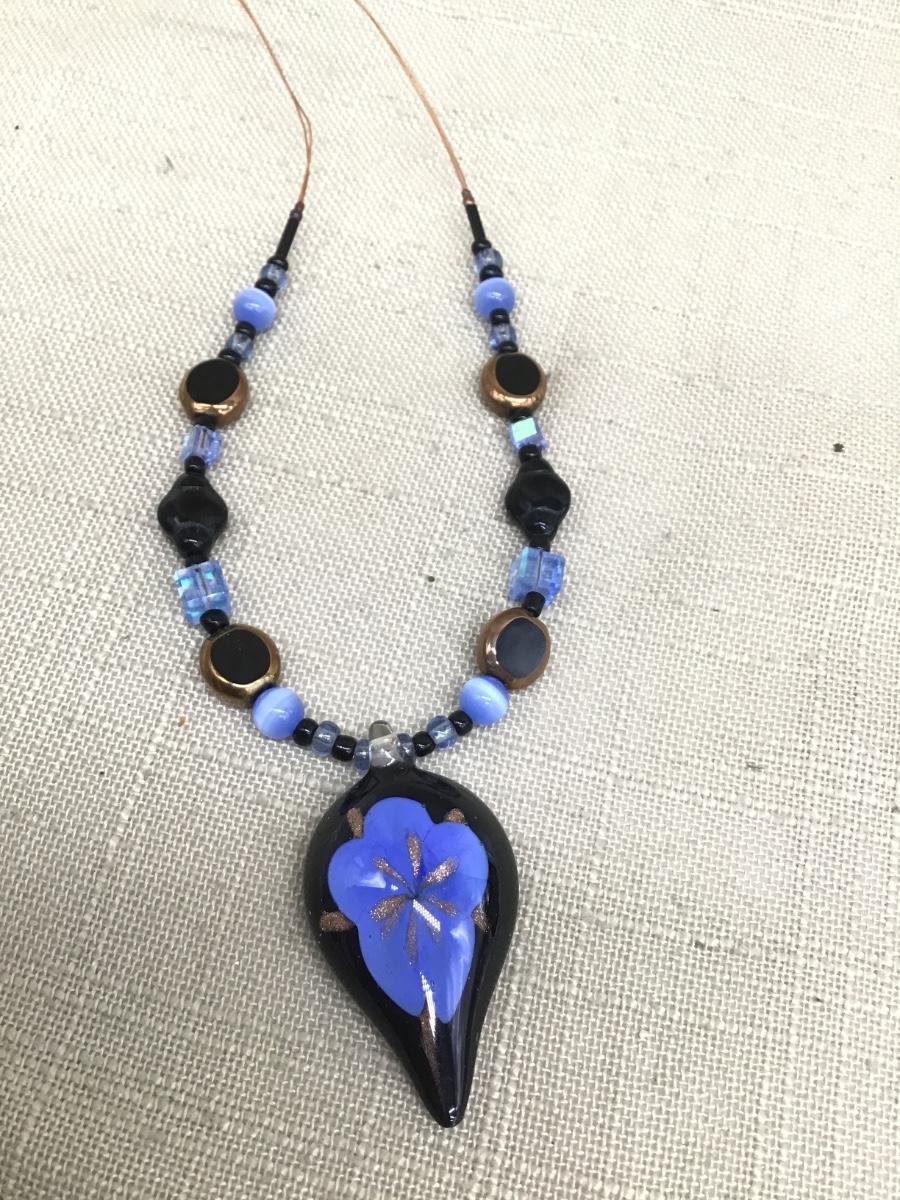 Handblown Art Glass Blue Flower Pendant Black background Necklace