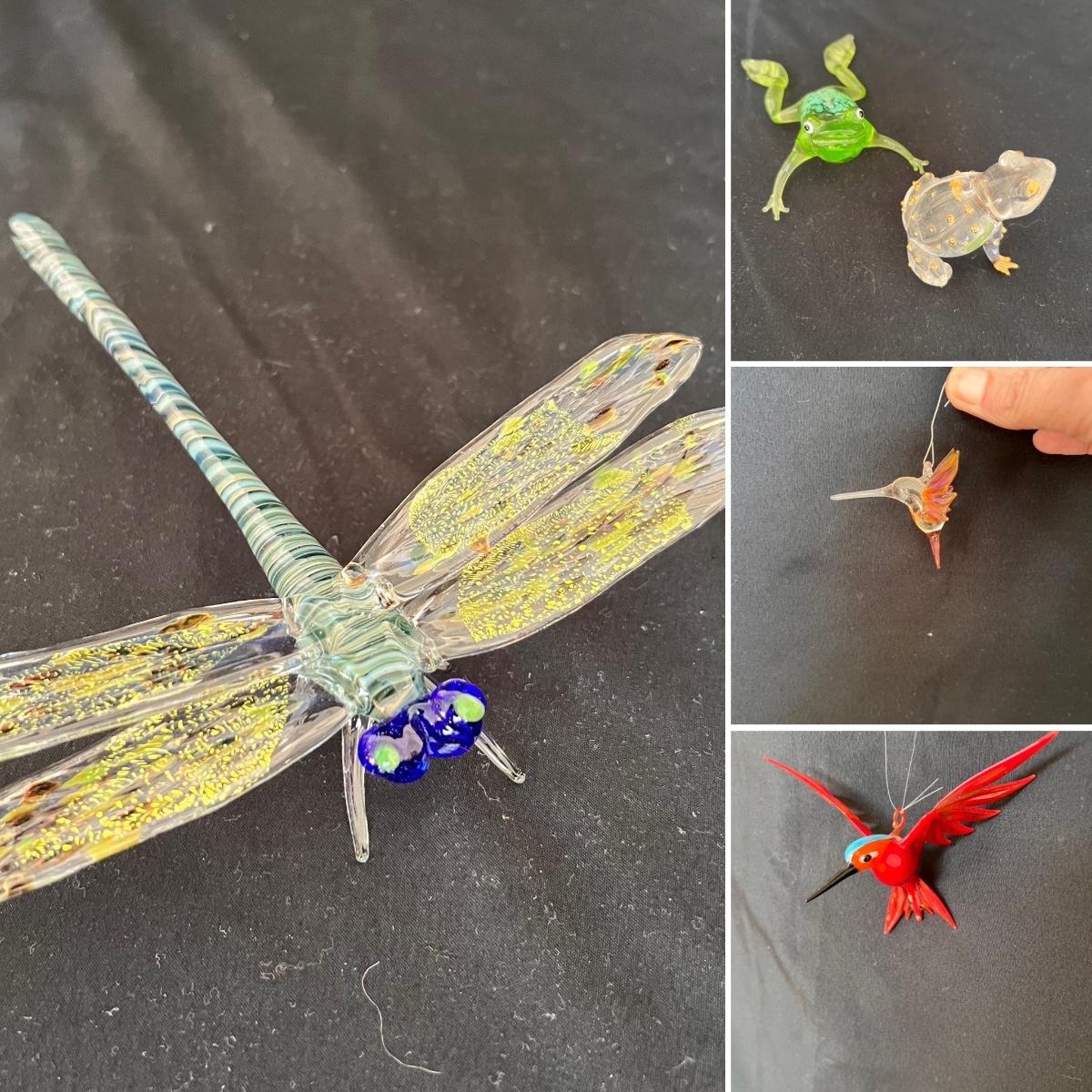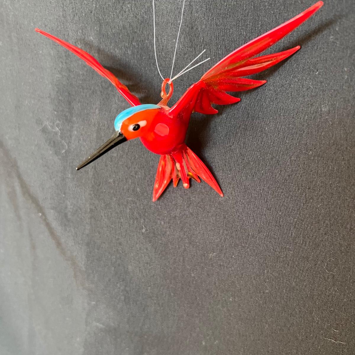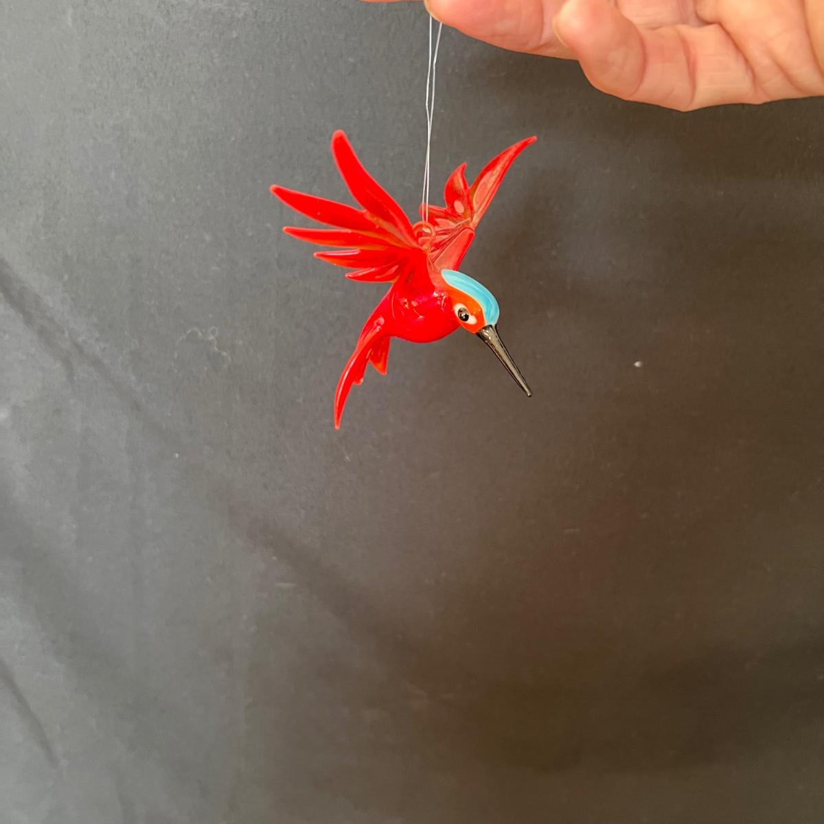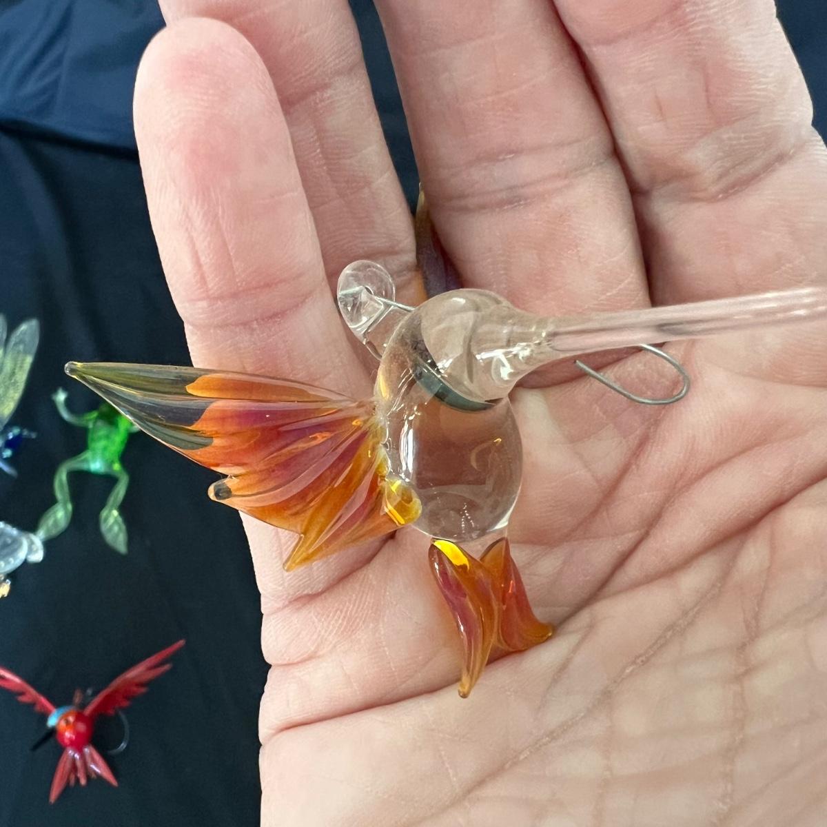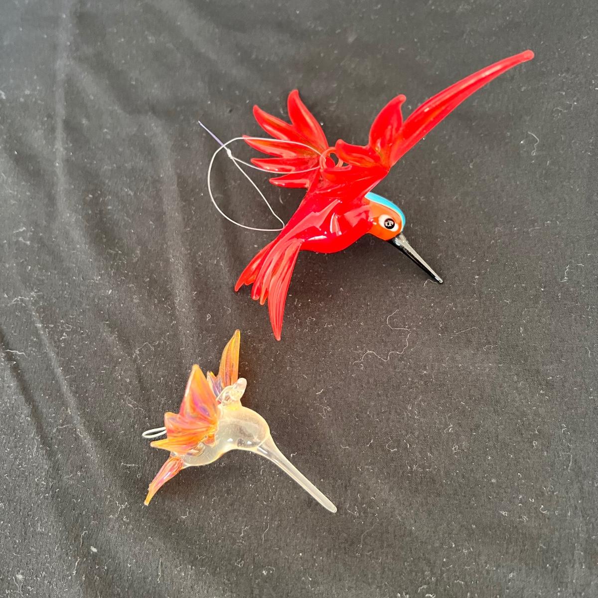 Five glass items, no markings found. The two hummingbirds are set up to hang.