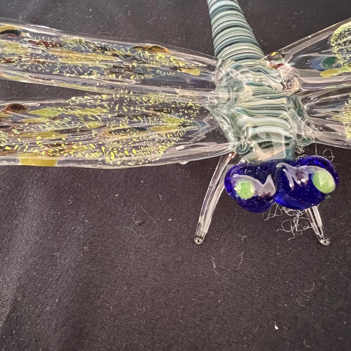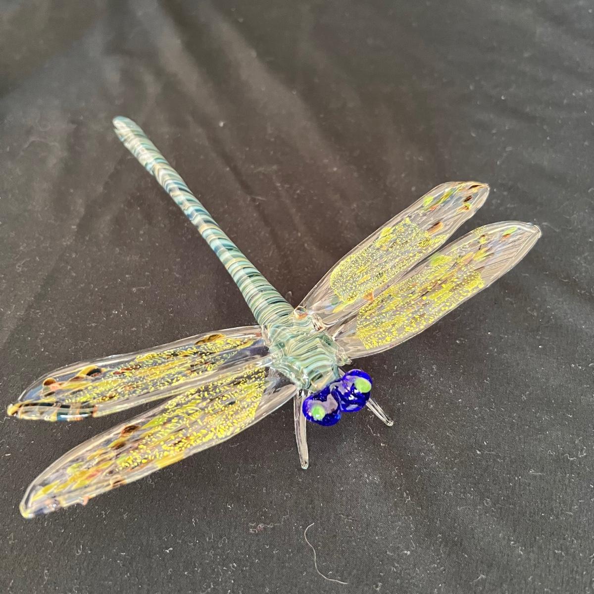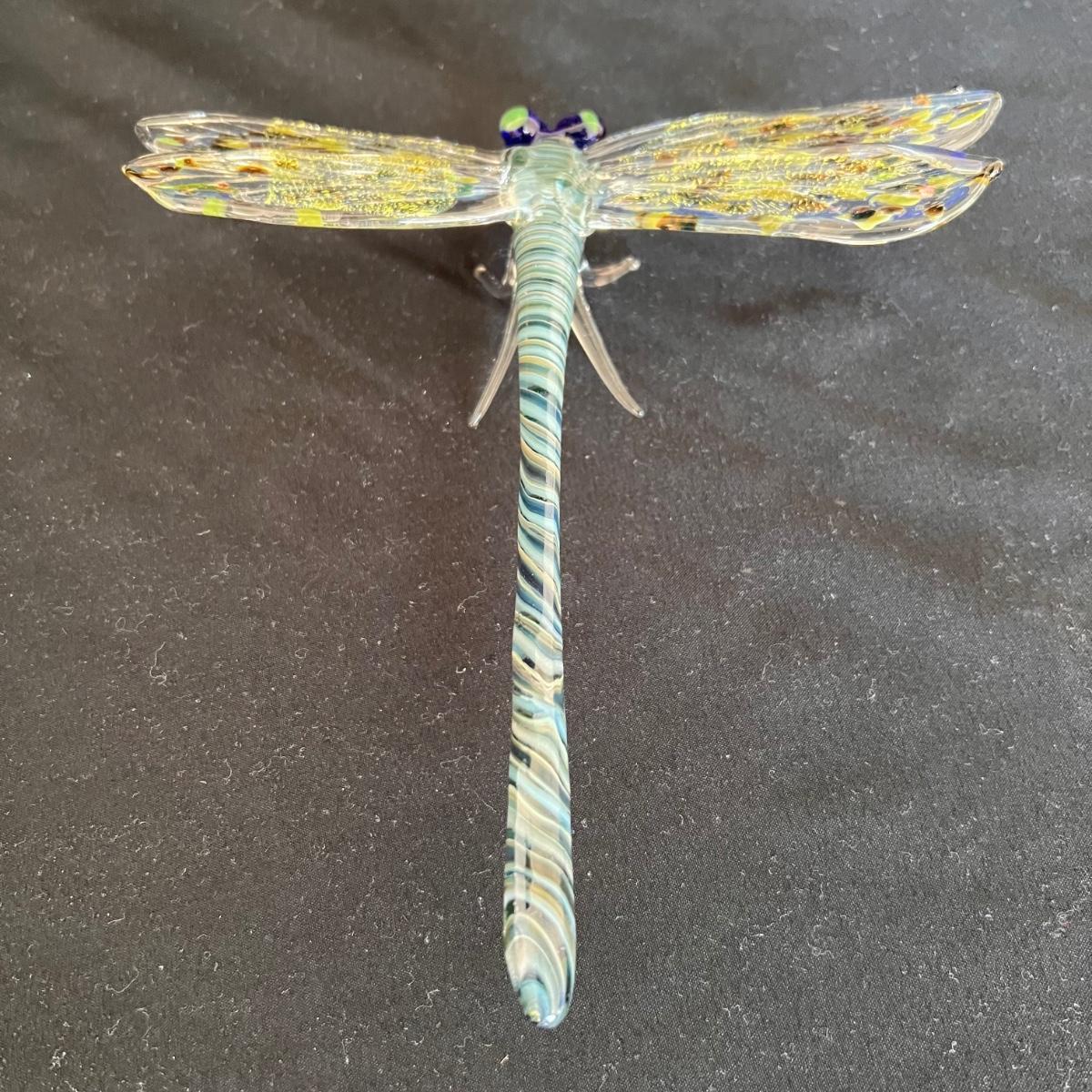 The Dragonfly appears to be hand blown and measures 8” x 6” x 1”H.