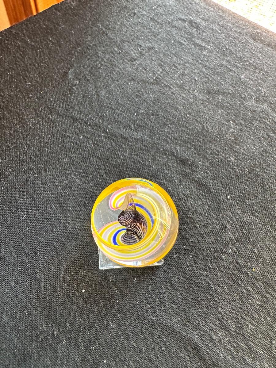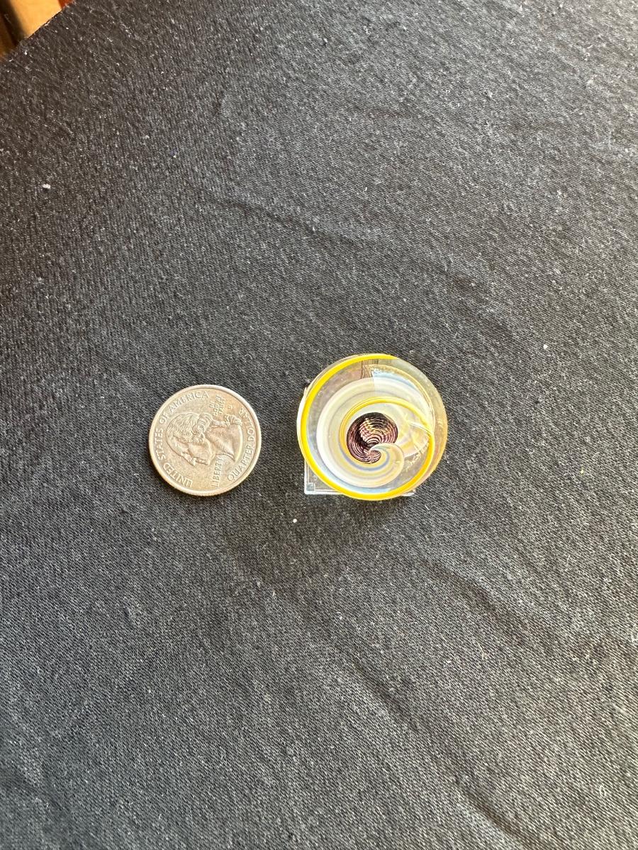 HANDBLOWN GLASS MARBLE WITH INTERNAL SWIRL WITHIN A MULTICOLORED LATTICINO SWIRL