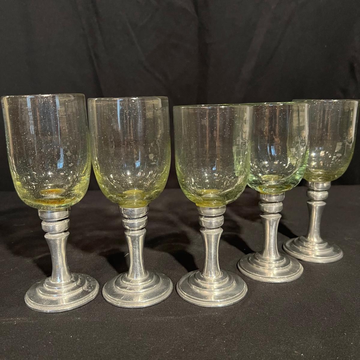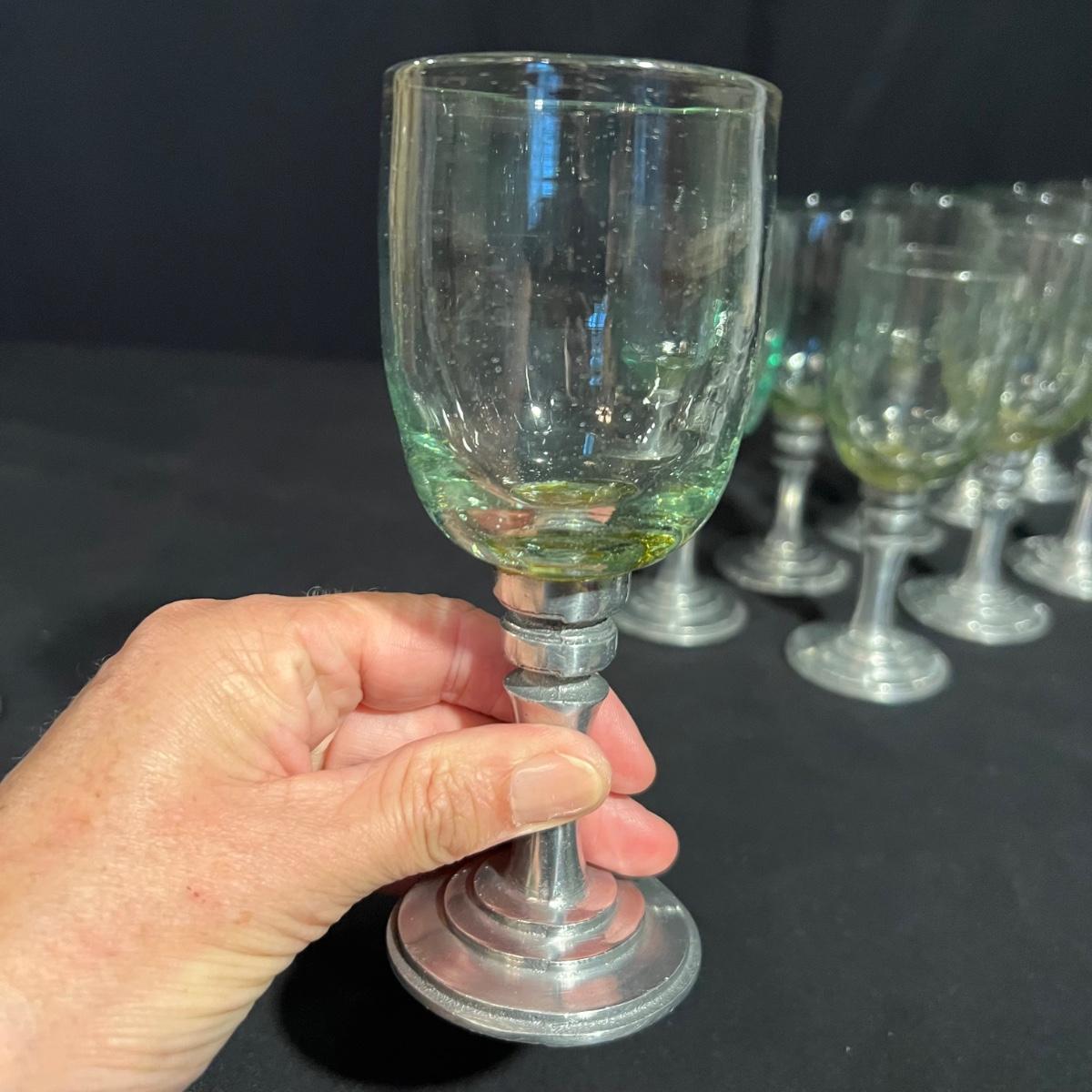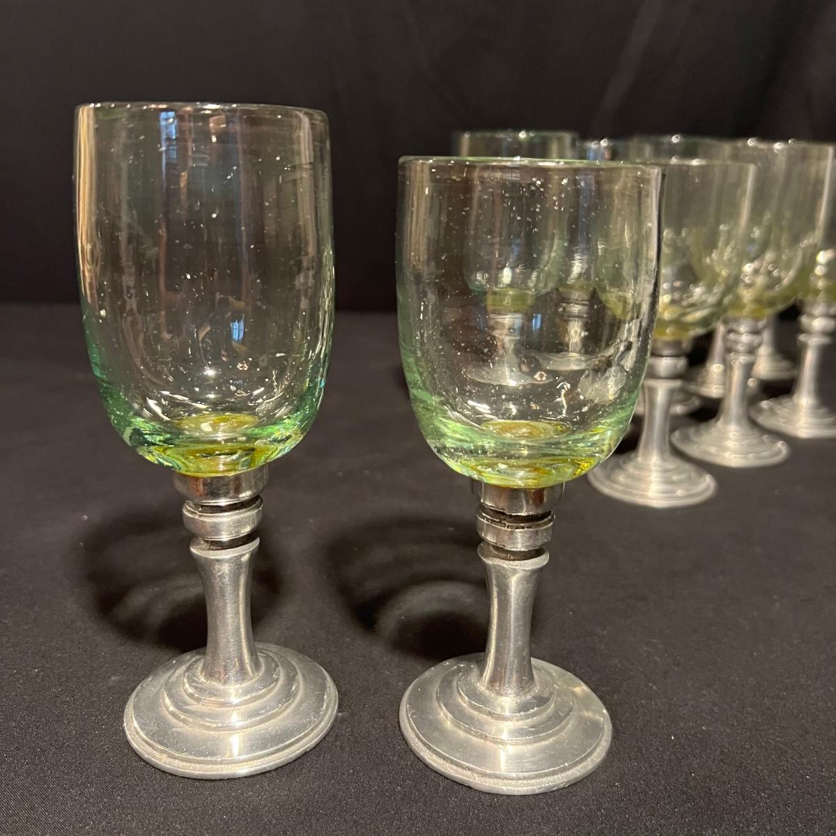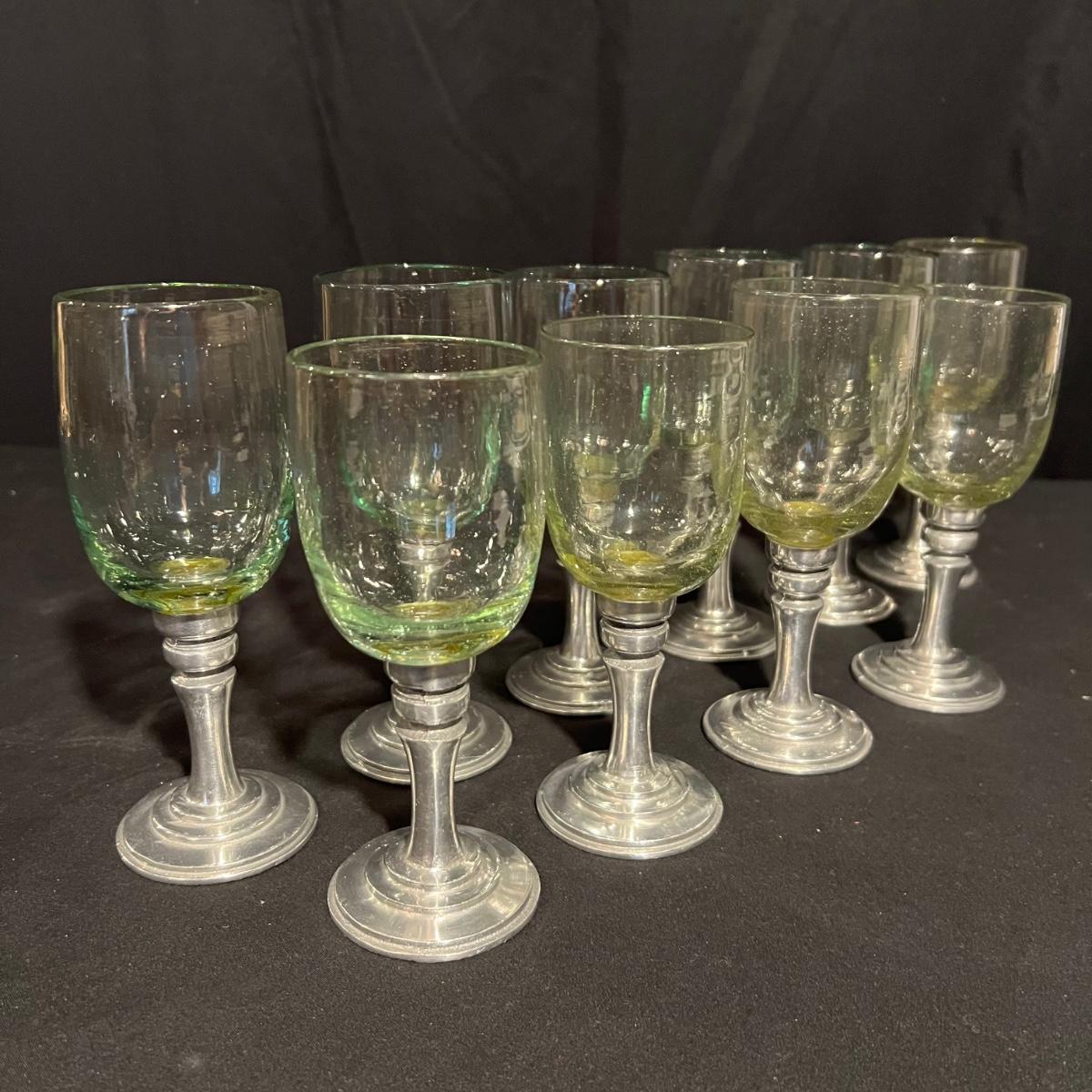 Ten wine glasses all have what appears to be pewter bases and stems. The glass appears to be hand blown. The five tallest glasses all match and have a bottle green tint to the glass. The other five have more of a yellow tint and slight variation in height; three shortest are all 6”H with the other two being approximately half an inch taller.
