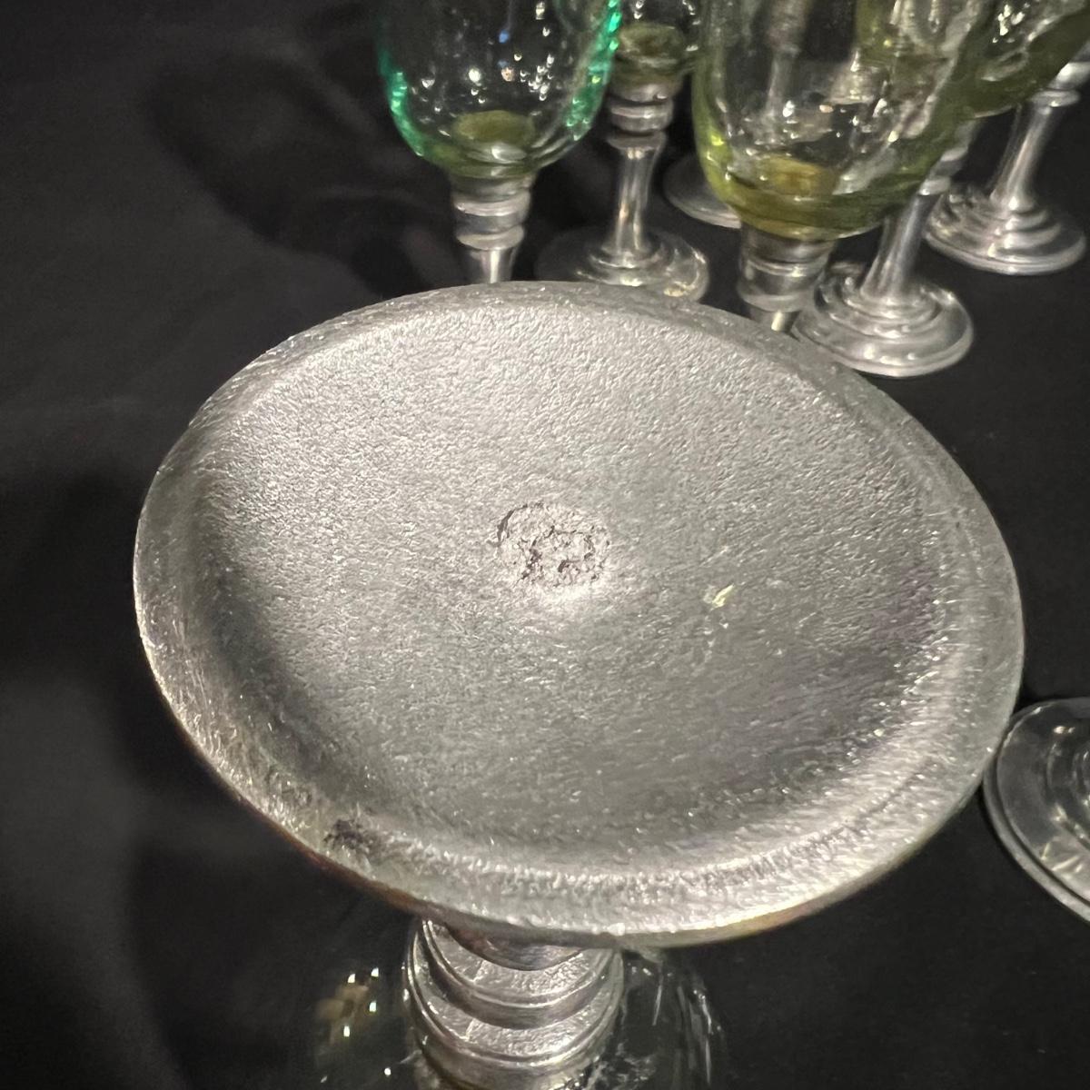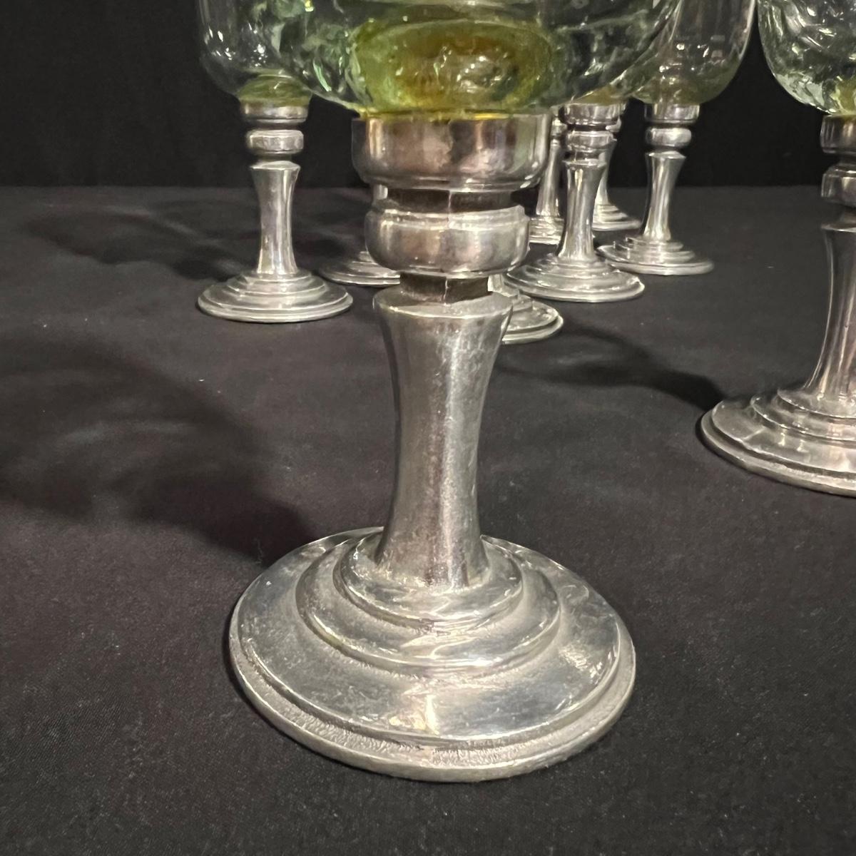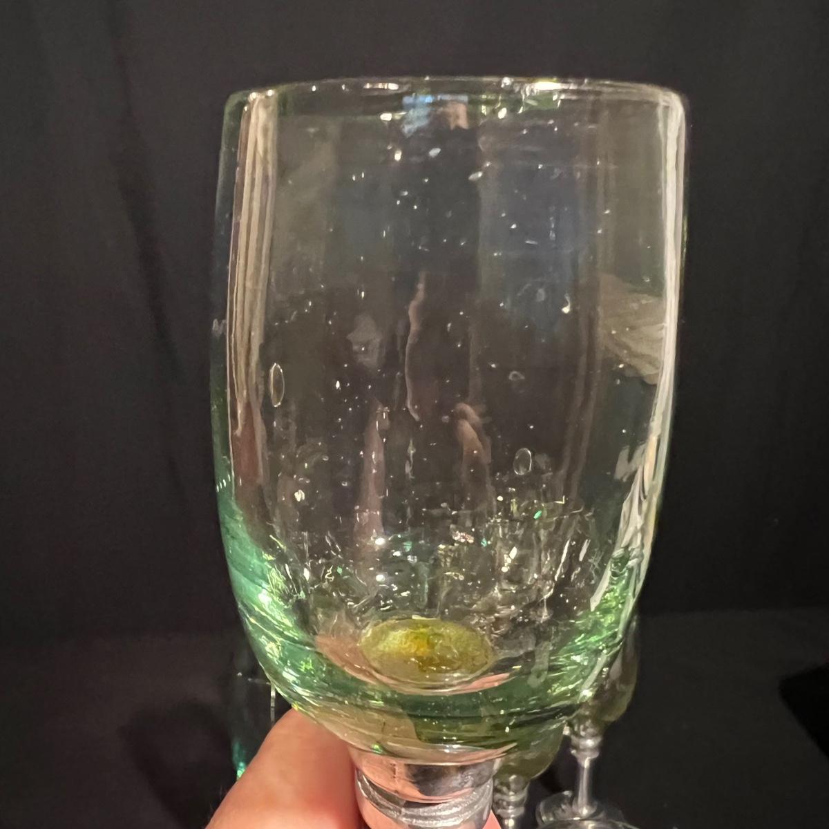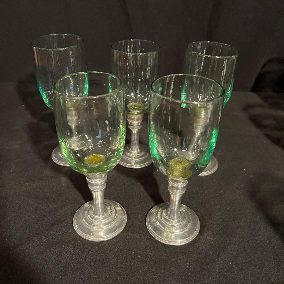 Ten wine glasses all have what appears to be pewter bases and stems. The glass appears to be hand blown. The five tallest glasses all match and have a bottle green tint to the glass. The other five have more of a yellow tint and slight variation in height; three shortest are all 6”H with the other two being approximately half an inch taller.
