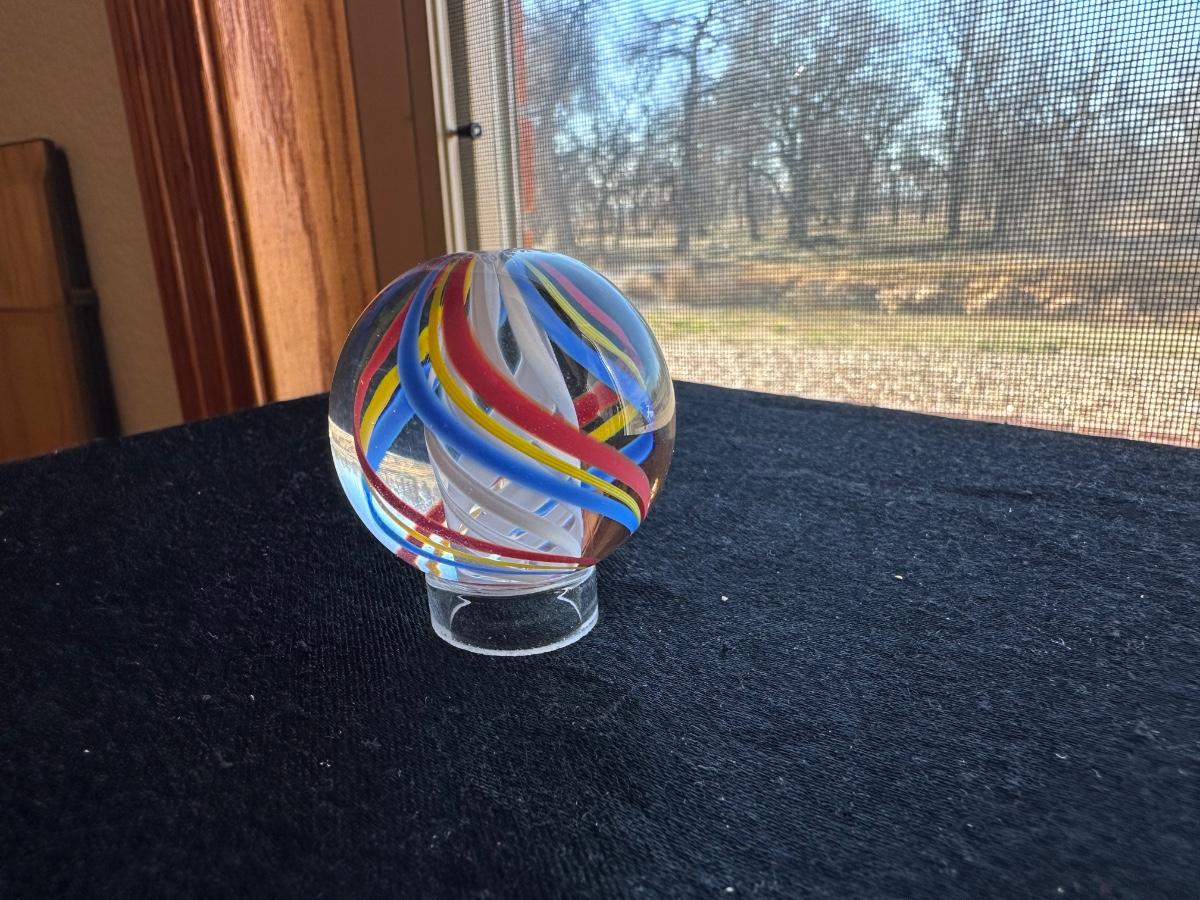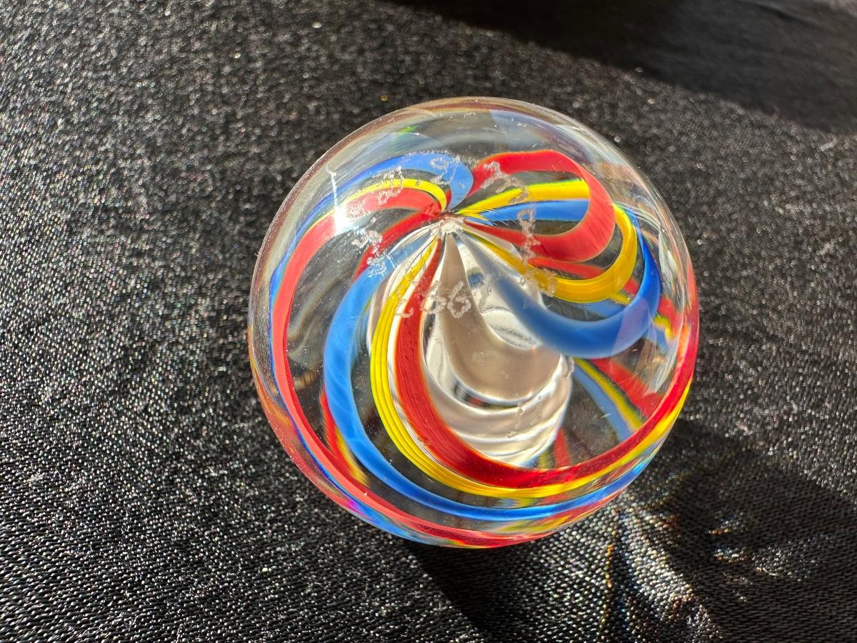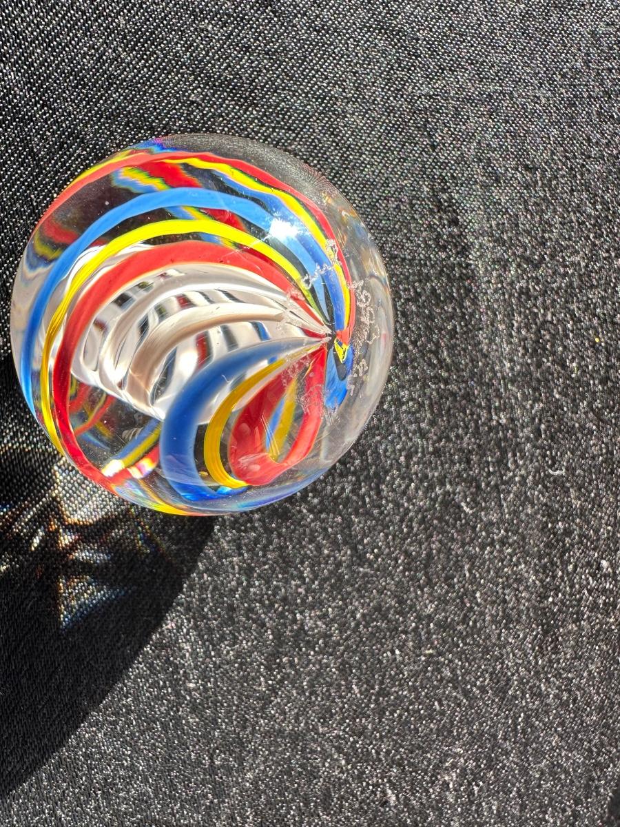 SIGNED HANDBLOWN SHRUNKEN WHITE LATTICINO SWIRL WITHIN MULTICOLORED RIBBONS