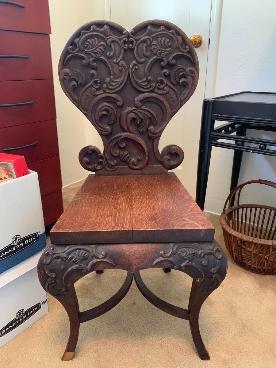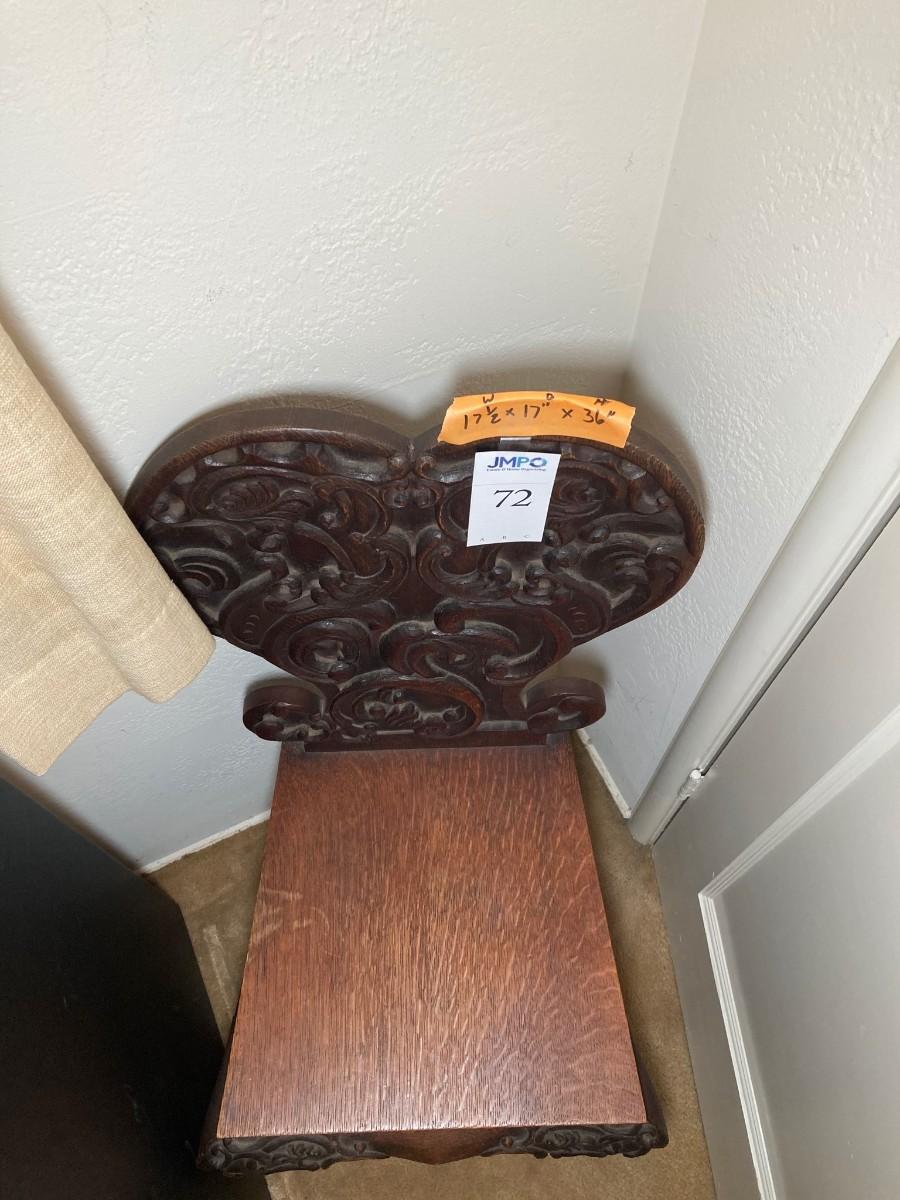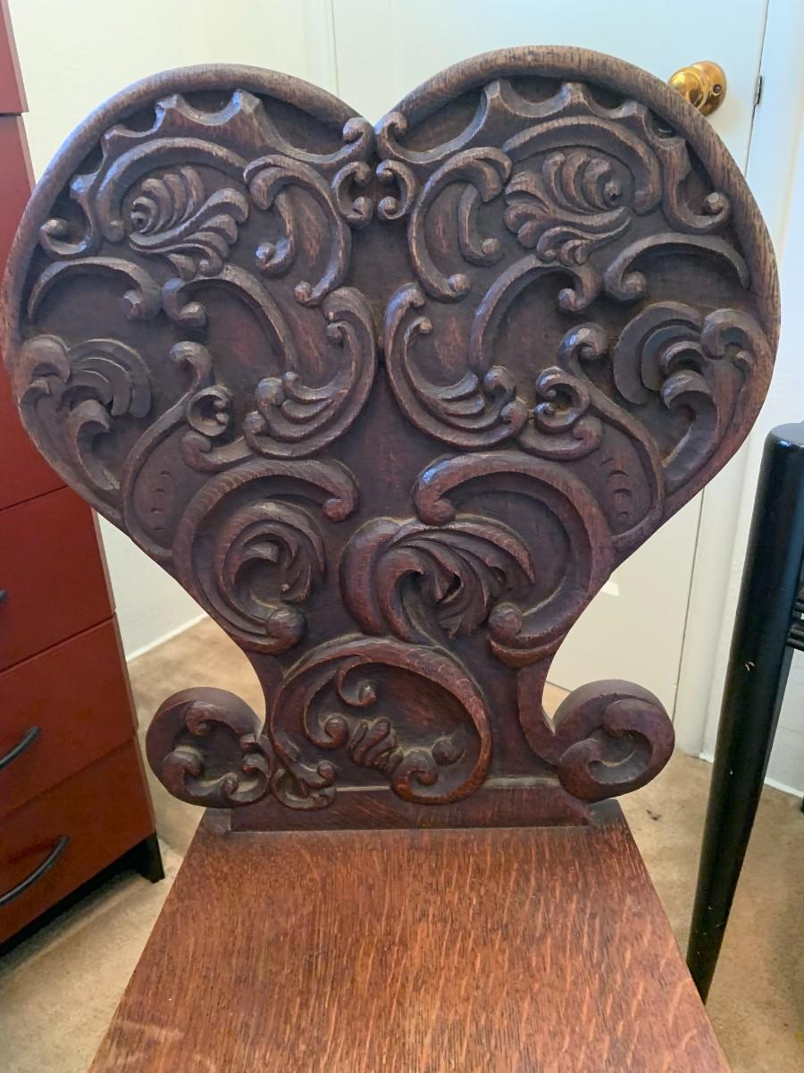 Heart shape back, 17 1/2" x 17" x 36". Nicks, water stain on seat