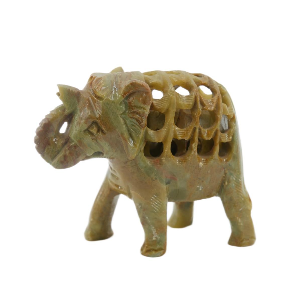 Two hand-carved stone elephant figurines with miniature elephants inside each. Made in India, each measures approximately 3.5" x 2" x 3", total weight is 1 lb. No issues found.
