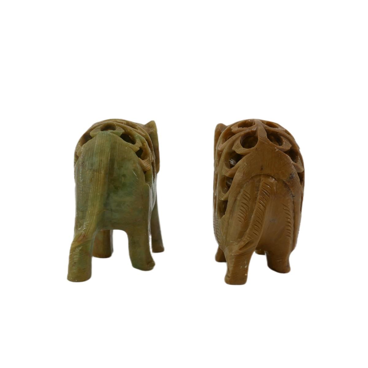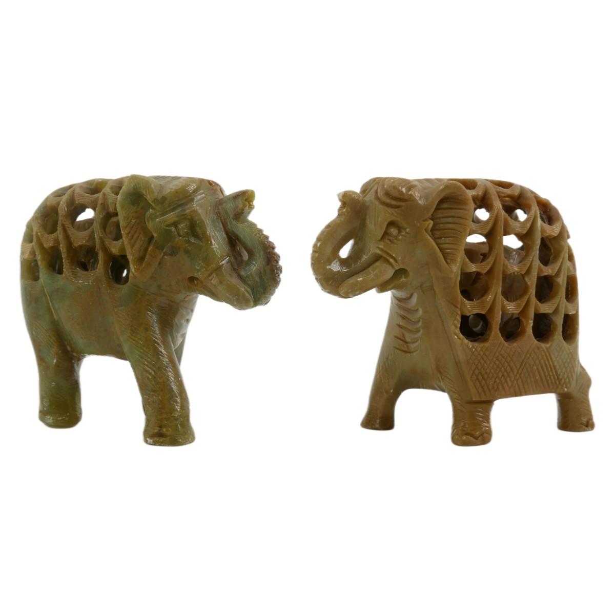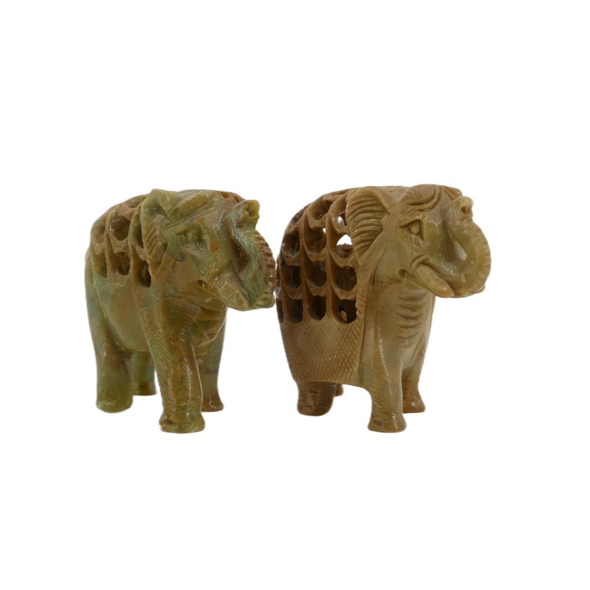 Two hand-carved stone elephant figurines with miniature elephants inside each. Made in India, each measures approximately 3.5" x 2" x 3", total weight is 1 lb. No issues found.