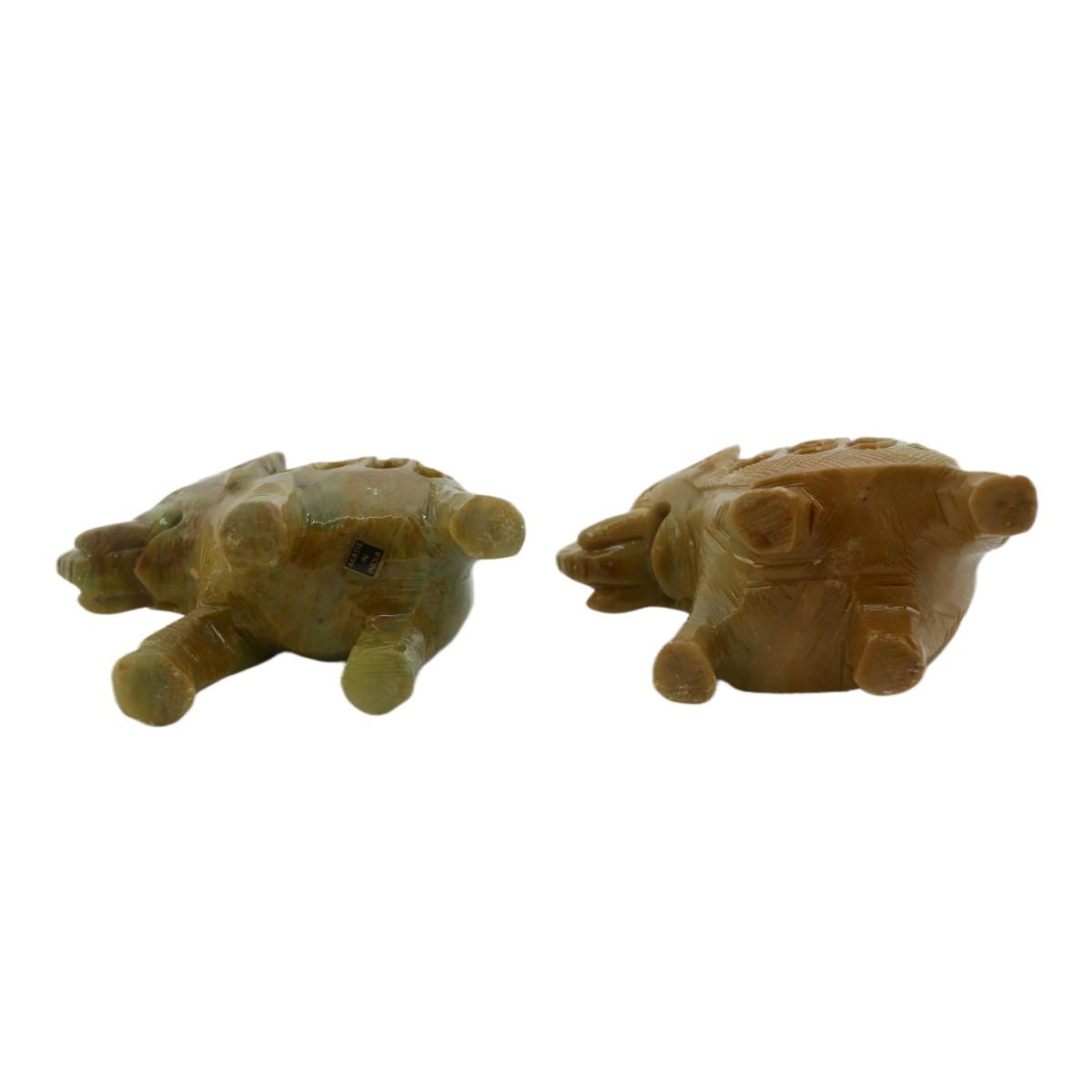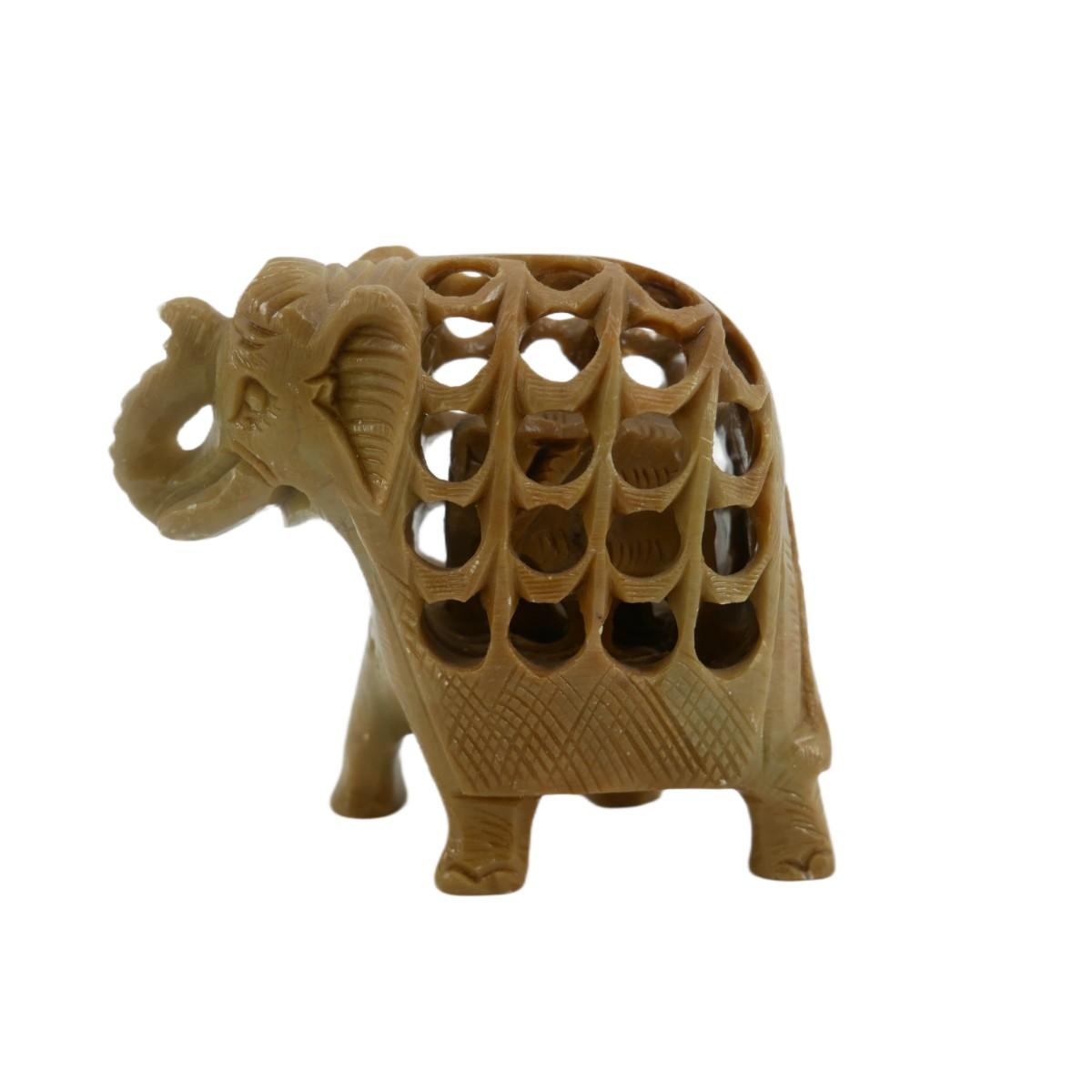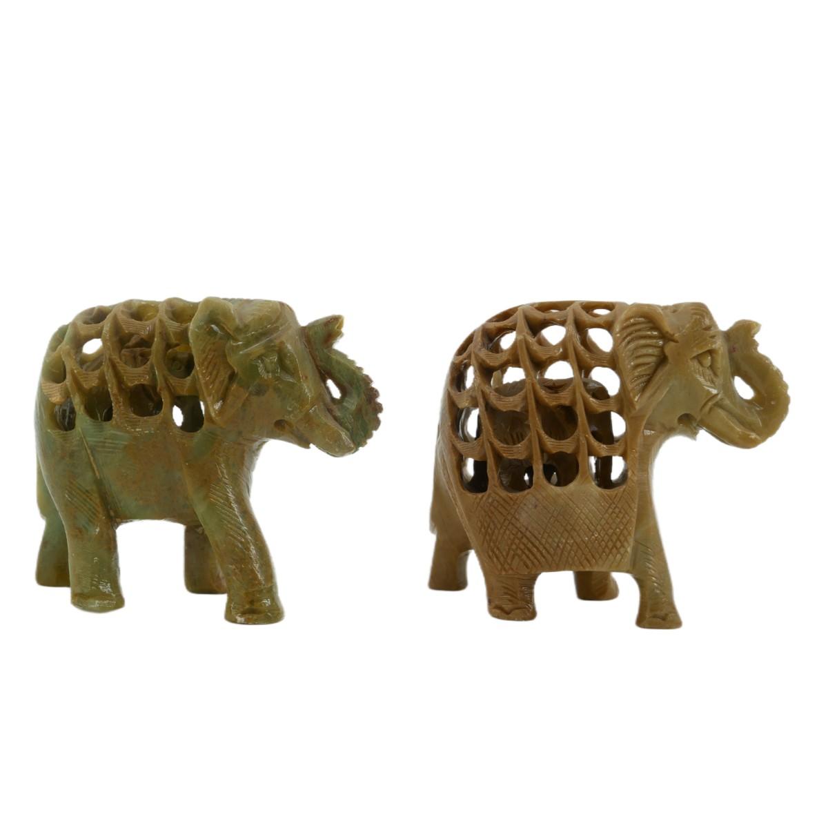 Two hand-carved stone elephant figurines with miniature elephants inside each. Made in India, each measures approximately 3.5" x 2" x 3", total weight is 1 lb. No issues found.