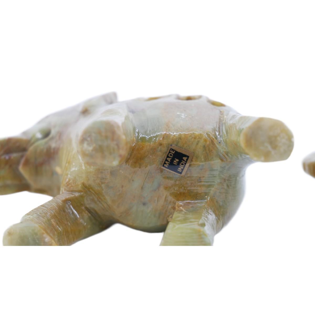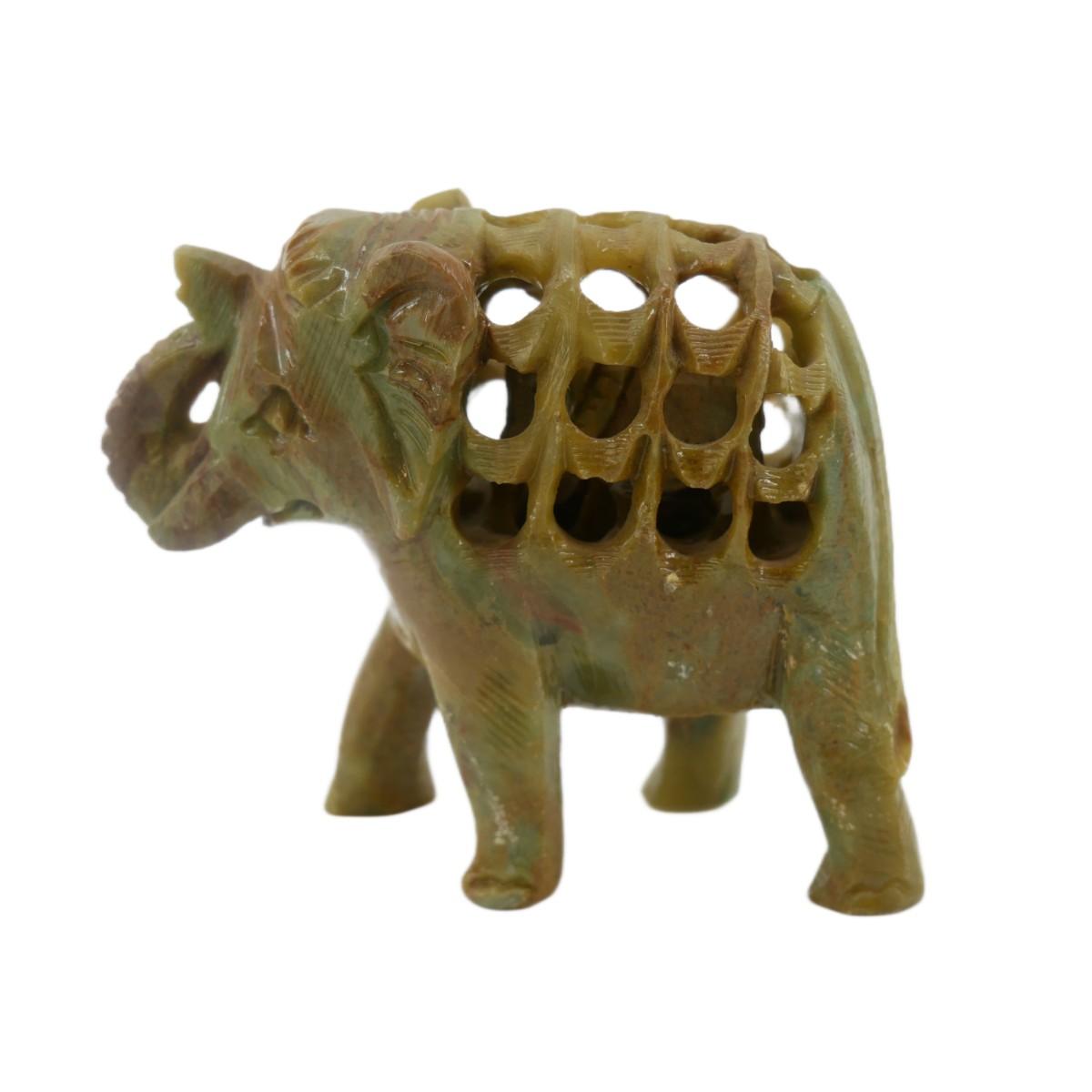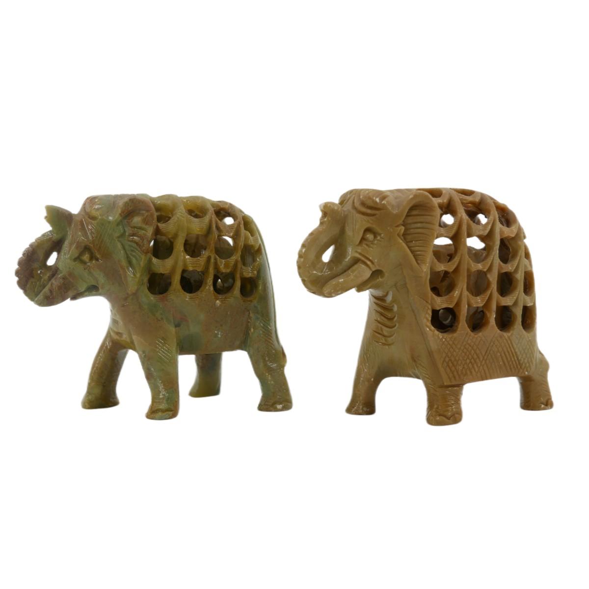 Two hand-carved stone elephant figurines with miniature elephants inside each. Made in India, each measures approximately 3.5" x 2" x 3", total weight is 1 lb. No issues found.