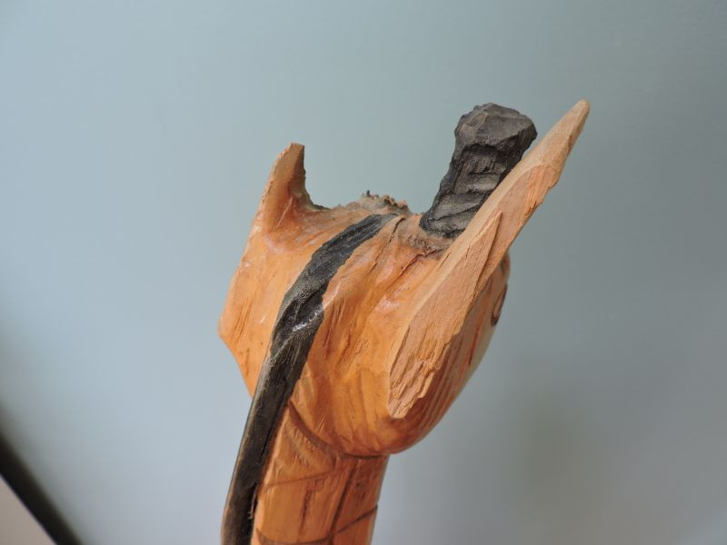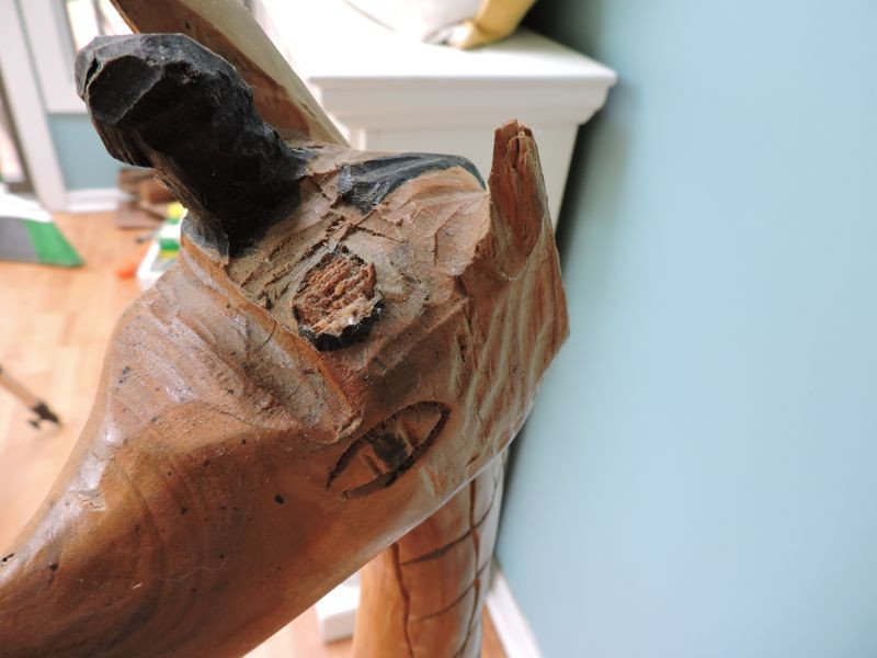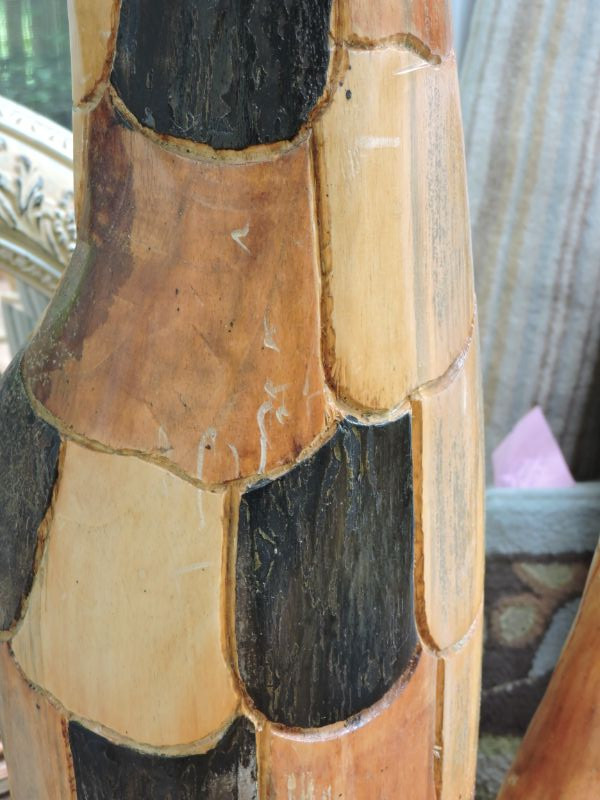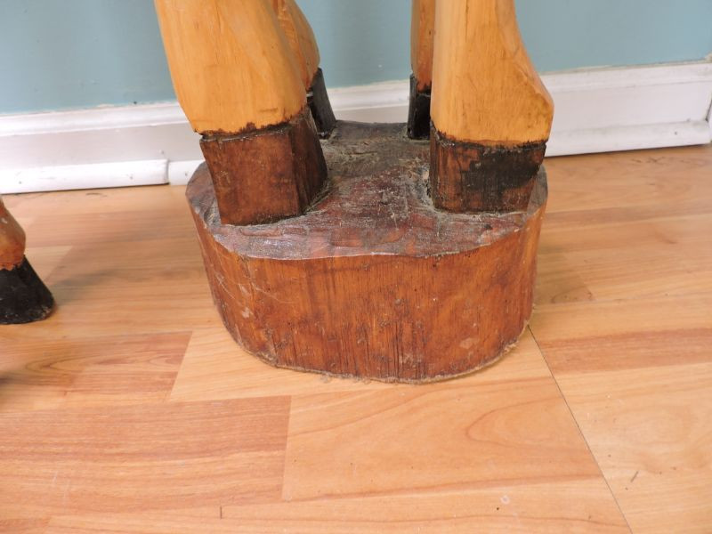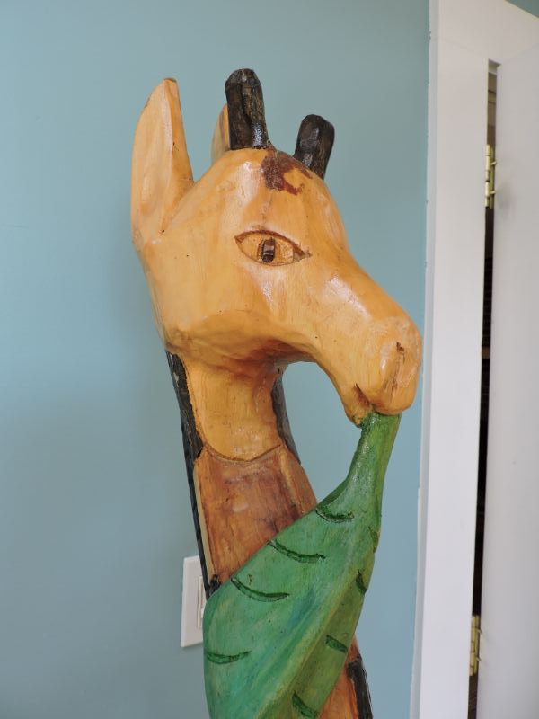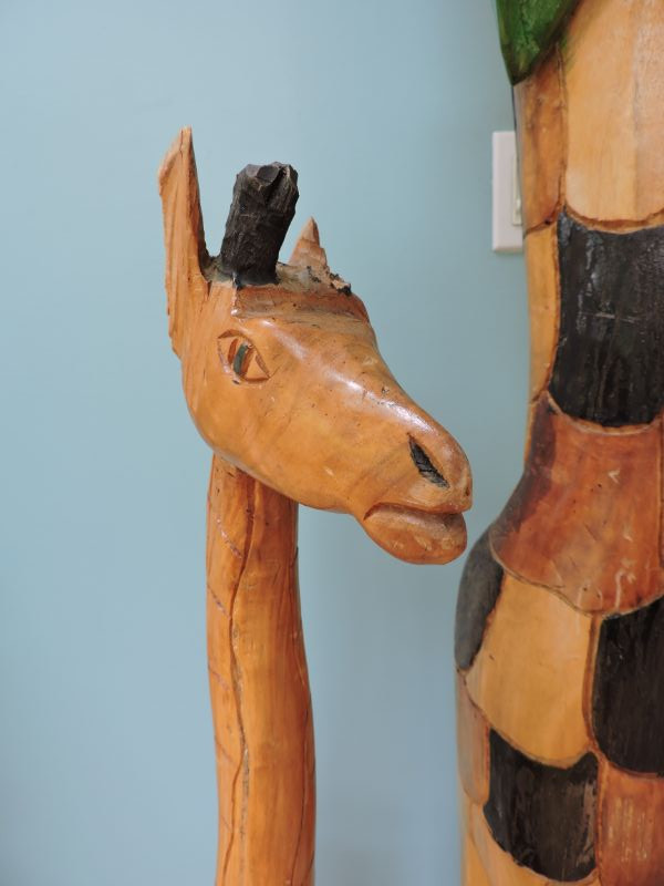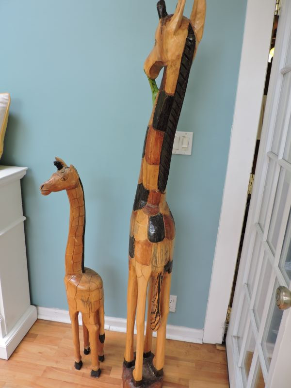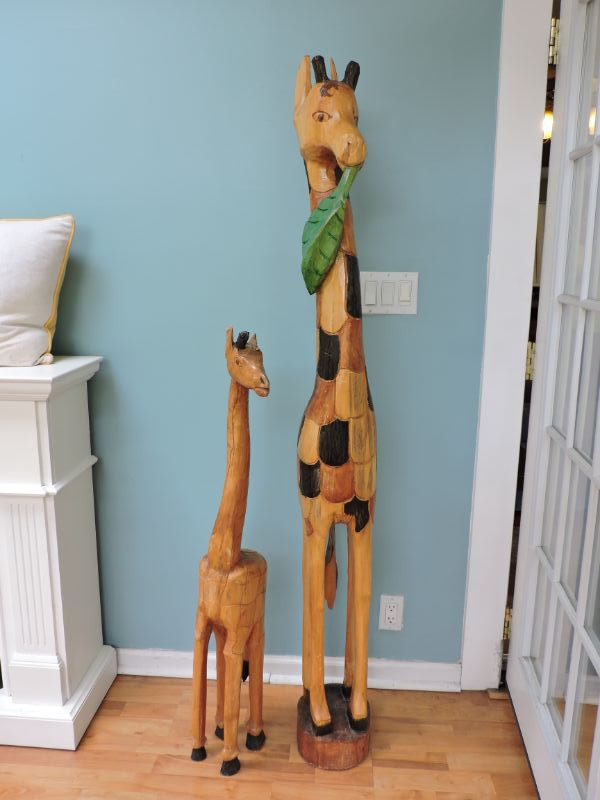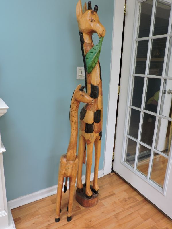 Amazingly hand-carved from one piece of wood each, the Mama stands almost 6' at 69”. Baby giraffe is 45”. Carved, stained, and painted, these are true works of art. Baby has broken ear & horn, but it doesn’t take away from the beauty and craftsmanship.