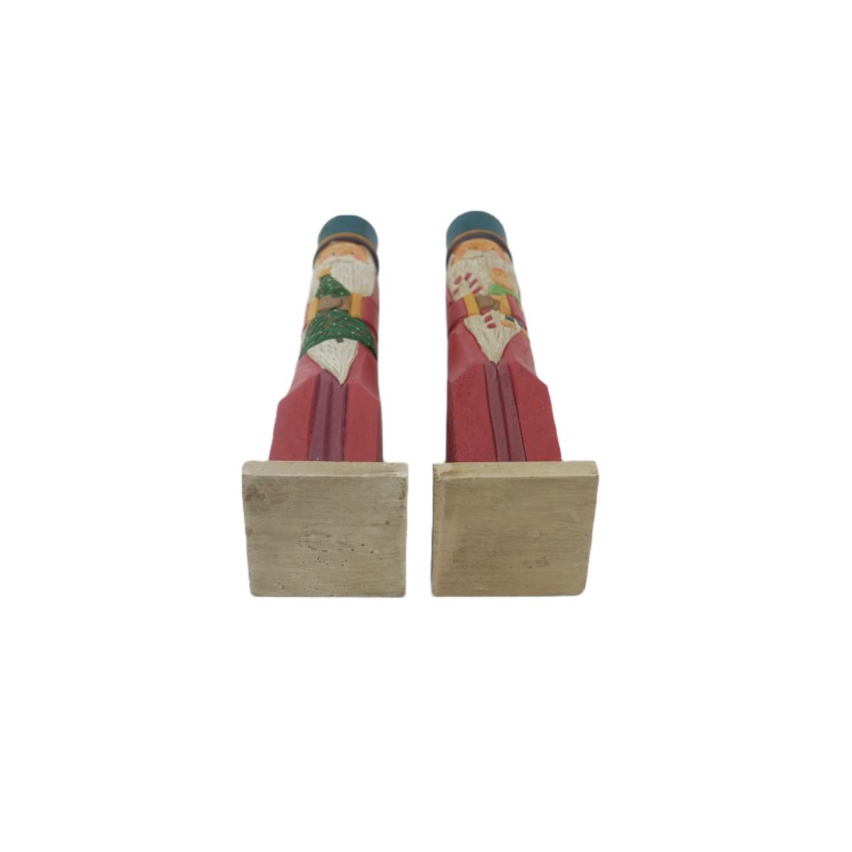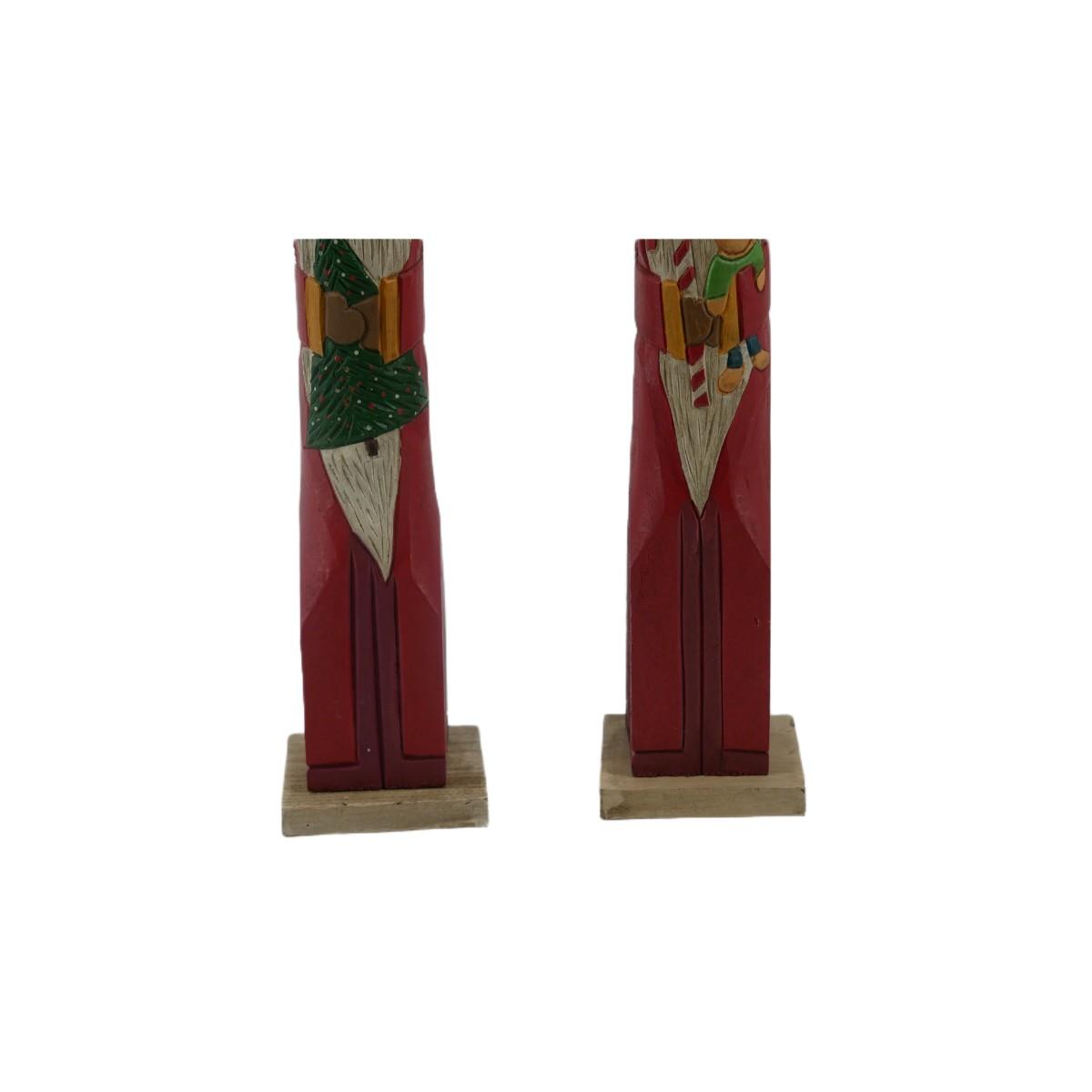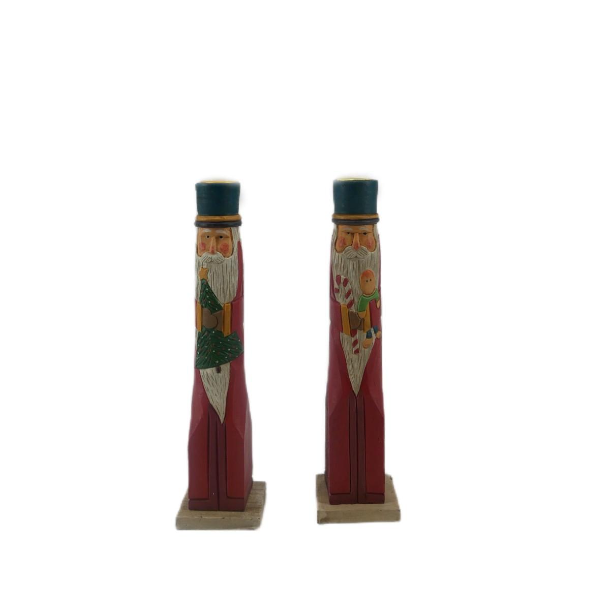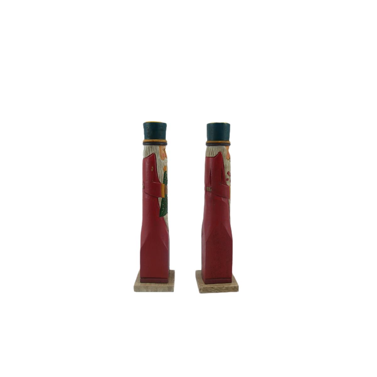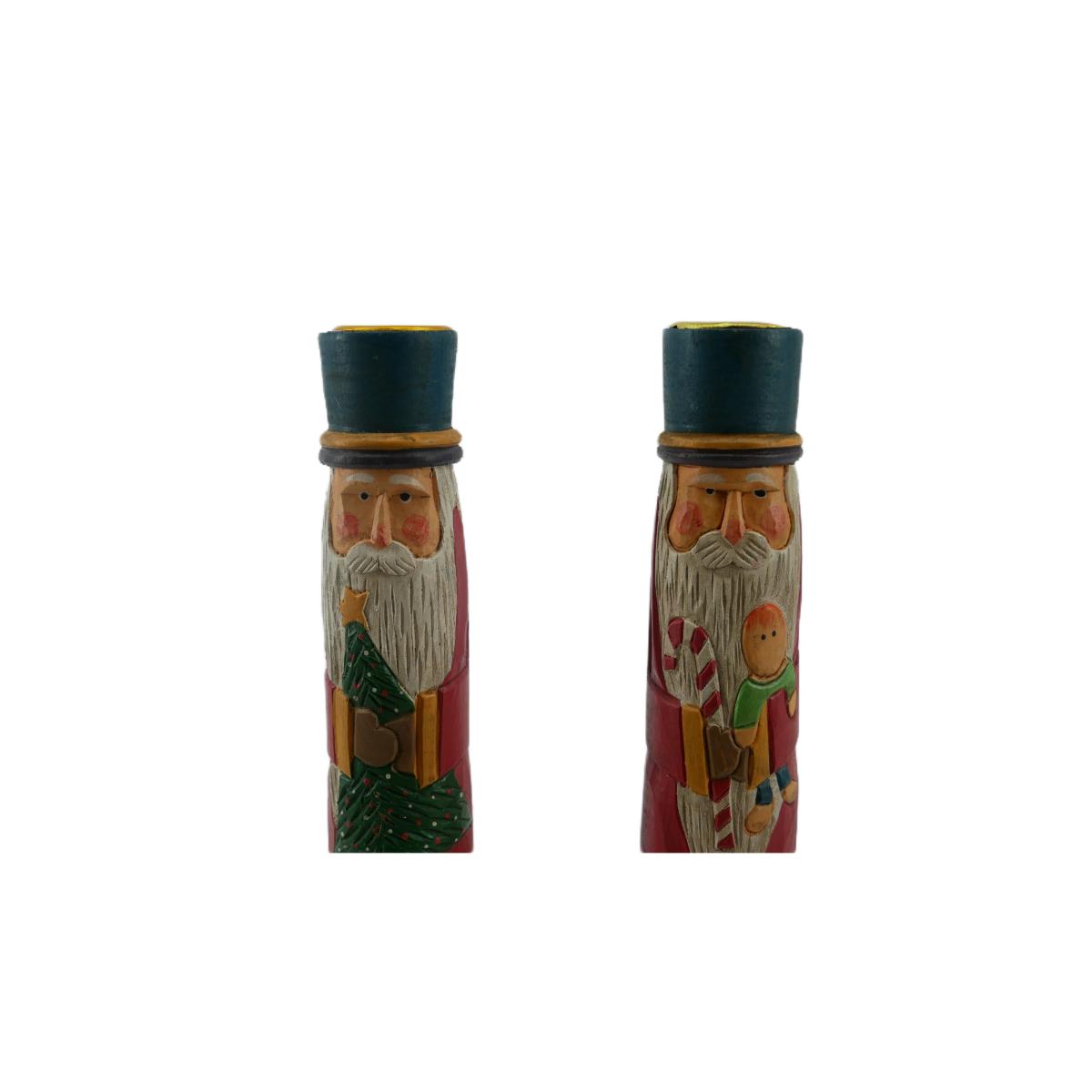 Wooden hand-carved and hand painted folk art Santa Claus candlesticks. One is holding a Christmas tree and the other a candy cane and doll. Small paint wear from age and use. Excellent condition! Candles not included. Each measures approximately L 2.25" x H 9.5". Lot weighs 9.7 oz. (D81)