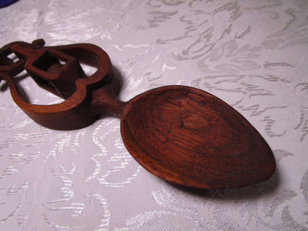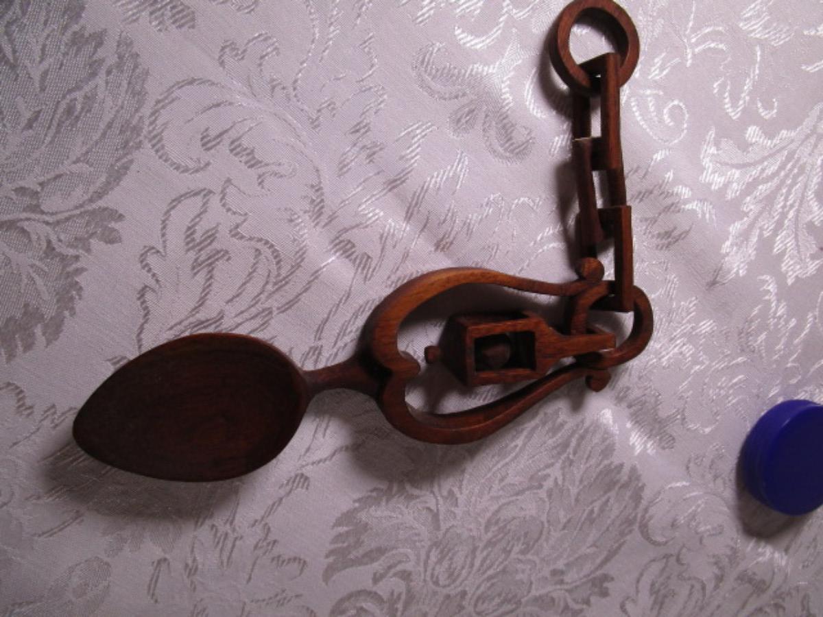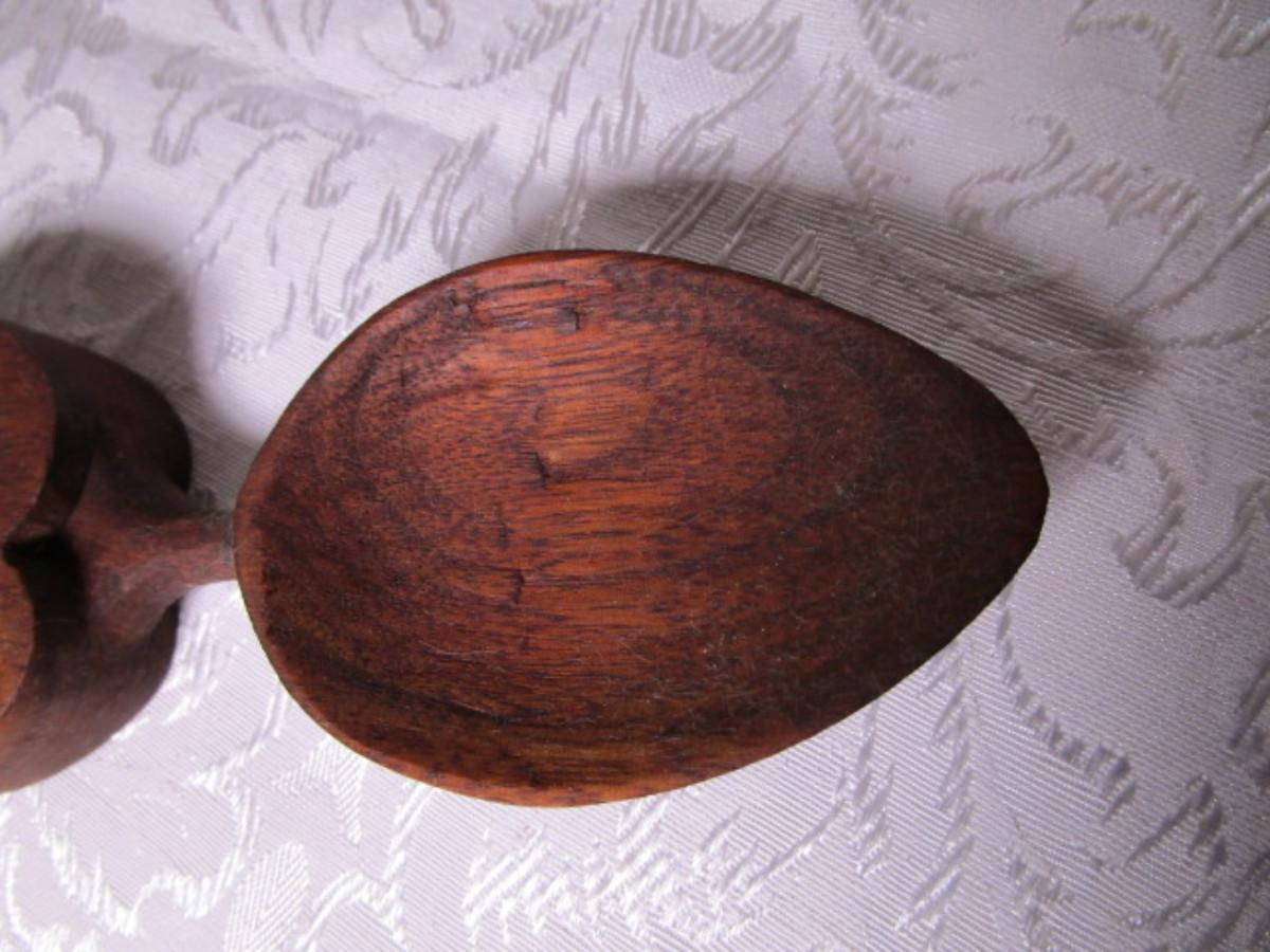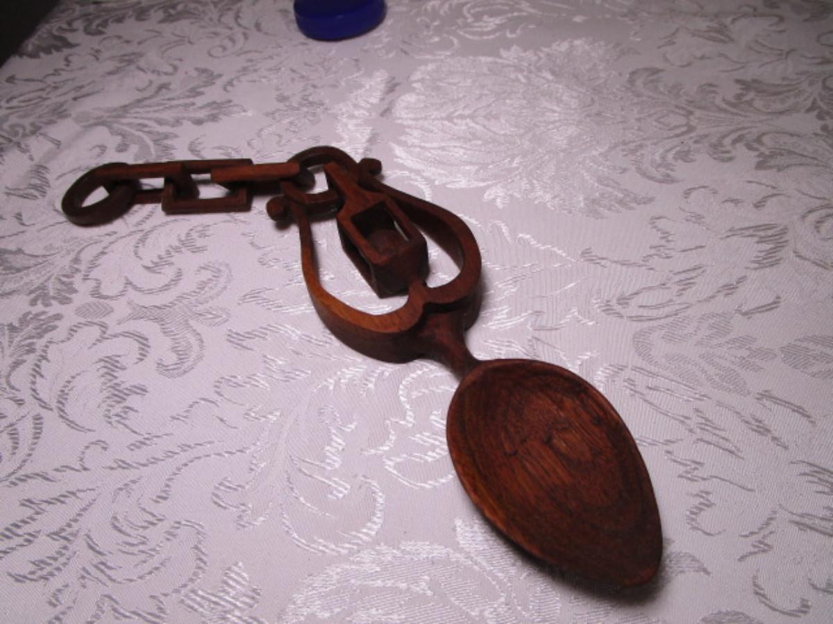 Has carved wood linked chain attached to the spoon, from top of chain to bottom of spoon is 12", width 2-1/2"
