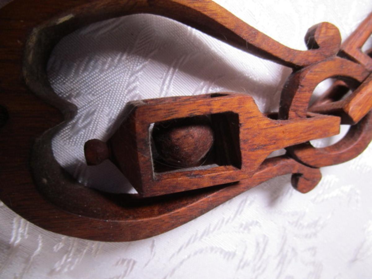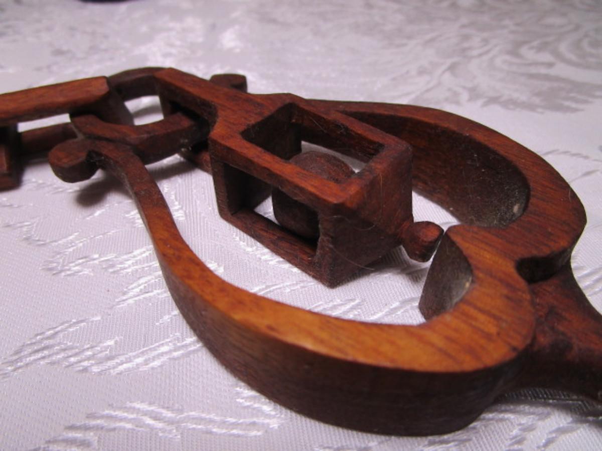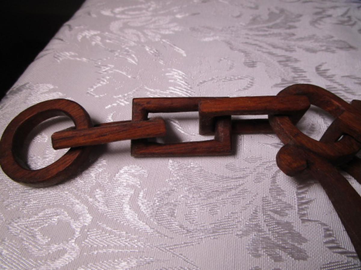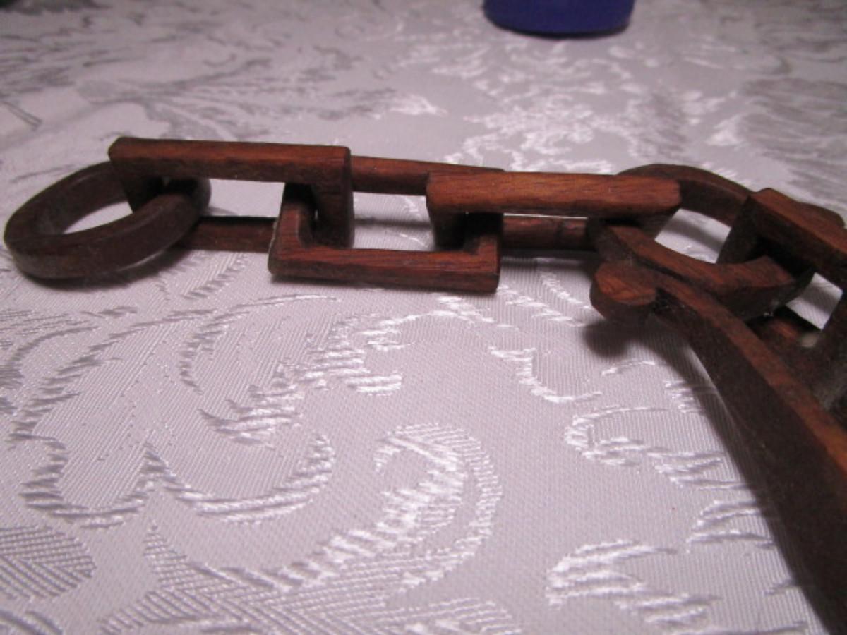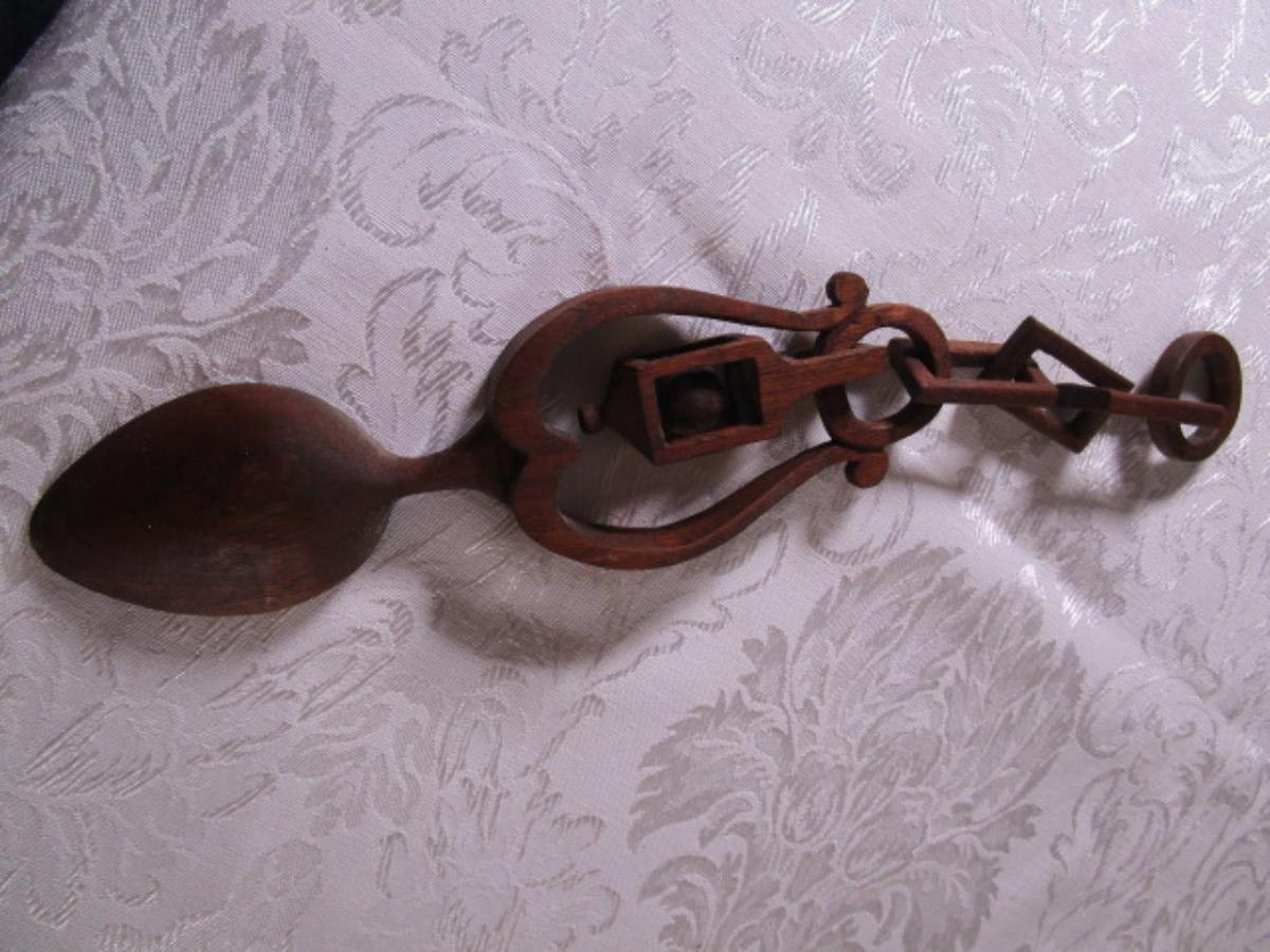 Has carved wood linked chain attached to the spoon, from top of chain to bottom of spoon is 12", width 2-1/2"