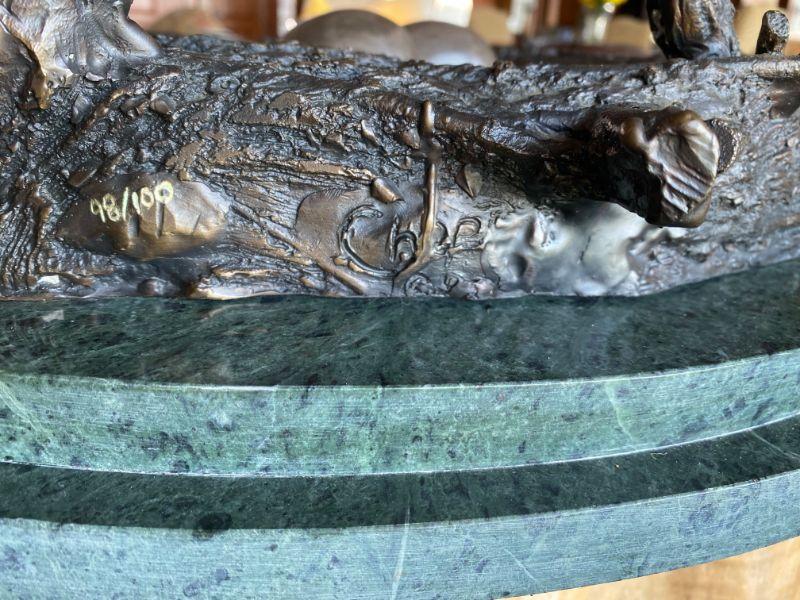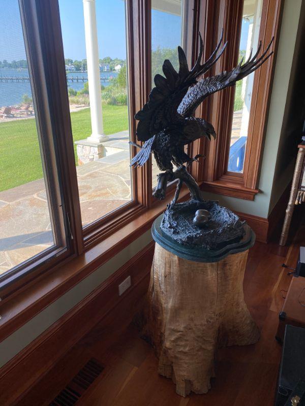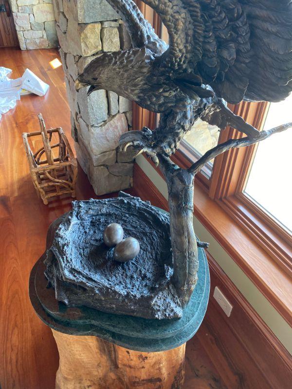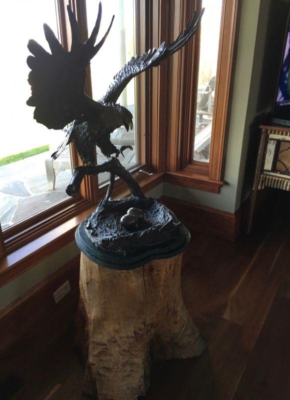 Hand-casted bronze sculpture of American Bald Eagle by Ed Chope with wings spread, on branch above nest with two eggs, on green marble base with plaque, " Eagle's Nest" signed on back of base #98/100 with stump base ( extremely heavy) Measures 59" tall with base, 23" round , with approximate wingspand of 30" and 26" from front to back.