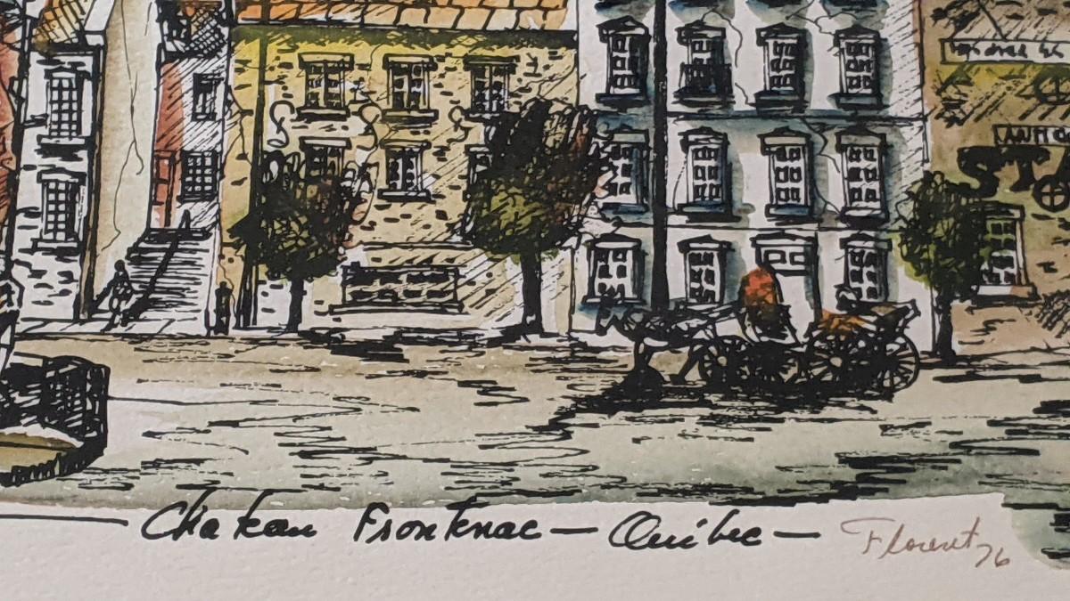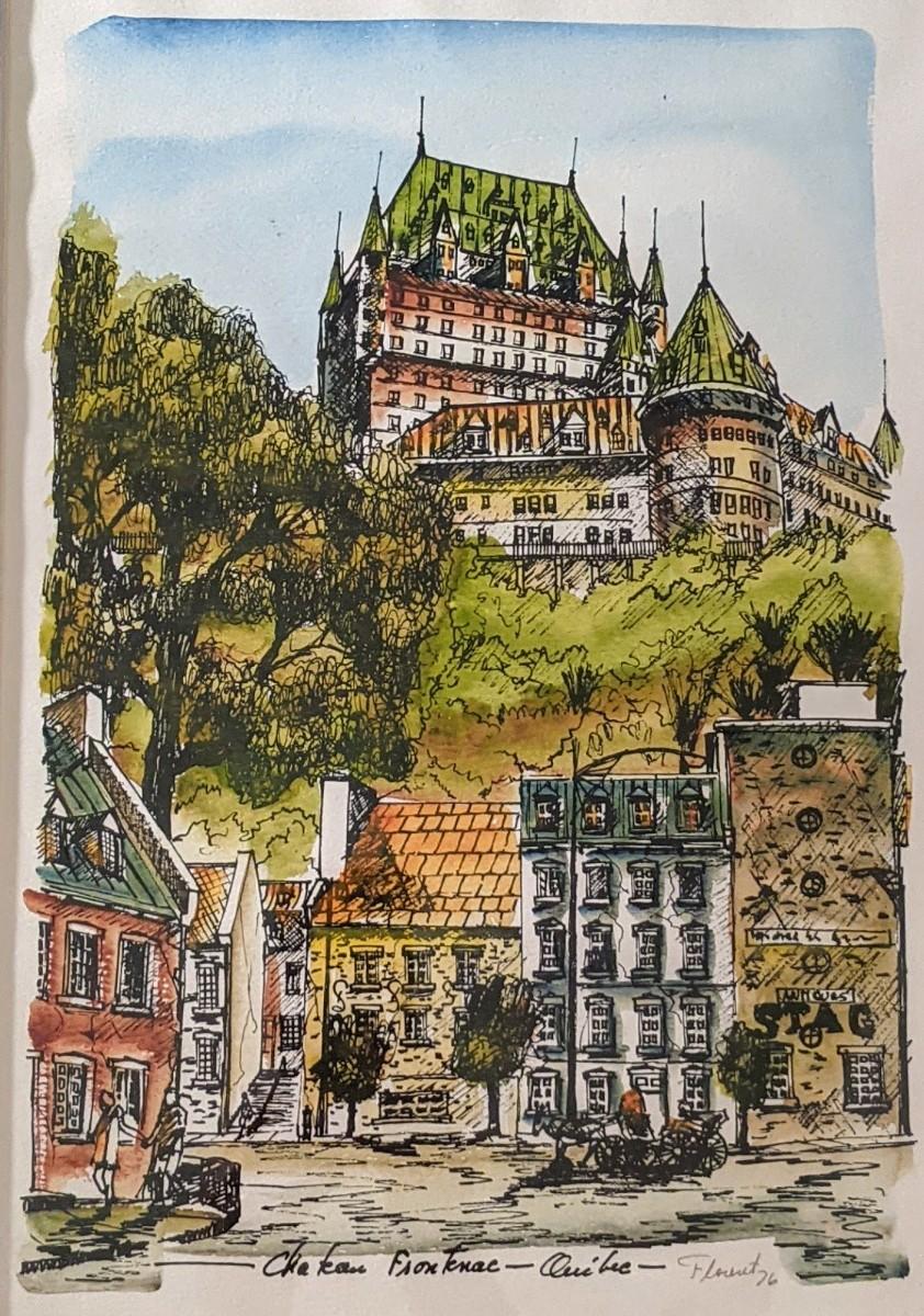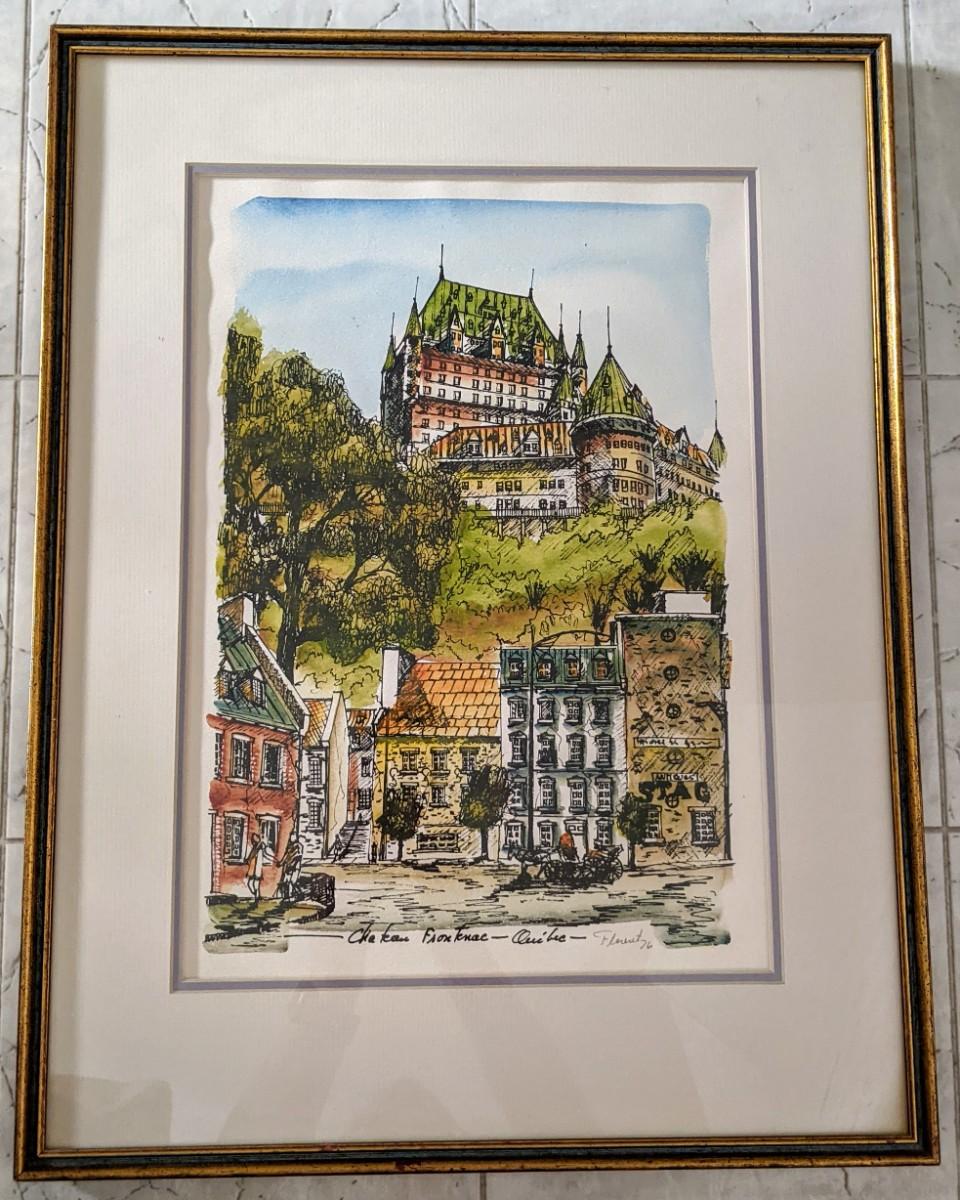 Handcolored watercolor over lithograph of Chateau Frontenac Quebec 1976