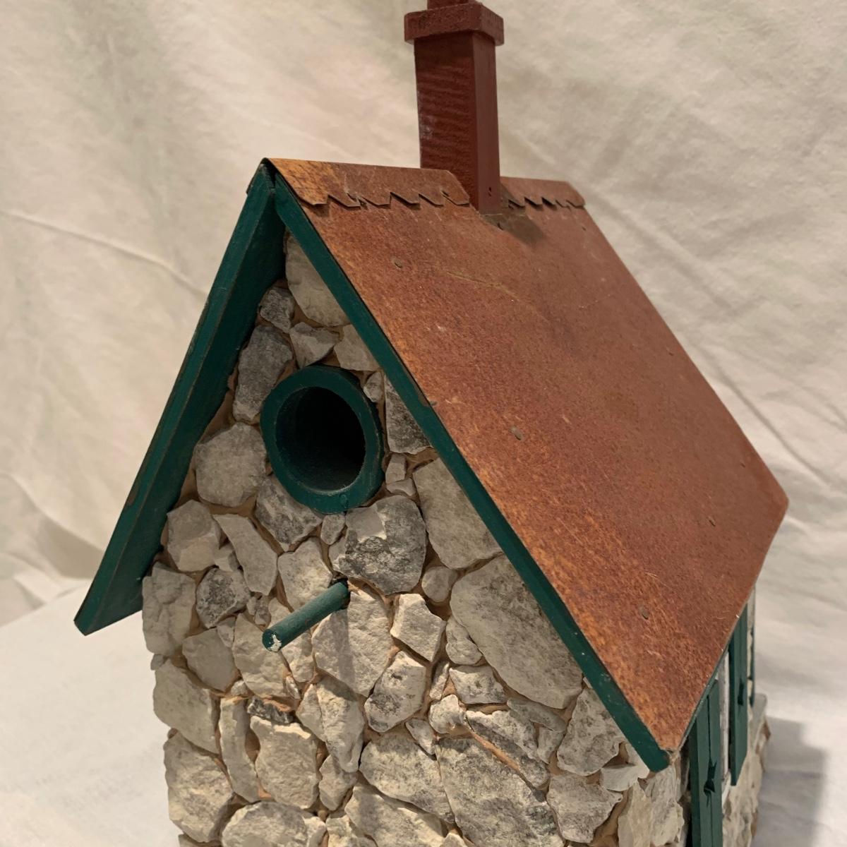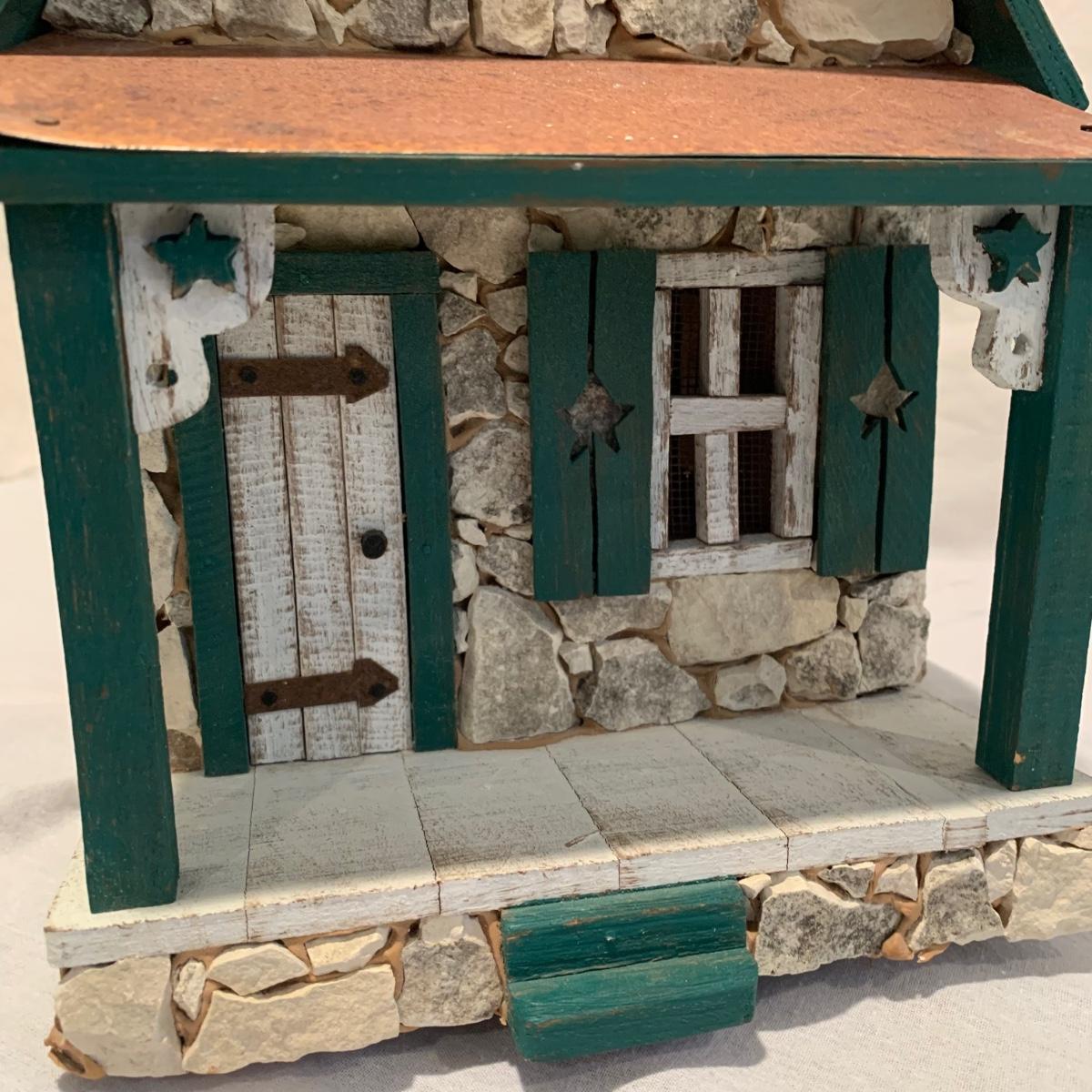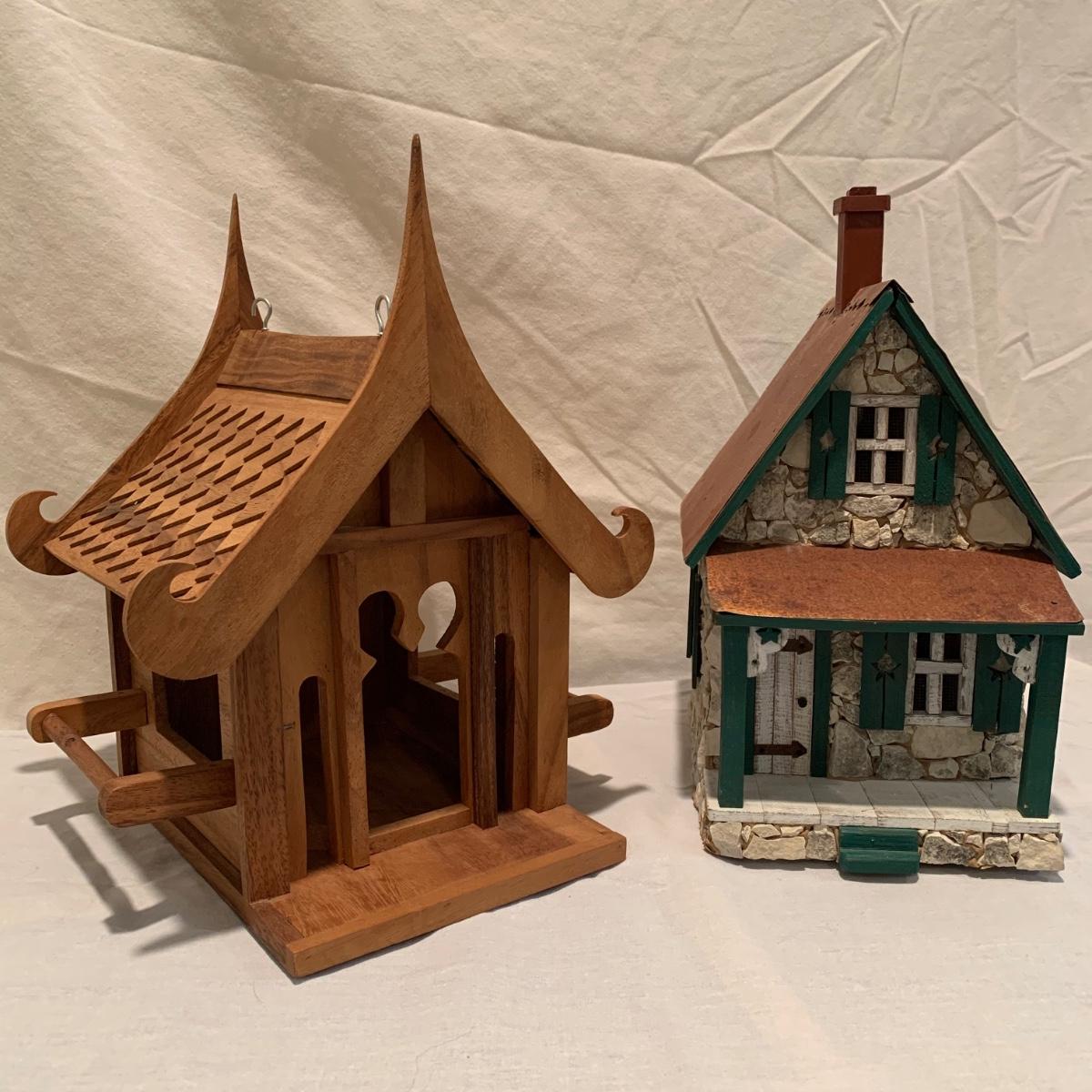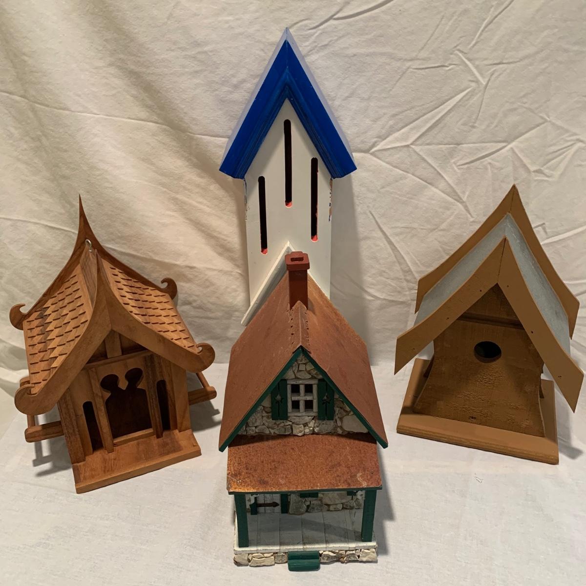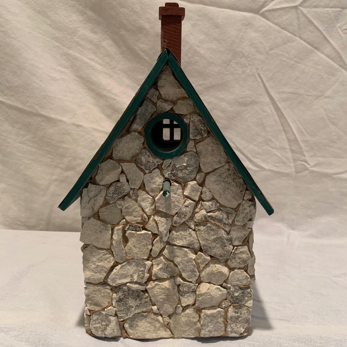 Lot includes four lovely birdhouses. Each handcrafted with unique design. Tallest house measures, 7.5” x 6.5” x 23”H. Please note, stone birdhouse it quite heavy. Please see photos for more details.
