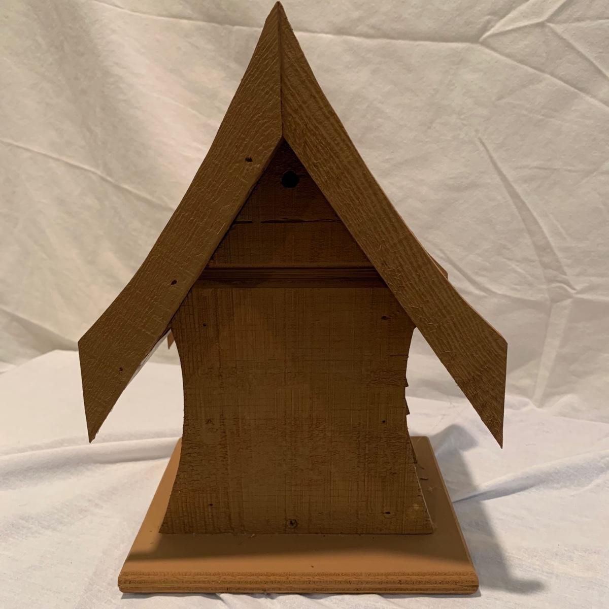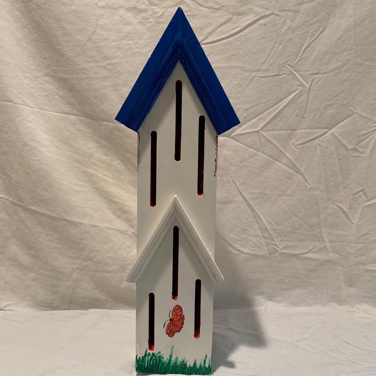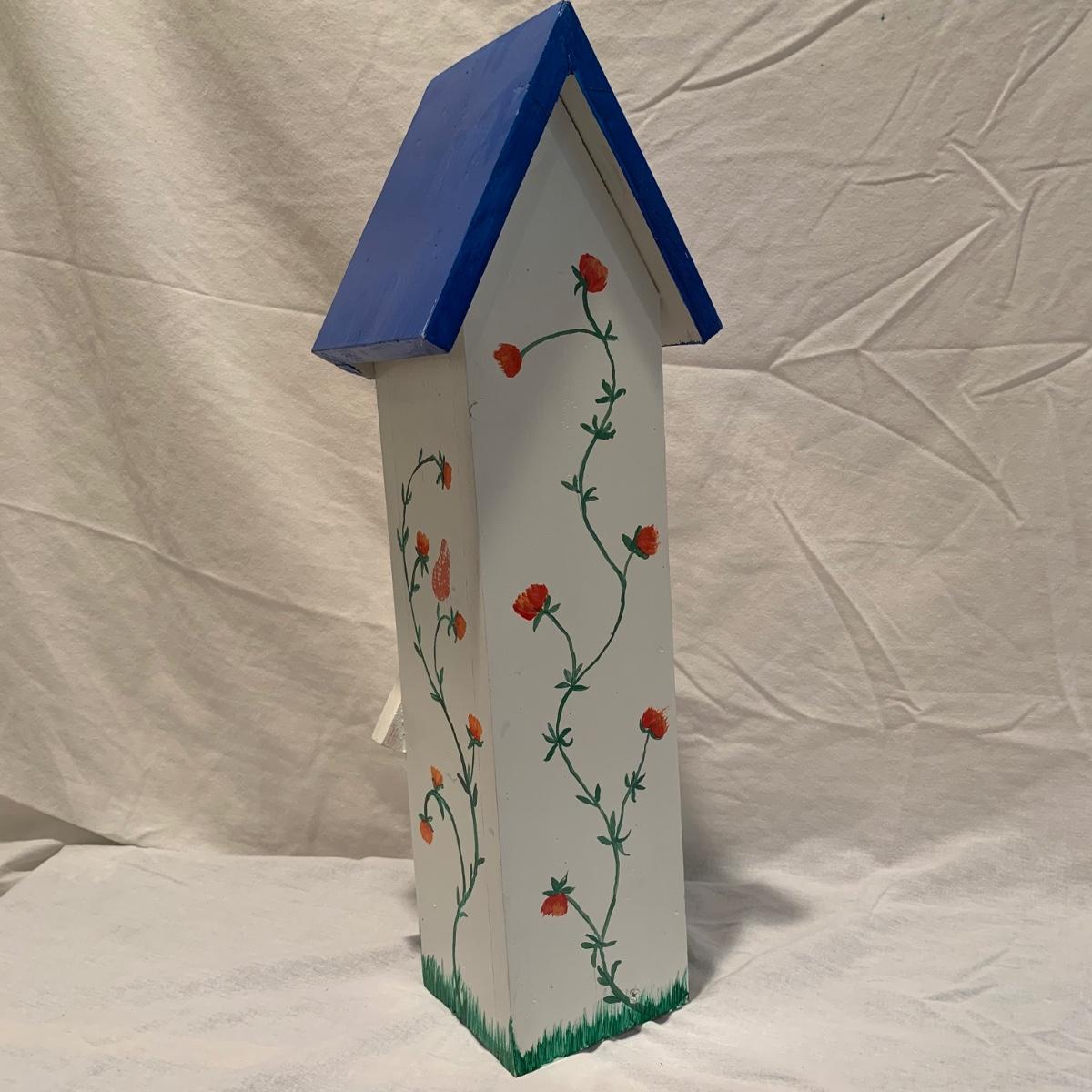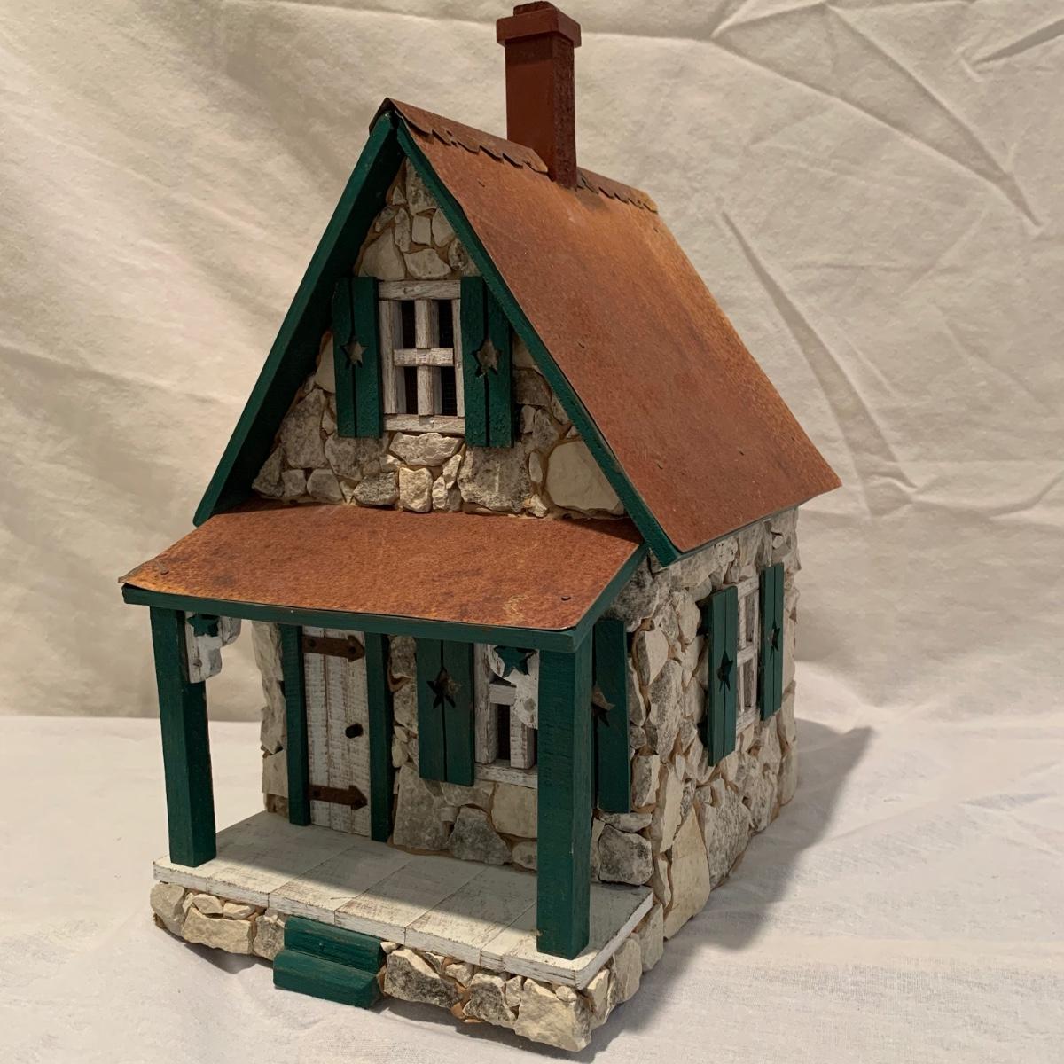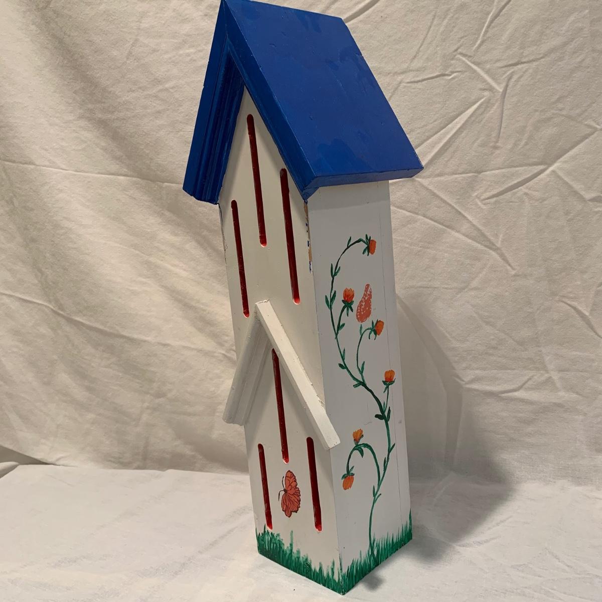 Lot includes four lovely birdhouses. Each handcrafted with unique design. Tallest house measures, 7.5” x 6.5” x 23”H. Please note, stone birdhouse it quite heavy. Please see photos for more details.