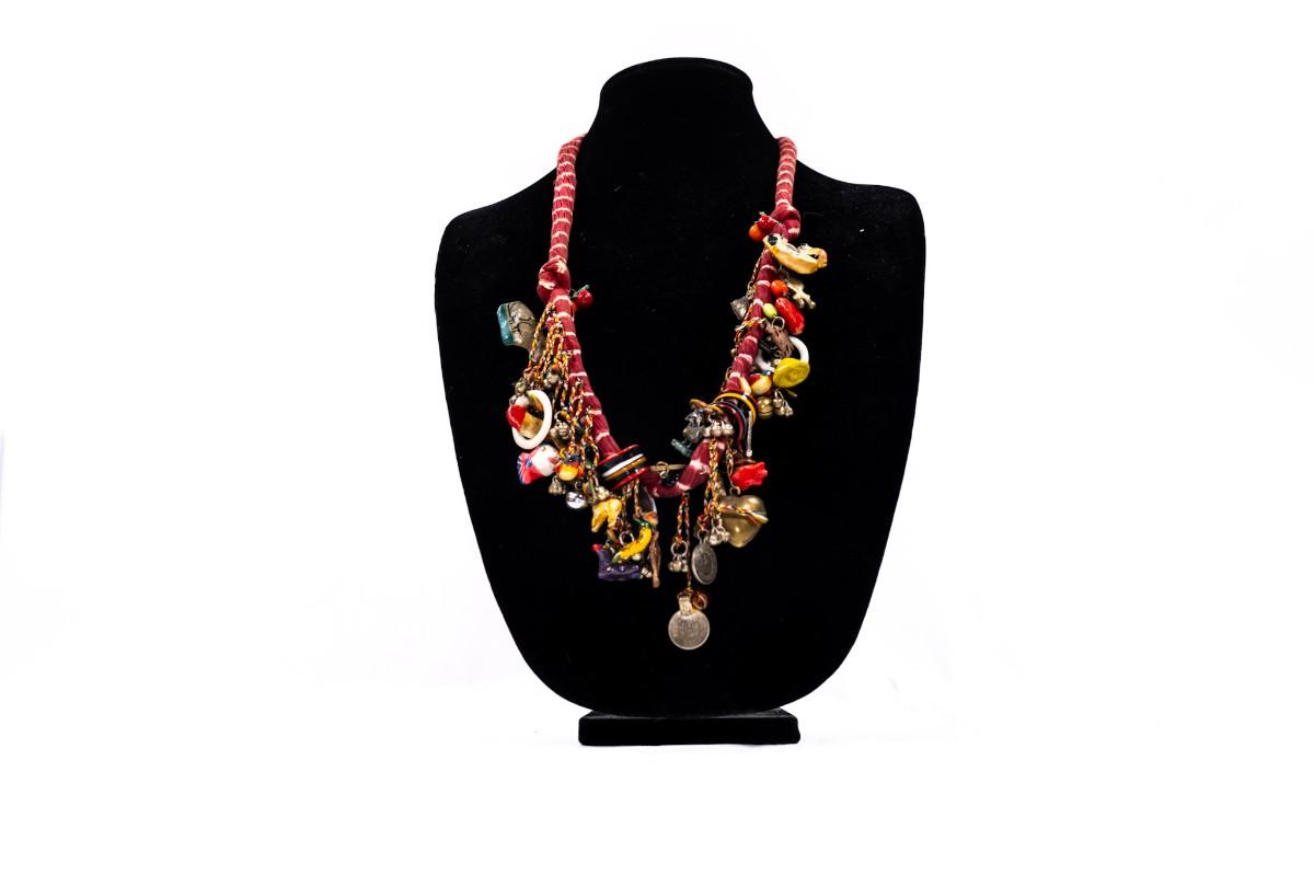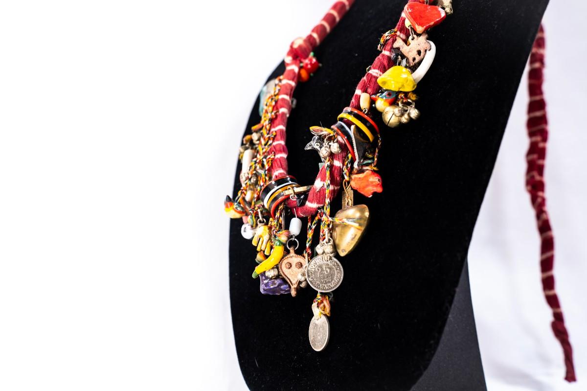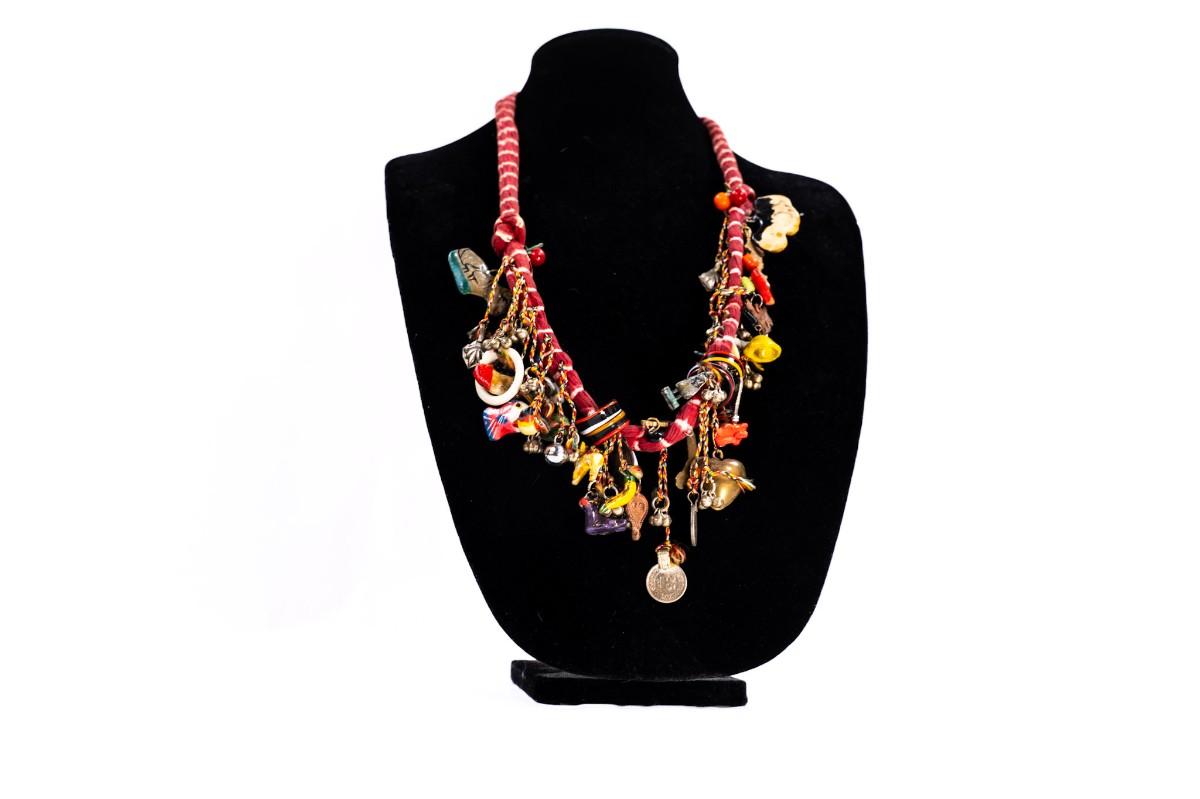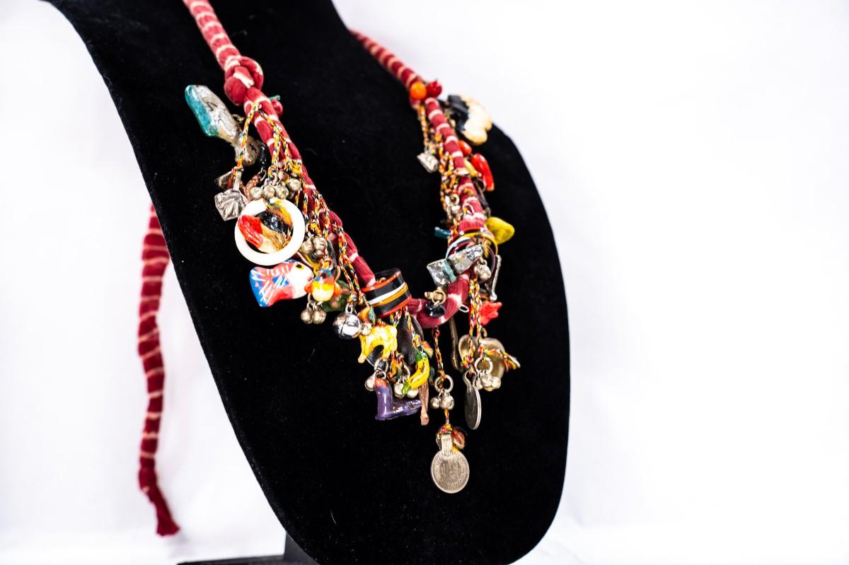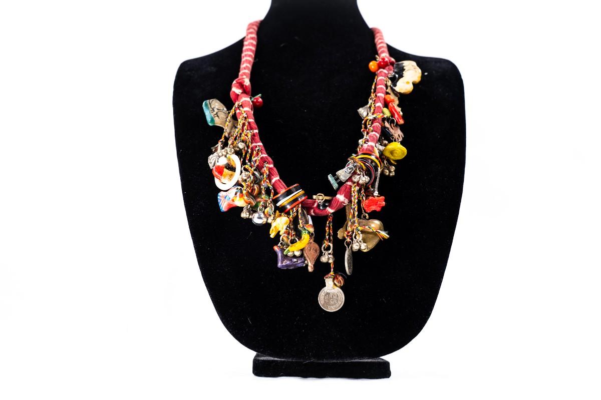 This is a handcrafted charm neckace featuring a hand-dyed scarf base approximately 56 milagros and charchkas from around the world.