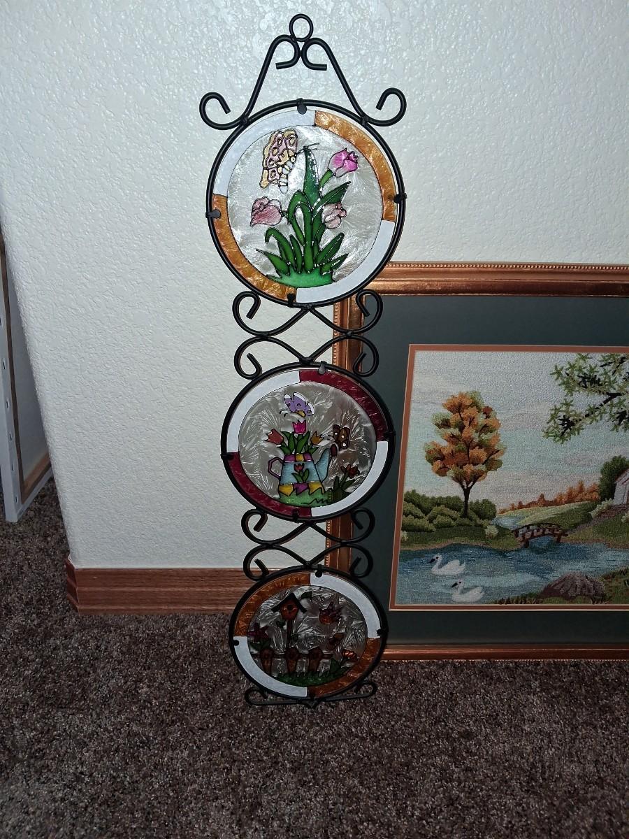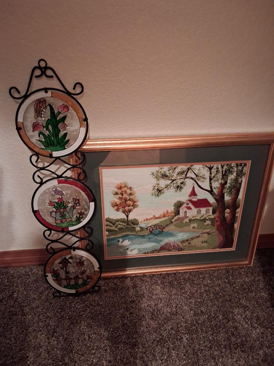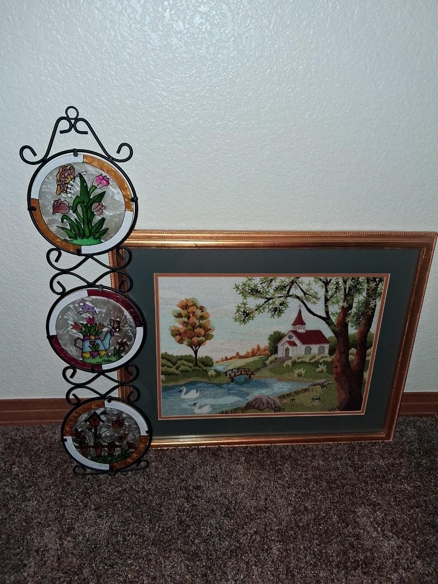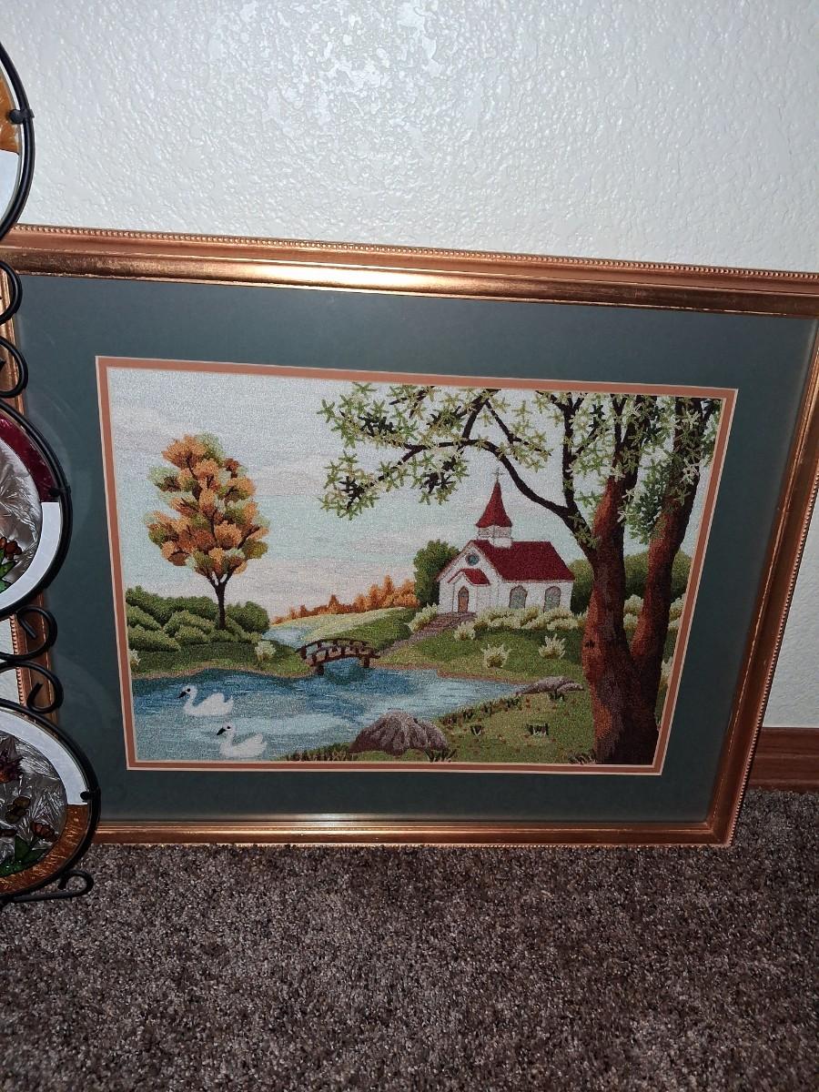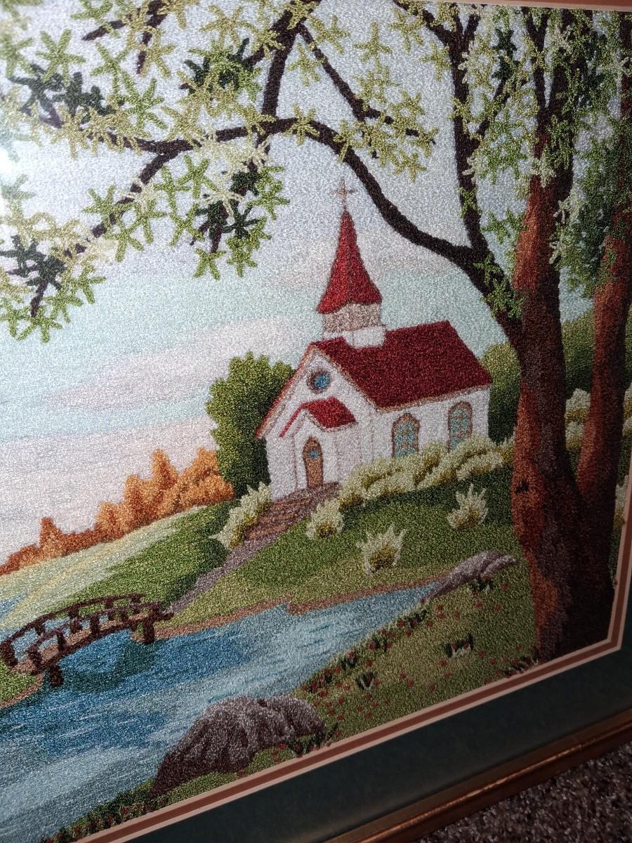 HANDCRAFTED CHURCH BY A CREEK PICTURE AND COLORED PLASTIC WALL DECOR