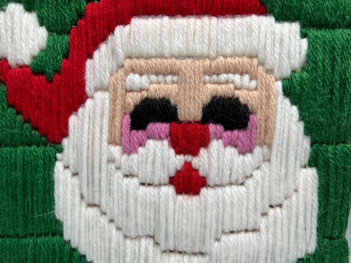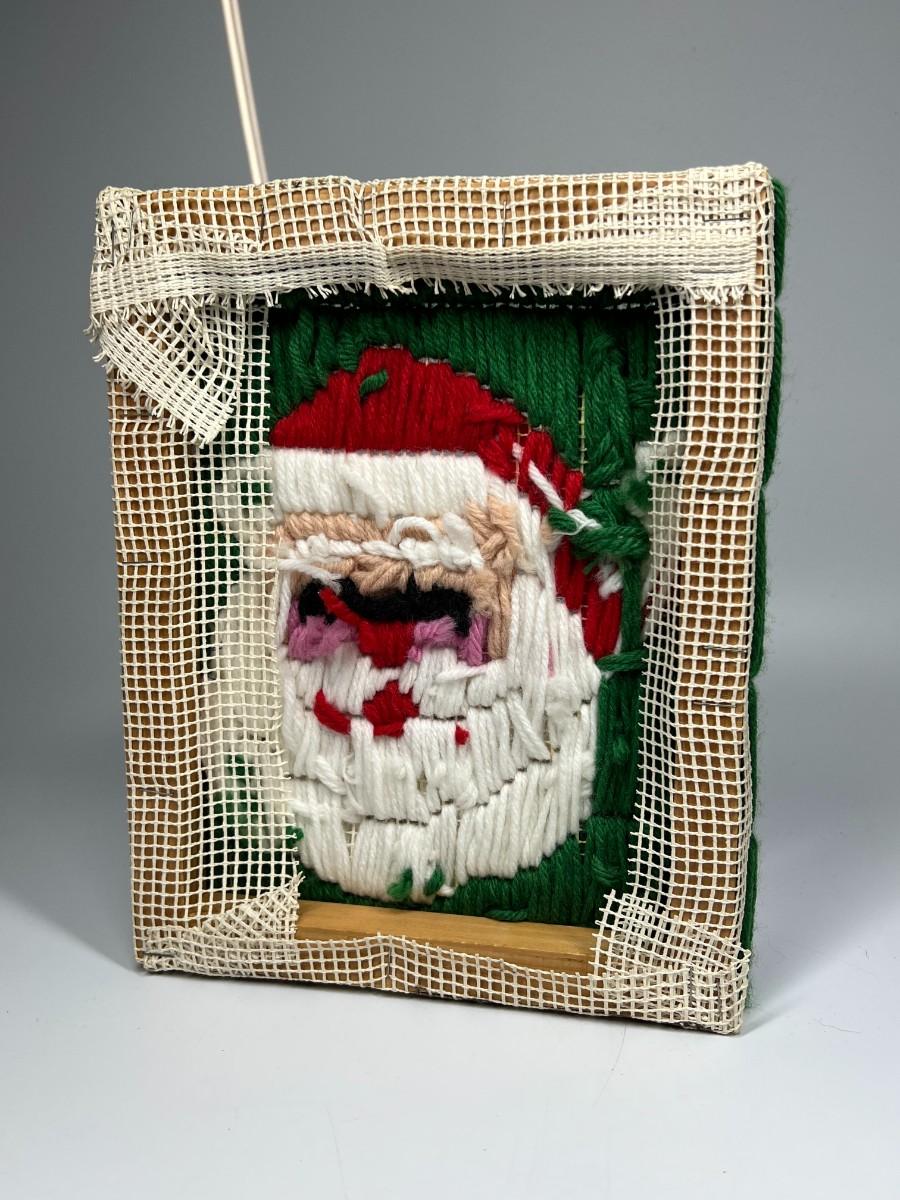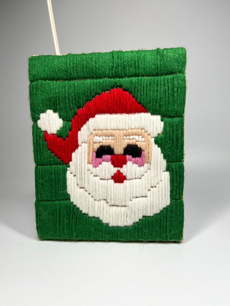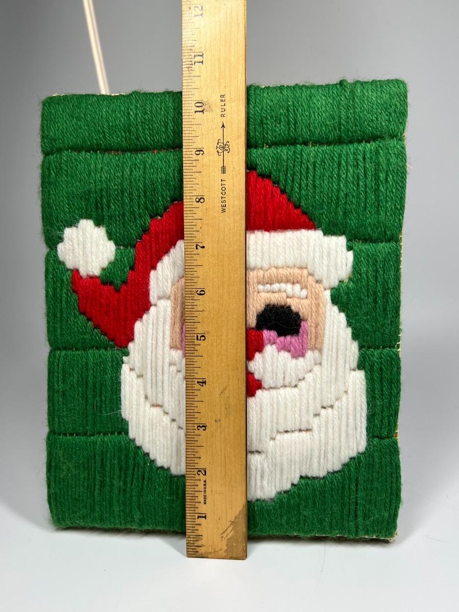 Handcrafted Crochet Santa Claus Canvas Decor, there is no significant damage to the canvas and is in good displayable condition. Check pictures for more details and for sizing.