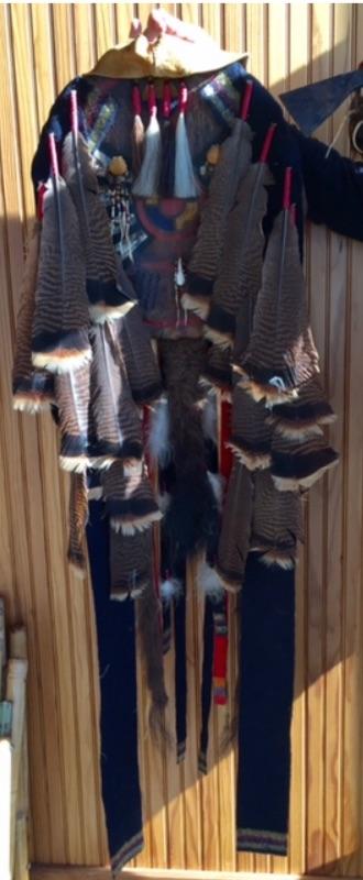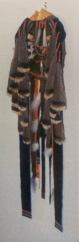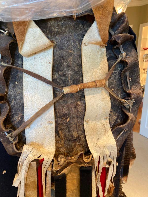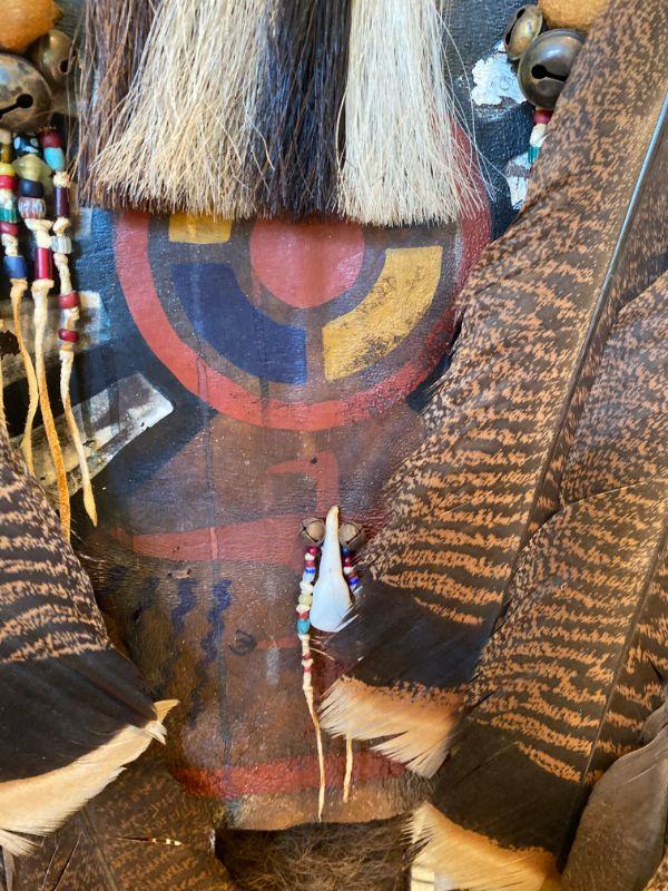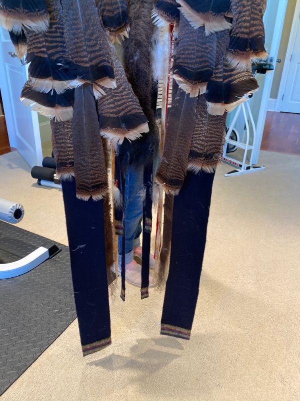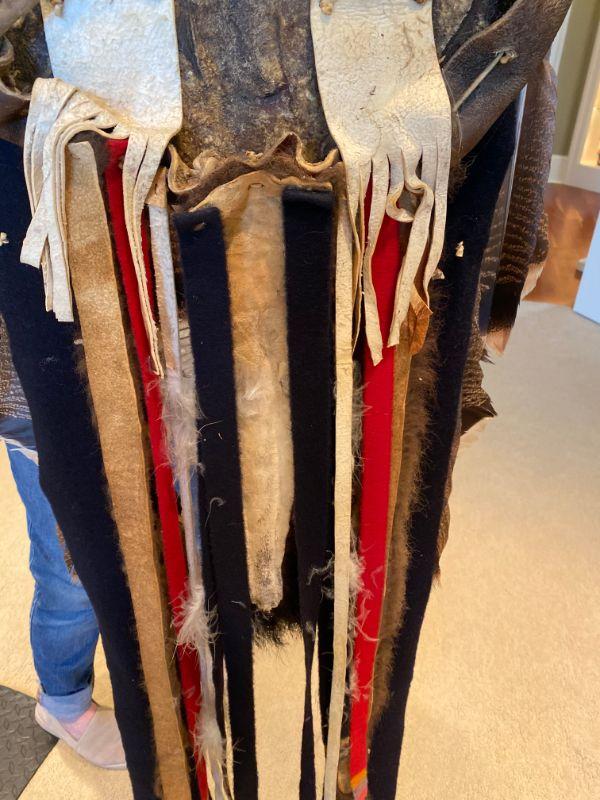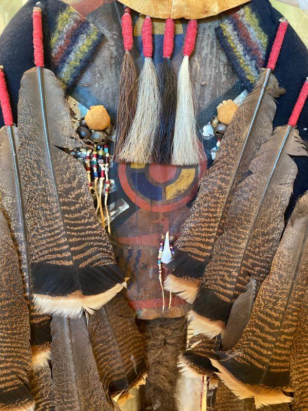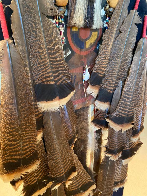 Handcrafted Dreamer Bird War Medicine Shield by Indian Artist Black Eagle made with Bison rawhide, brain tanned smoked buckskin, red and blue wool trade cloths, bison tooth, hair and tail, horse hair, and turkey feathers. Dated 1999, comes with signed authenticity document. Measures approximately 22" wide x 61" long x 6" deep