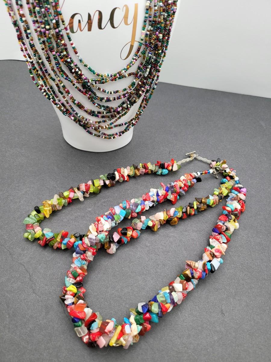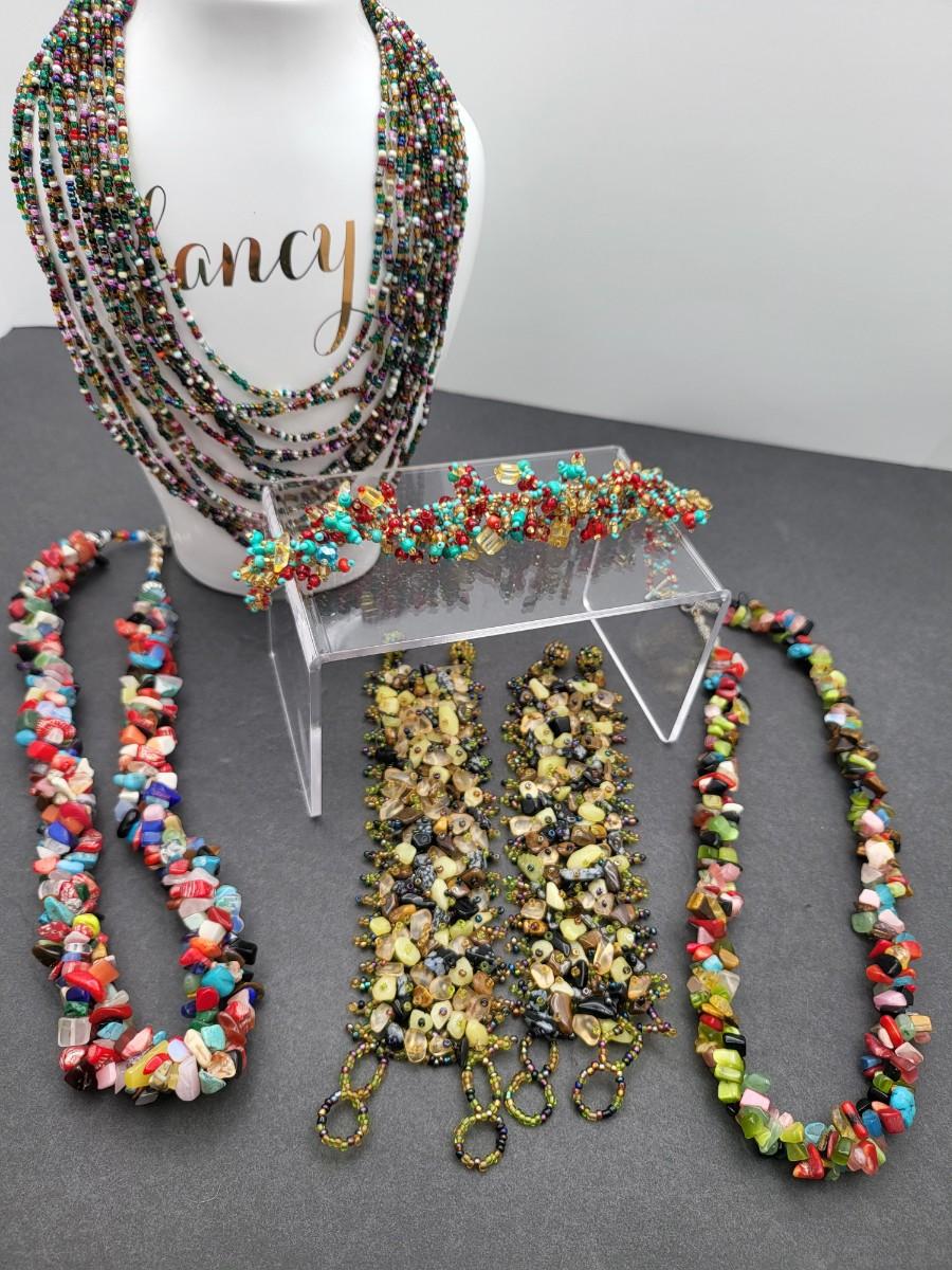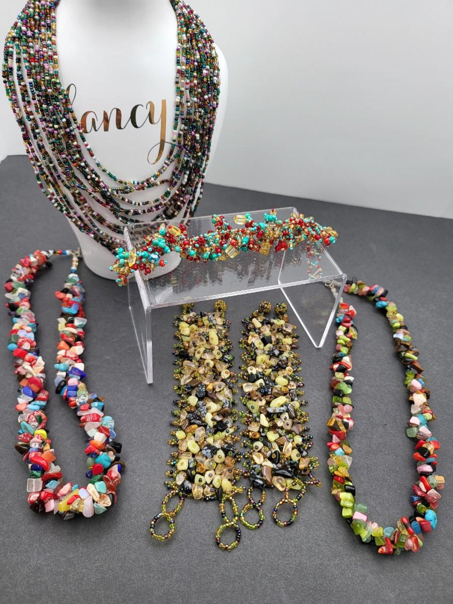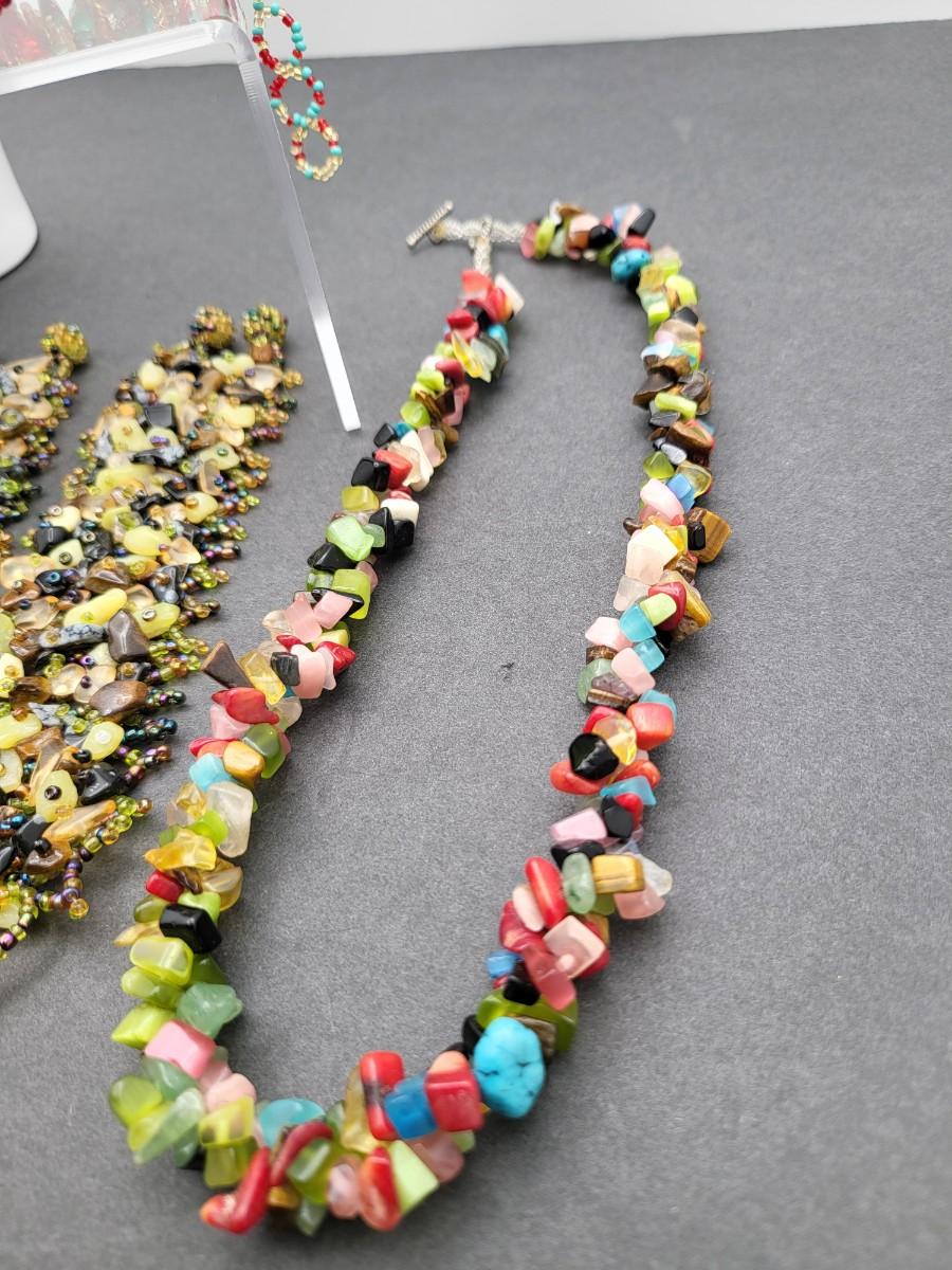 Colorful glass bead jewelry lot: Three necklaces 15" to 18" and three bracelets 7"-7.5", all hand strung.