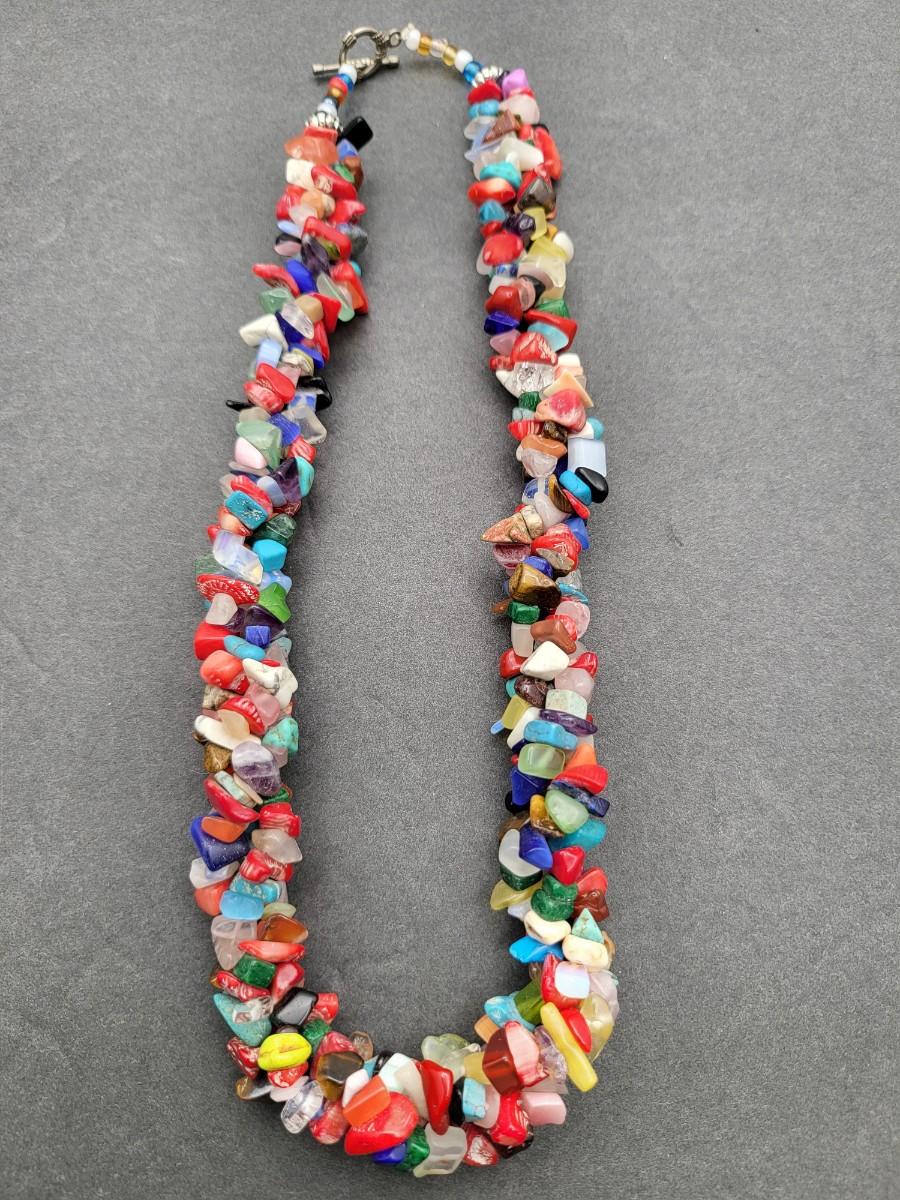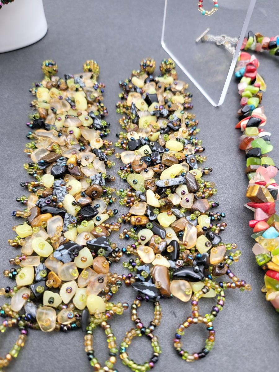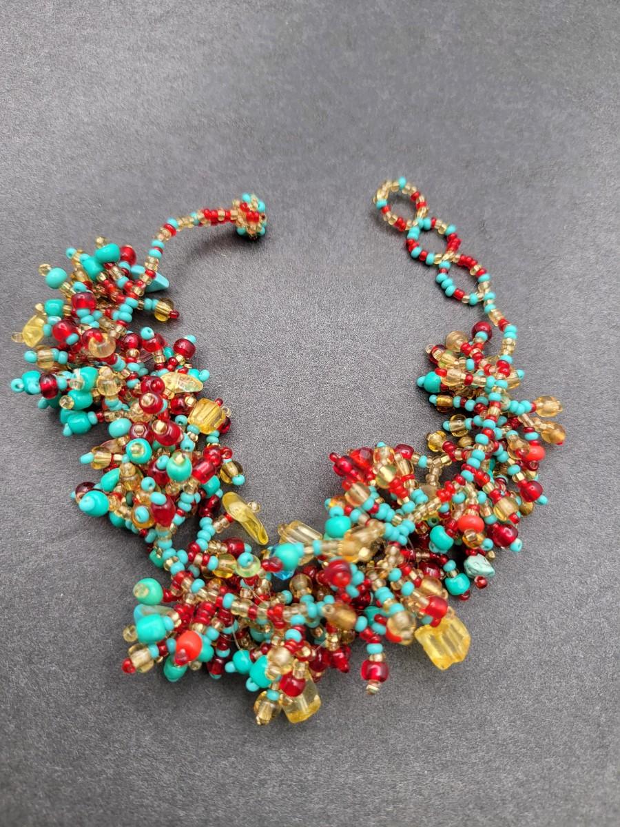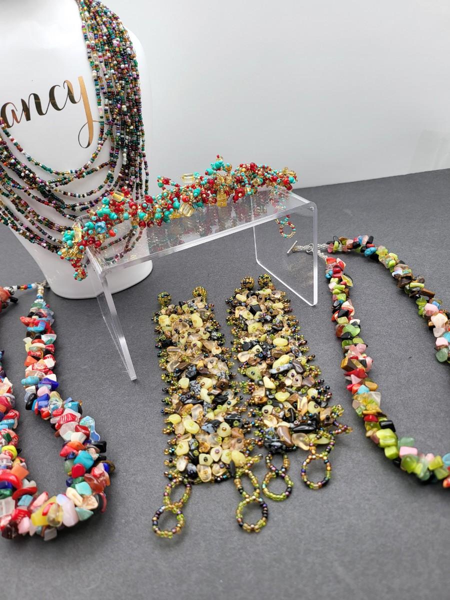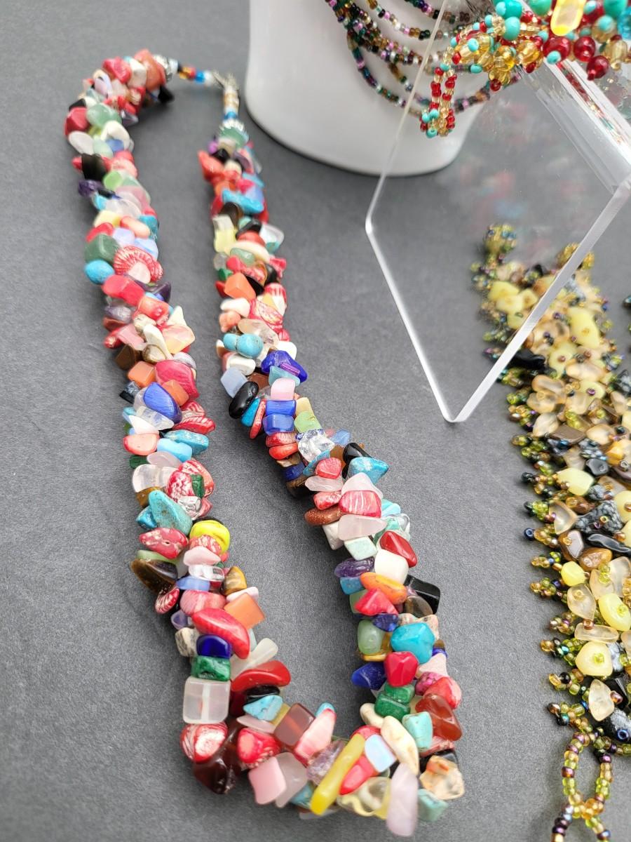 Colorful glass bead jewelry lot: Three necklaces 15" to 18" and three bracelets 7"-7.5", all hand strung.