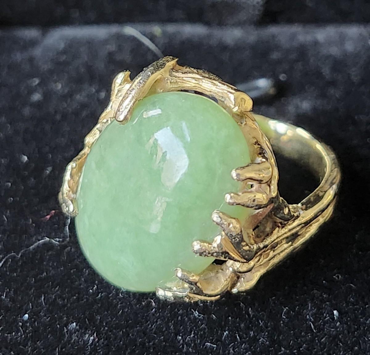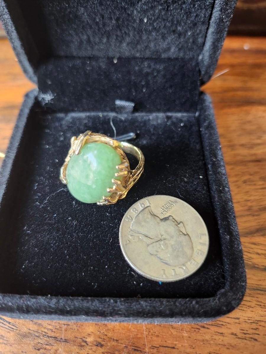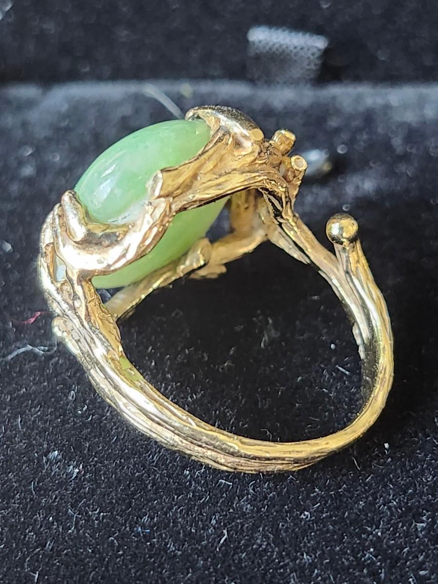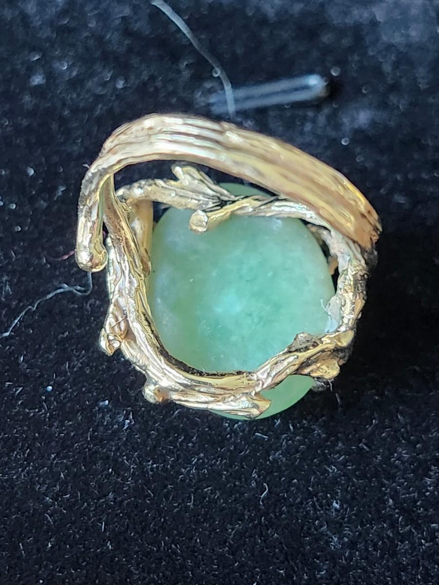 This is a very lovely ring, handcrafted. It tests 10K gold. Size 6