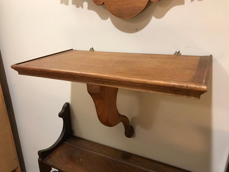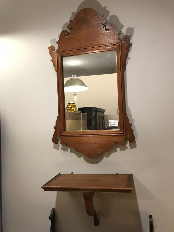 Very nice quality handcrafted mahogany Chippendale style mirror and shelf set. Mirror is 15" x 26" H, and shelf is 13" x 7" x 10" H. Excellent condition.