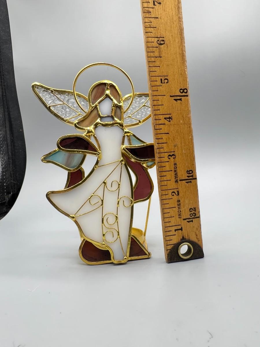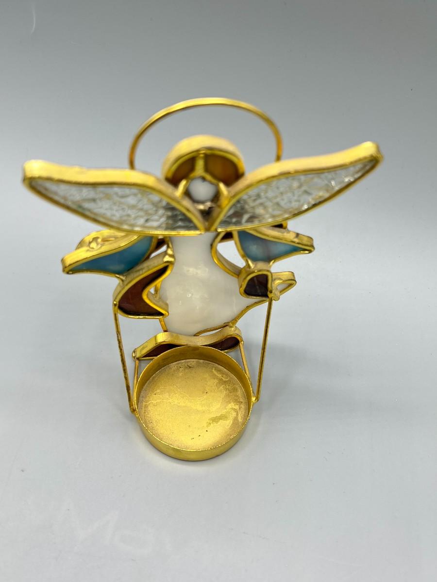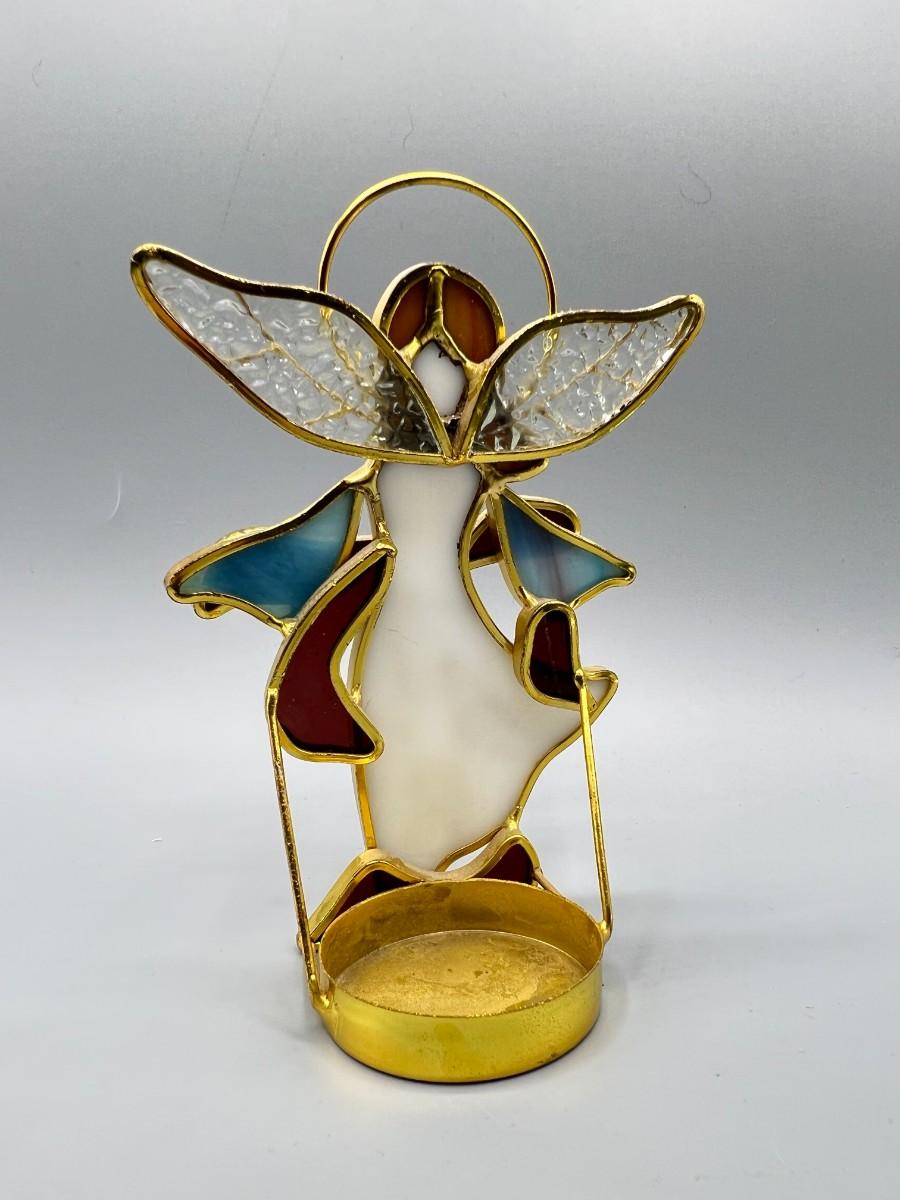 Handcrafted Metal Glass Religious Angel Candleholder, there is no significant cracks or chips to the candleholder and is in good displayable condition. Check pictures for more details and for sizing.