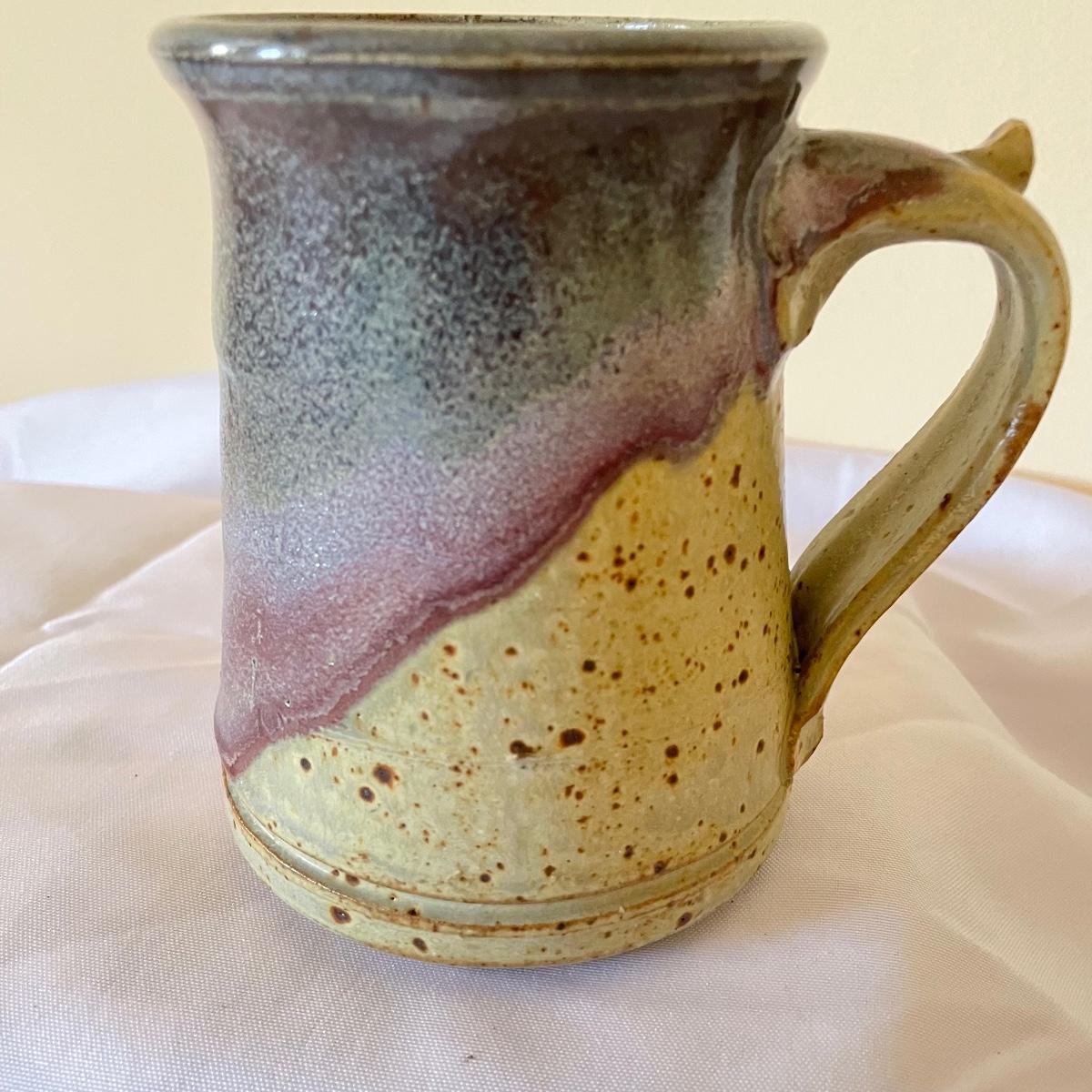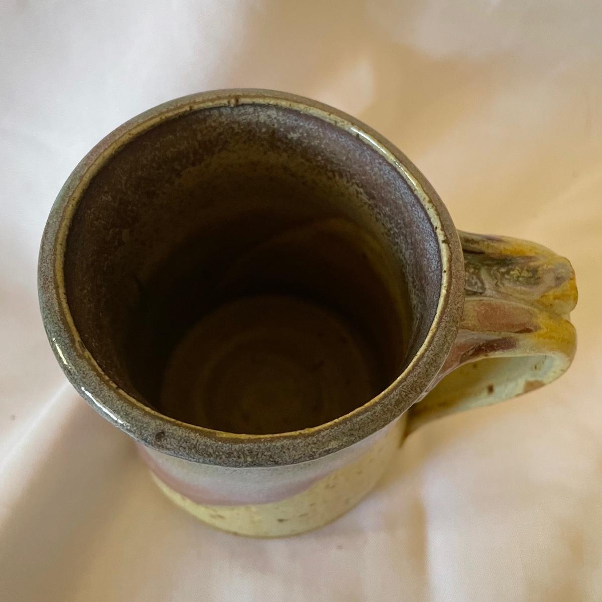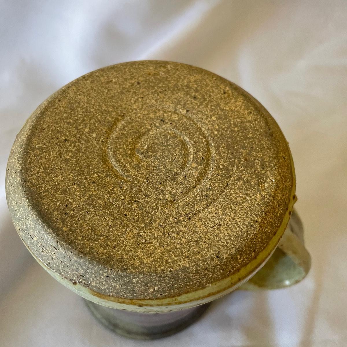 One of these two stoneware mugs has been signed by its potter and has a rusty orange glaze with a brown rim that measures 3” d x 5”. The other mug is half unglazed, the other half a pleasant purple/blue color that’s also on the inside.