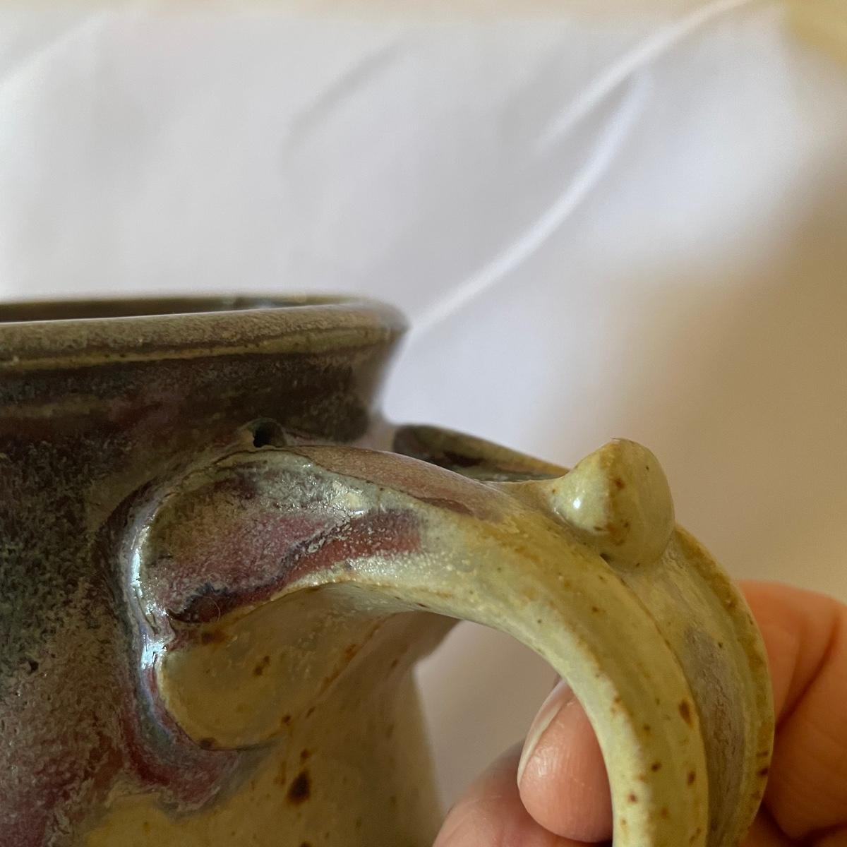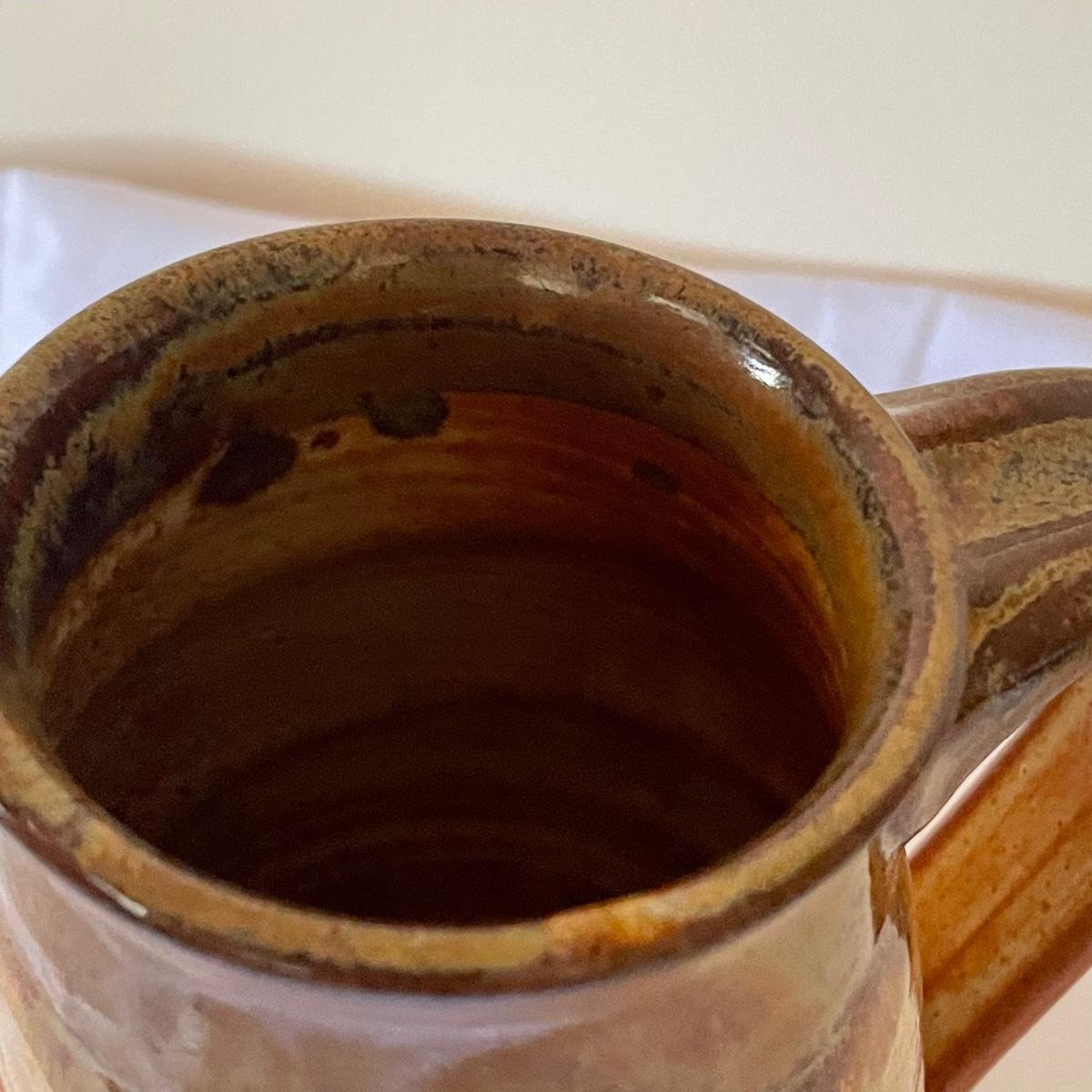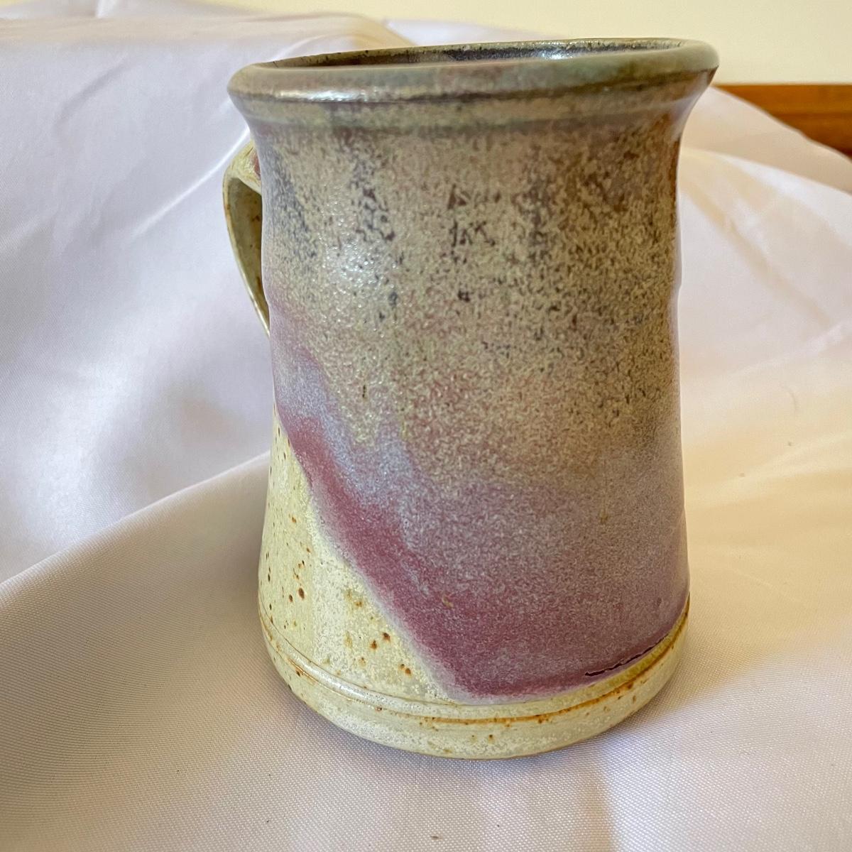 One of these two stoneware mugs has been signed by its potter and has a rusty orange glaze with a brown rim that measures 3” d x 5”. The other mug is half unglazed, the other half a pleasant purple/blue color that’s also on the inside.