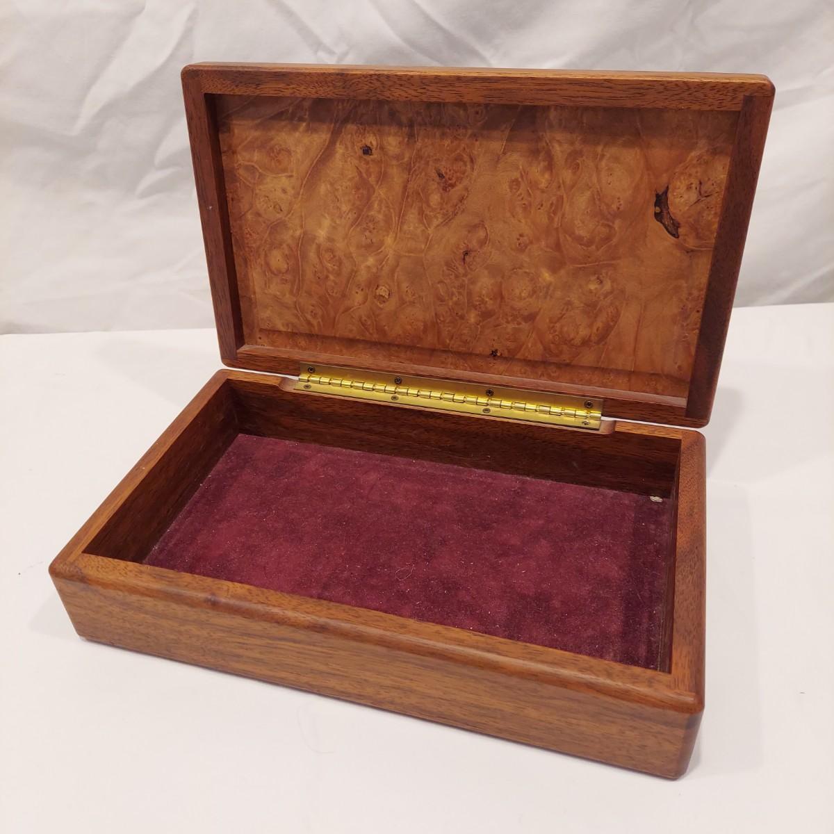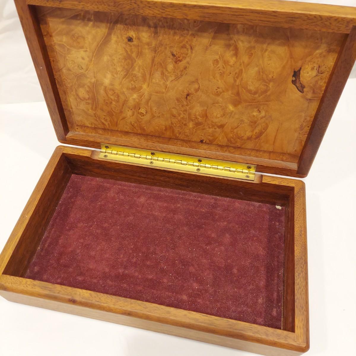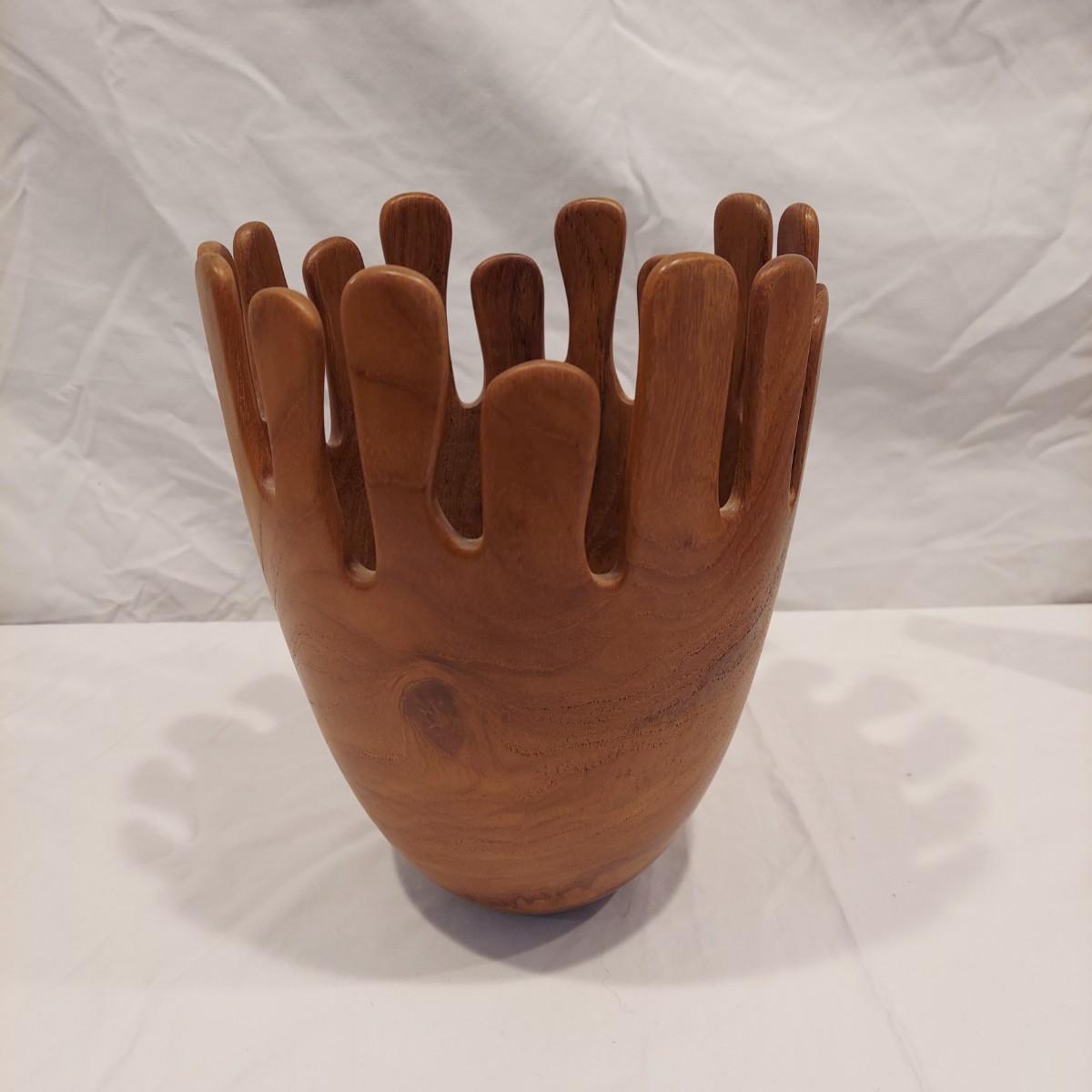 Three pieces of wooden decor that appear to be Handcrafted. The bowl and box have markings on bottom. The box measures 10.5" x 6.5" x 3"H. The wooden wall vase is 16"H. The bowl has a crack or imperfection in the wood on bottom. Please see photos for details. Flower is not included in lot. Shipping available