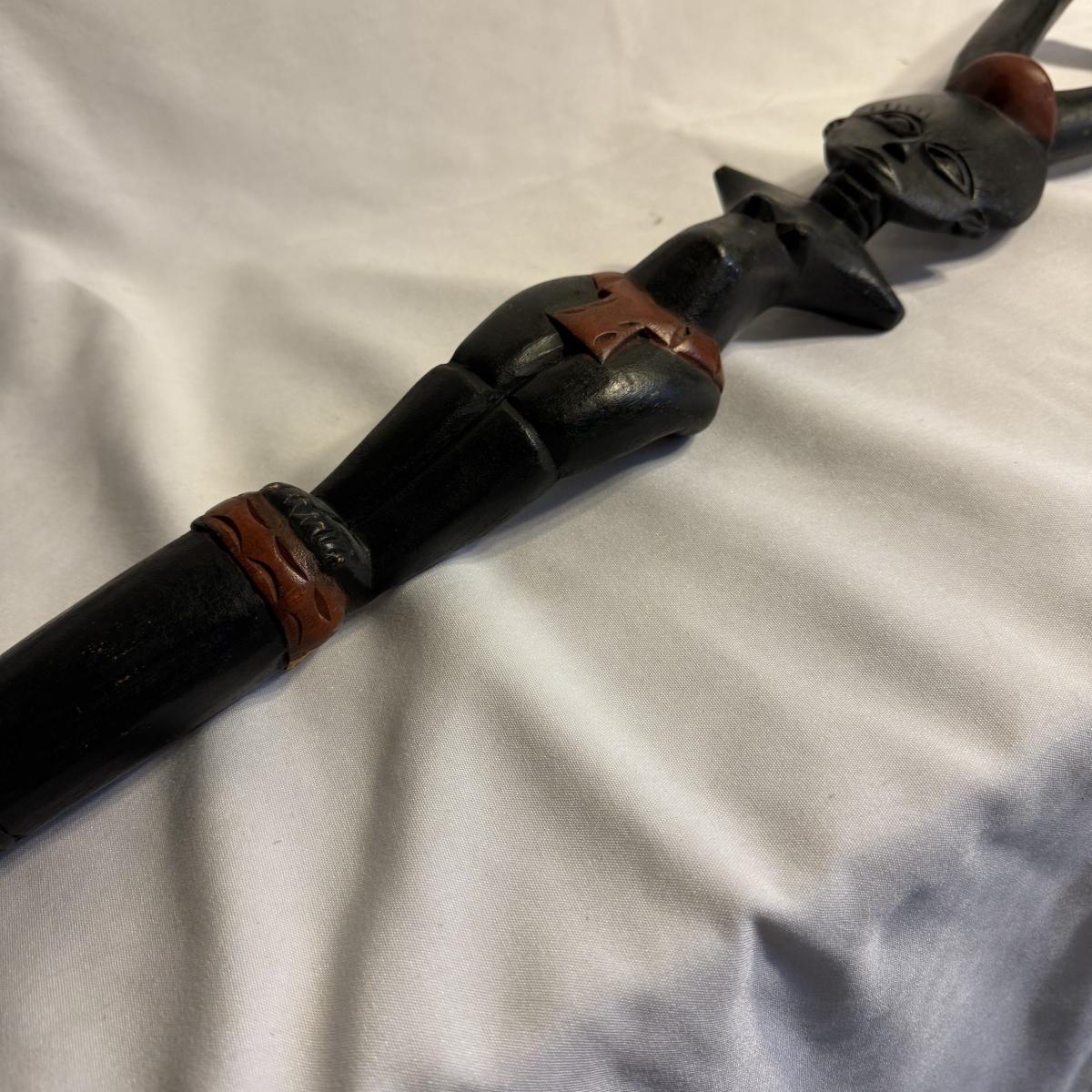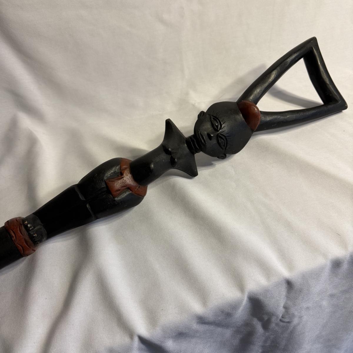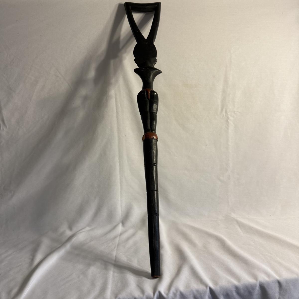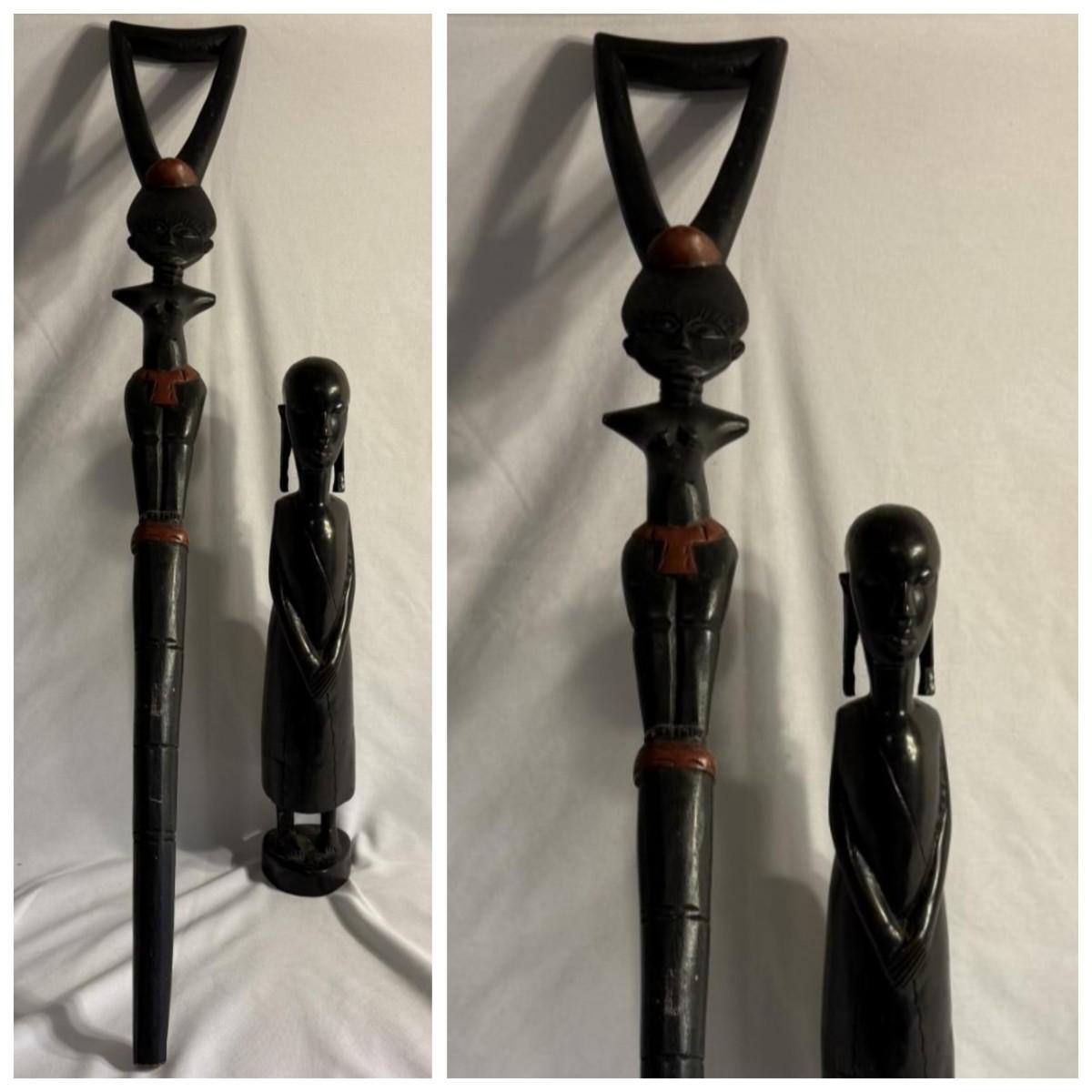 This lot contains two intricate pieces of African art that the seller states she collected in her travels. The first is a stunning wood walking stick that appears to be hand carved and painted. It depicts a person and measures 5” at its widest x 35”H. There is a small chip, see pictures for details. The second piece is an enchanting statue that appears to be carved from solid wood. This stunning statue has a peaceful presence and measures 3.5” x 19.25”H. This piece is heavy! Shipping available. Shipping can be costly. We suggest contacting our preferred local shipping provider, Postage Express, with dimensions and getting an estimate before bidding: (828) 255-9250 or shipping@postageexpressnc.com.