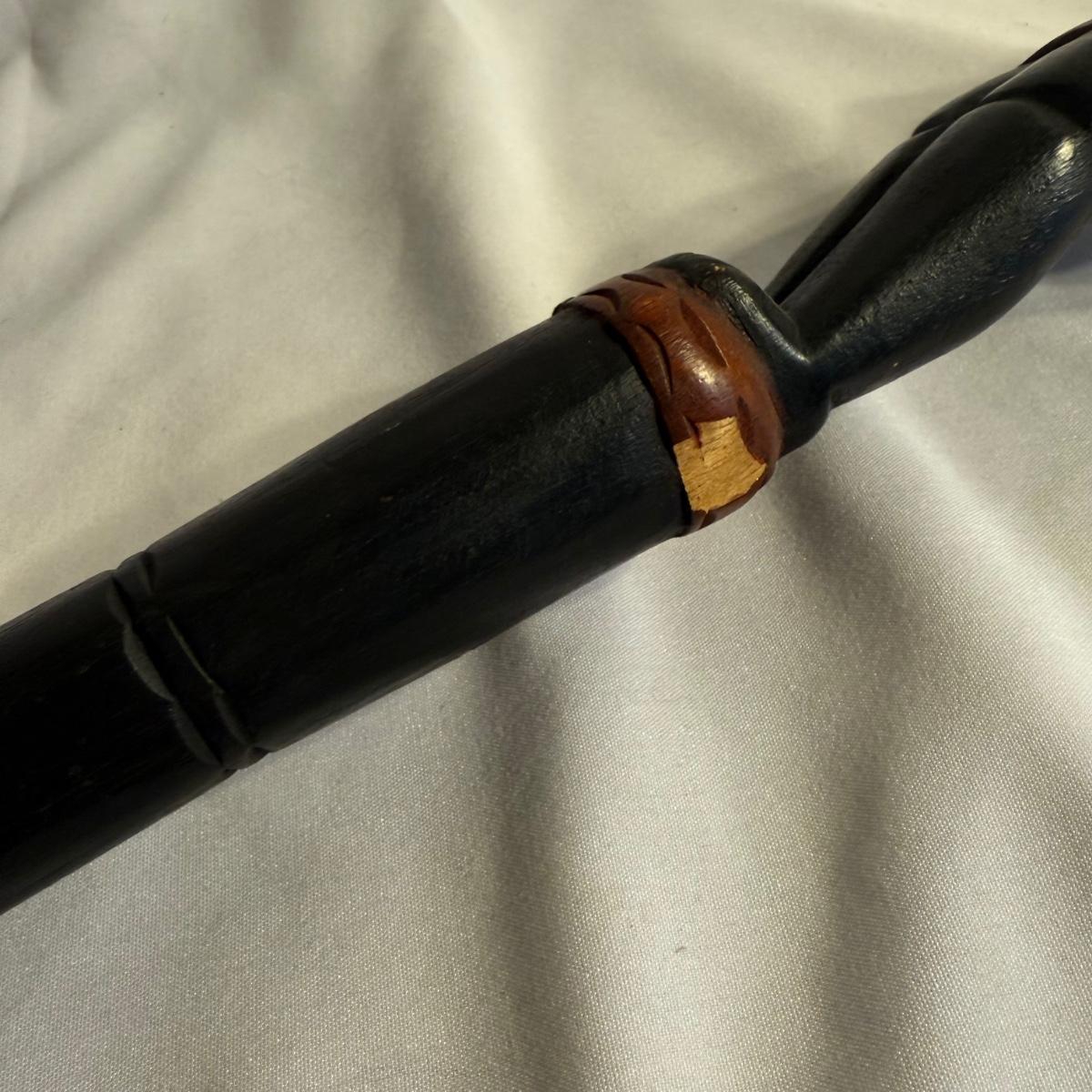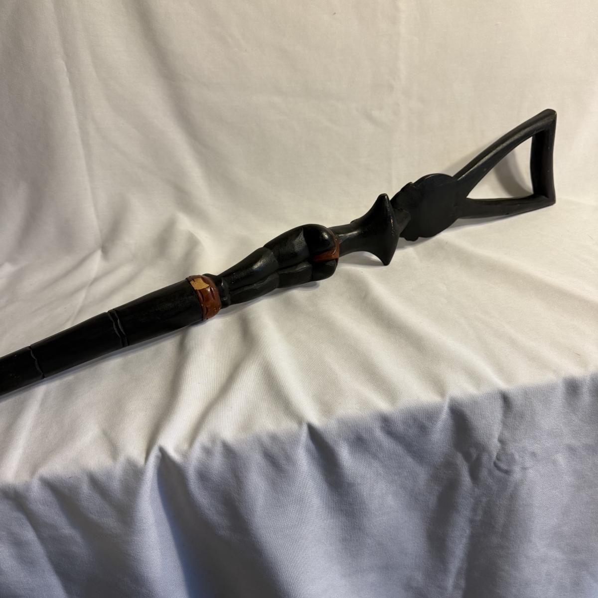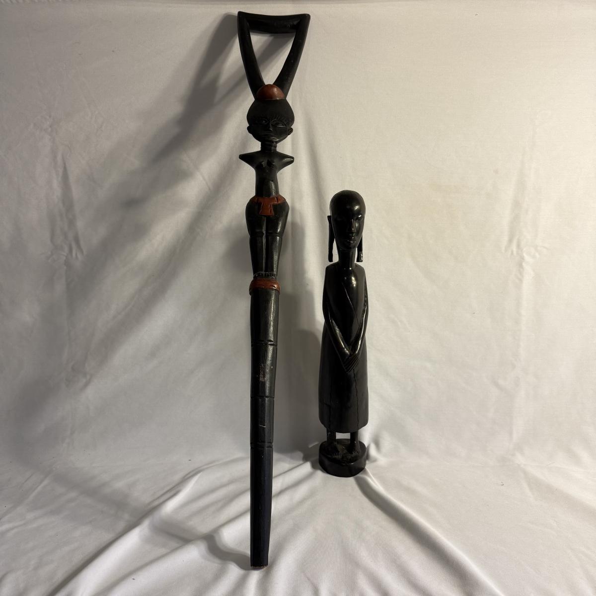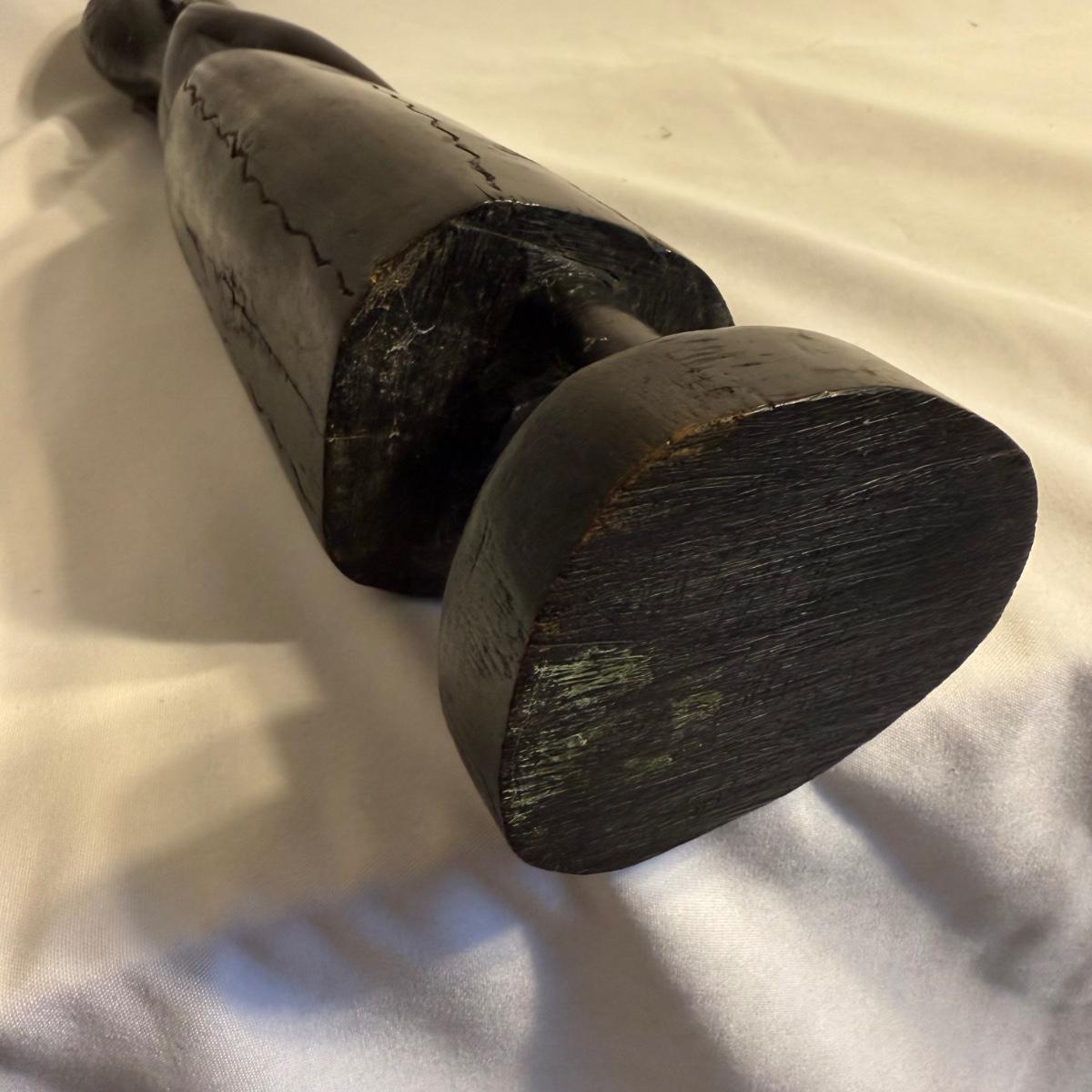 This lot contains two intricate pieces of African art that the seller states she collected in her travels. The first is a stunning wood walking stick that appears to be hand carved and painted. It depicts a person and measures 5” at its widest x 35”H. There is a small chip, see pictures for details. The second piece is an enchanting statue that appears to be carved from solid wood. This stunning statue has a peaceful presence and measures 3.5” x 19.25”H. This piece is heavy! Shipping available. Shipping can be costly. We suggest contacting our preferred local shipping provider, Postage Express, with dimensions and getting an estimate before bidding: (828) 255-9250 or shipping@postageexpressnc.com.
