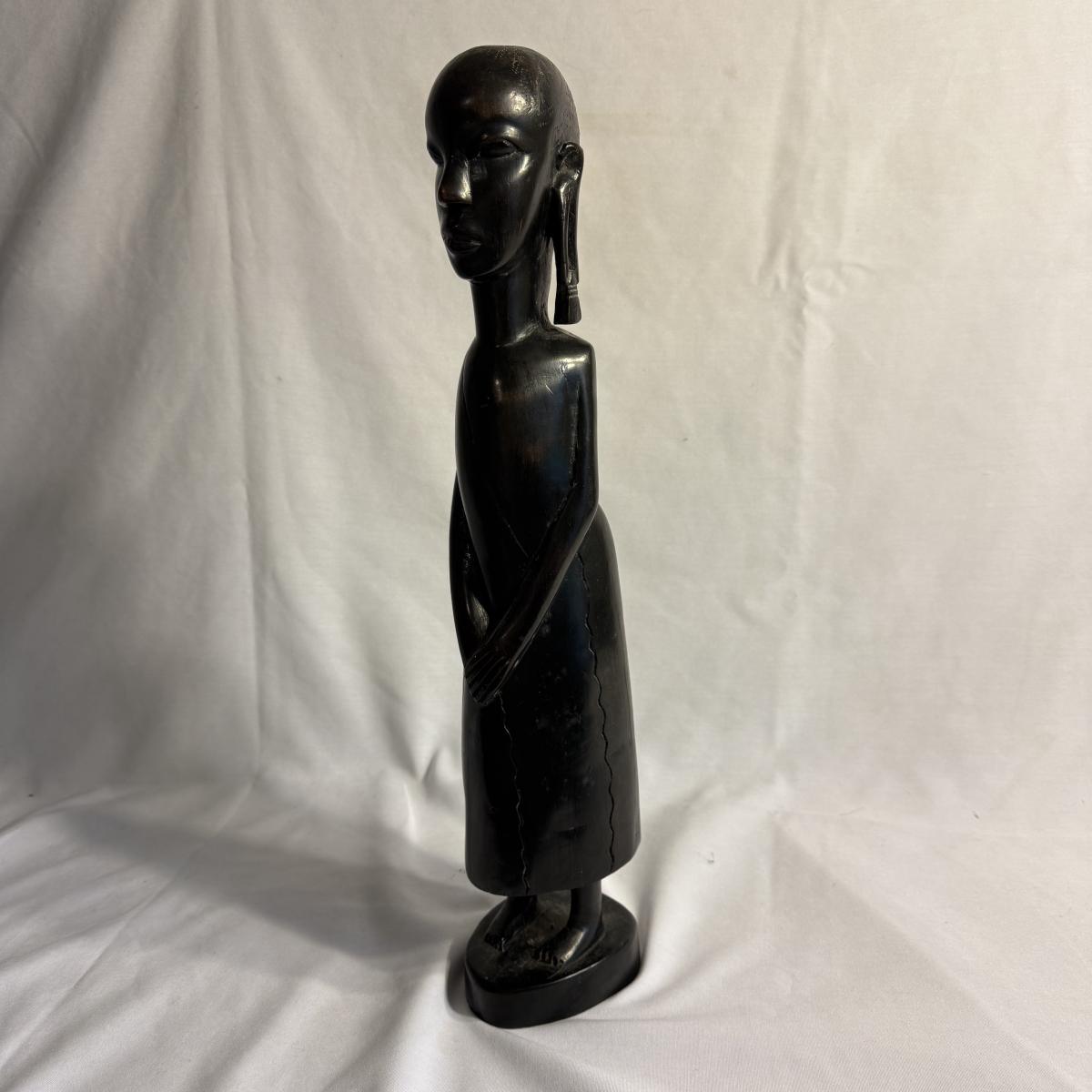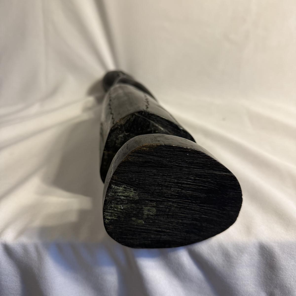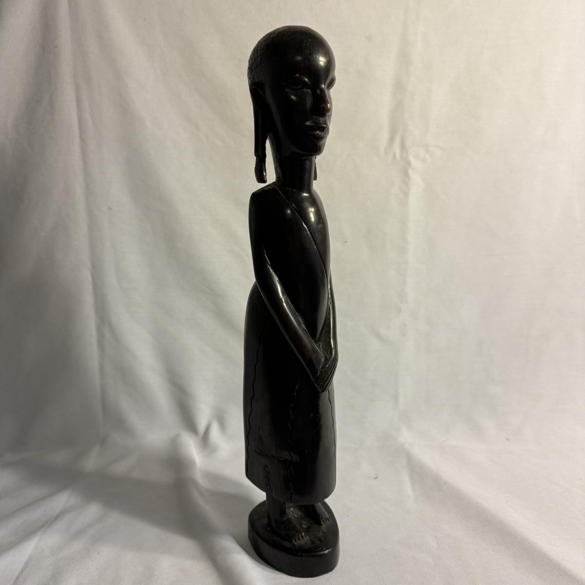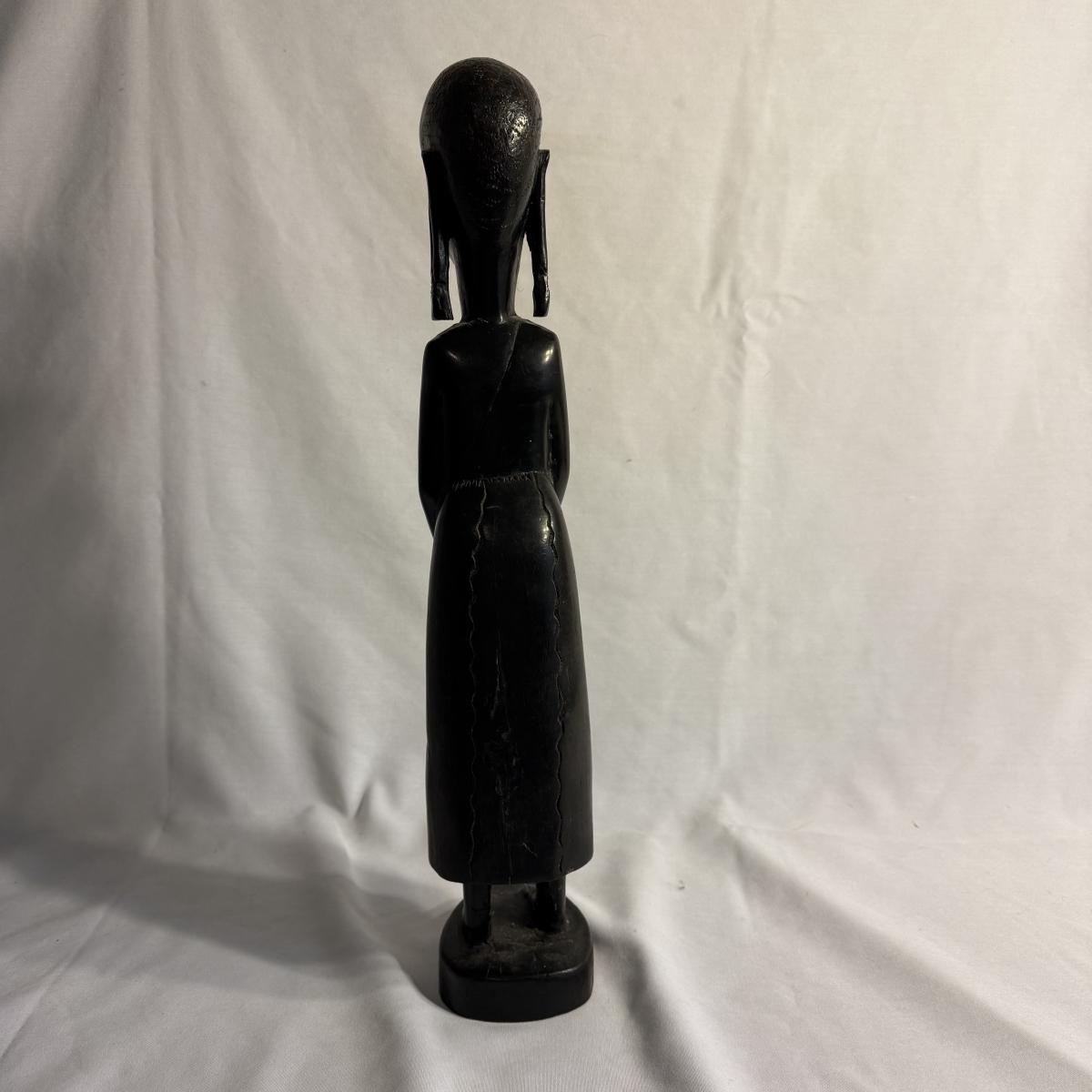 This lot contains two intricate pieces of African art that the seller states she collected in her travels. The first is a stunning wood walking stick that appears to be hand carved and painted. It depicts a person and measures 5” at its widest x 35”H. There is a small chip, see pictures for details. The second piece is an enchanting statue that appears to be carved from solid wood. This stunning statue has a peaceful presence and measures 3.5” x 19.25”H. This piece is heavy! Shipping available. Shipping can be costly. We suggest contacting our preferred local shipping provider, Postage Express, with dimensions and getting an estimate before bidding: (828) 255-9250 or shipping@postageexpressnc.com.