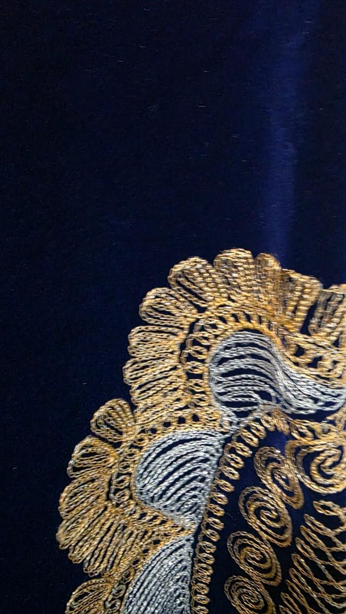 Dramatic, formal, and beautifully crafted, this deep navy velvet kaftan-style dress is defined by its rich texture and meticulous metallic embroidery. The front features an ornate, symmetrical panel of gold and silver threadwork with scrolling flourishes and leaf motifs, finished with decorative edging that frames the neckline and continues into a striking, elongated centerpiece. The sleeves are detailed with coordinating embroidery at the cuffs, and the hem is finished with a matching embellished border that gives the silhouette a polished, ceremonial presence.