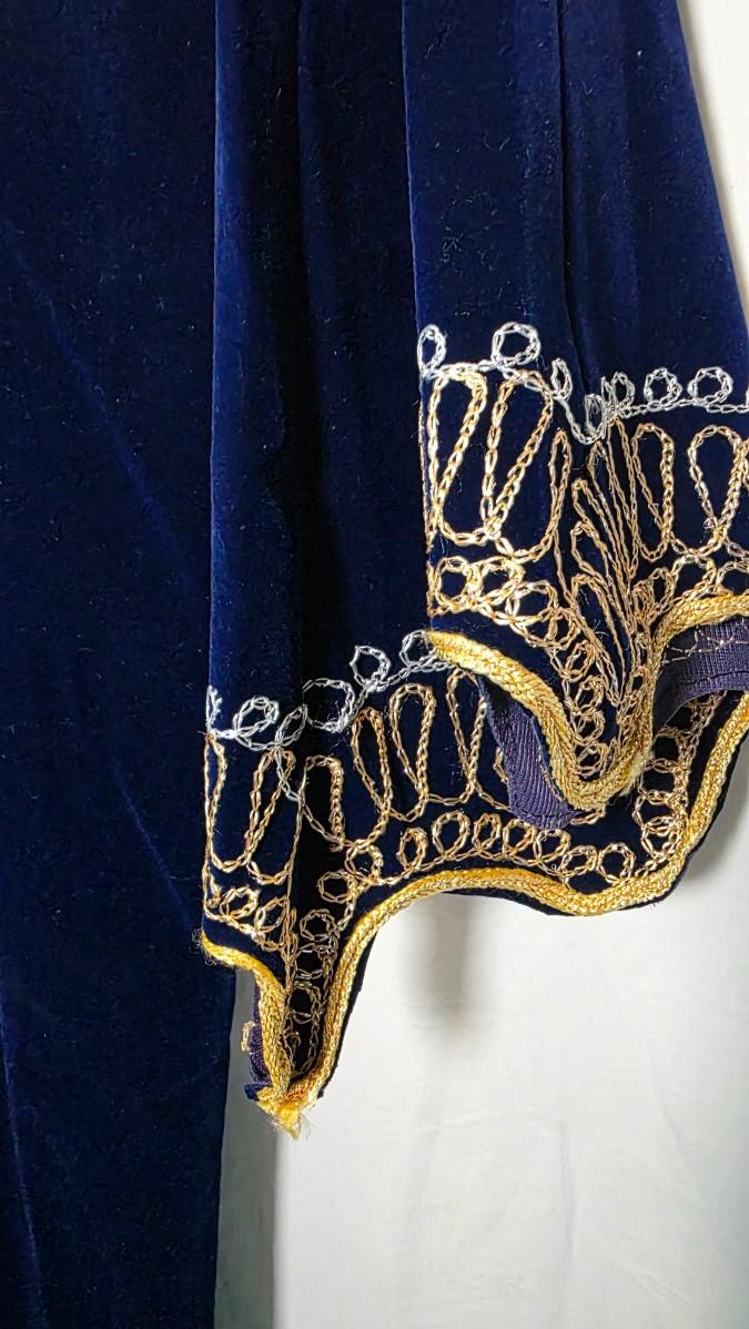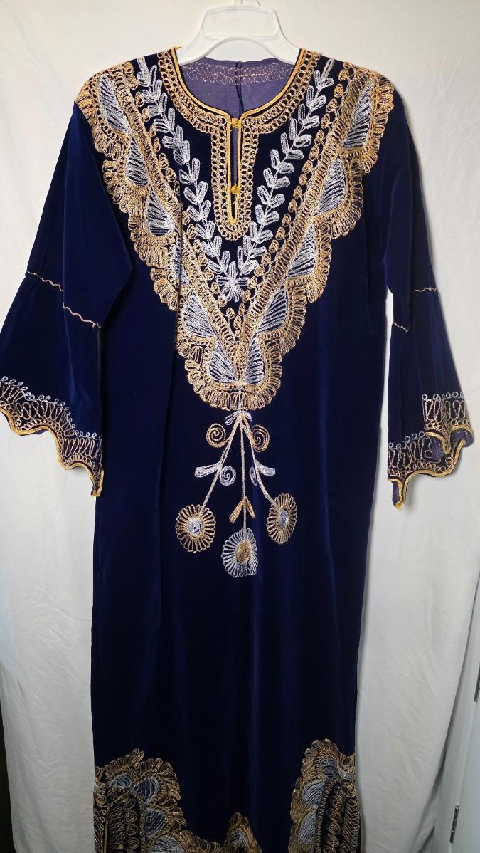 This piece reads as a true dress rather than a robe—designed to be worn as a complete statement garment for an evening event, cultural celebration, or special occasion. The velvet has a refined luster under light, while the metallic stitching provides depth and dimension that photographs beautifully. Measurements are shown in the photos; please use those images as the reference for best fit.