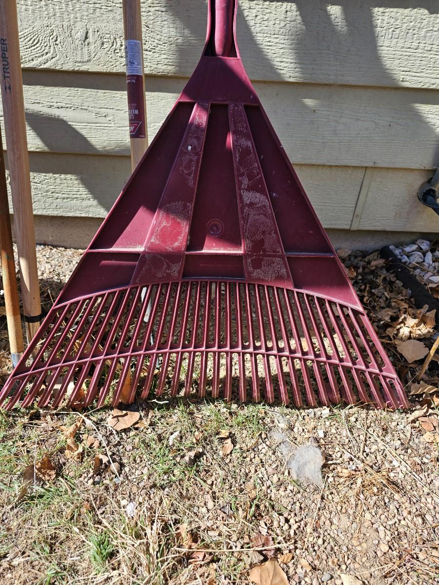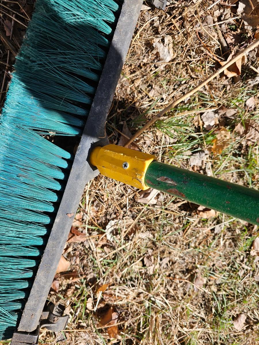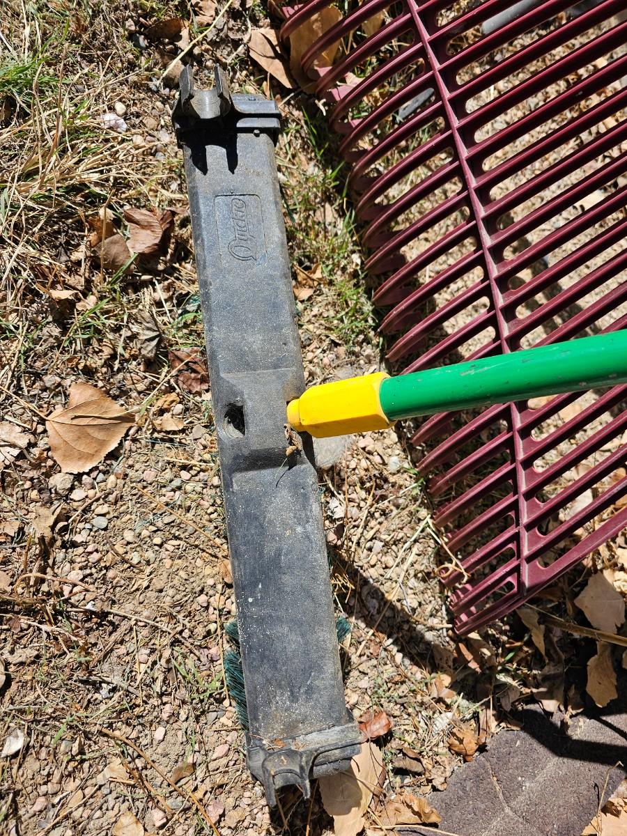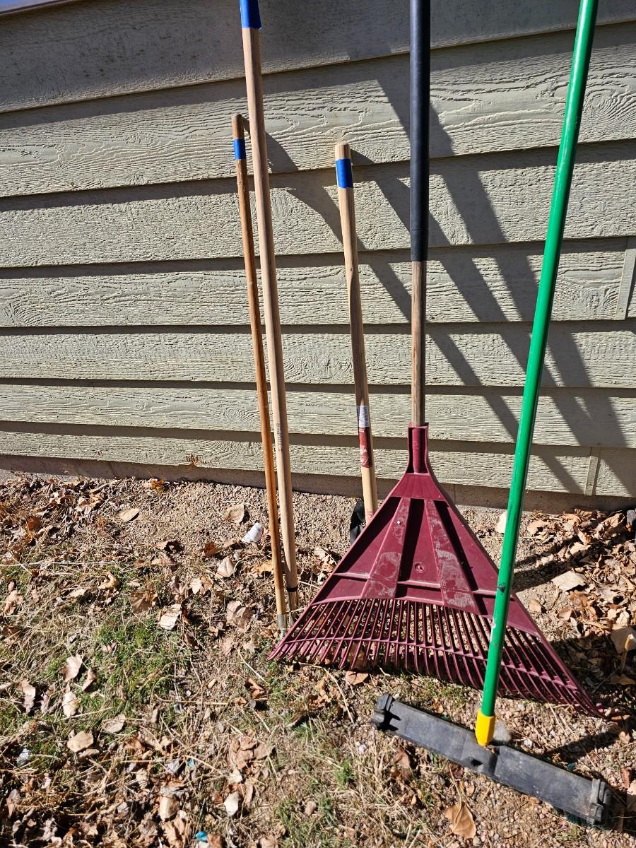 Handheld yard and garden tools - Leaf rake - push broom - weed tool - and two handles
