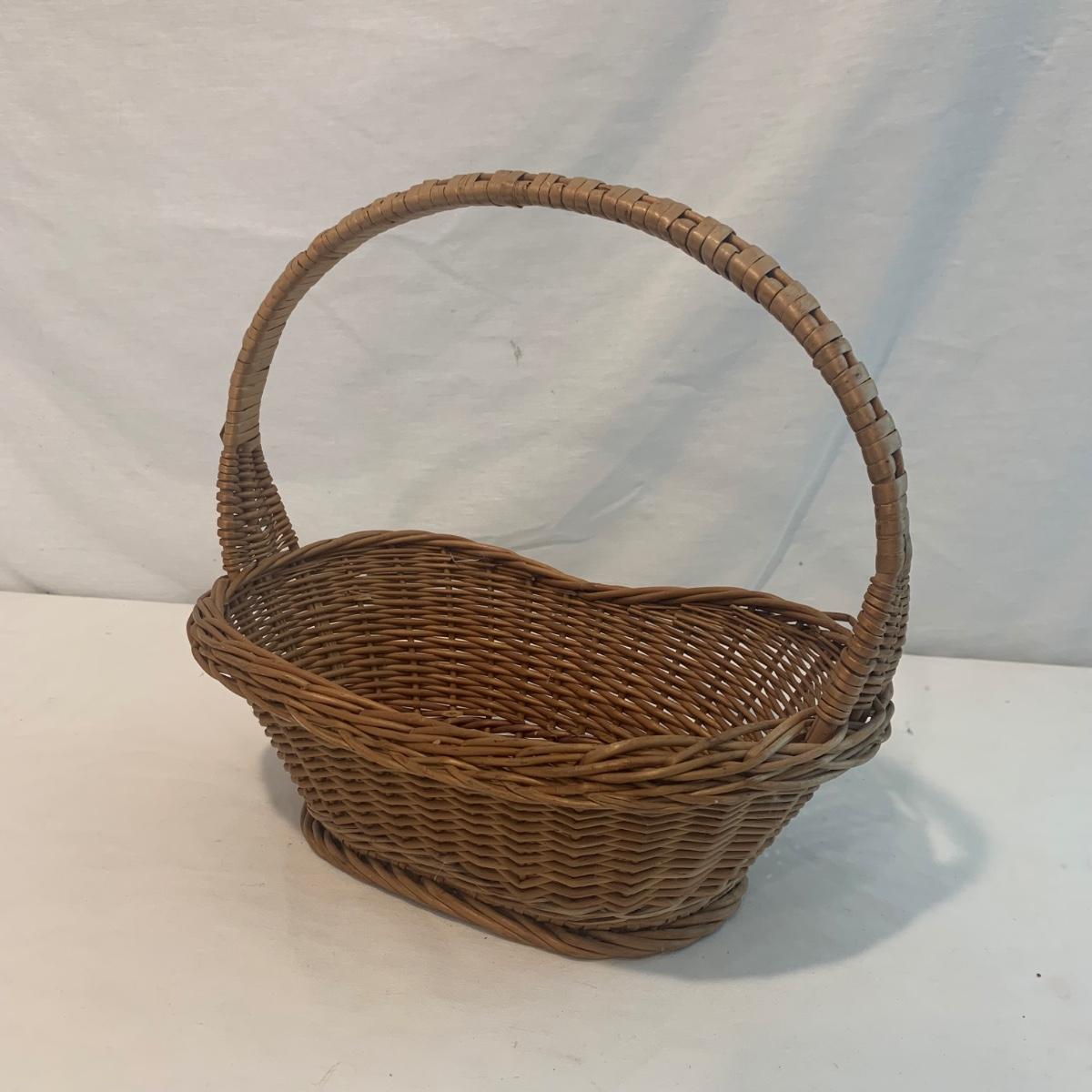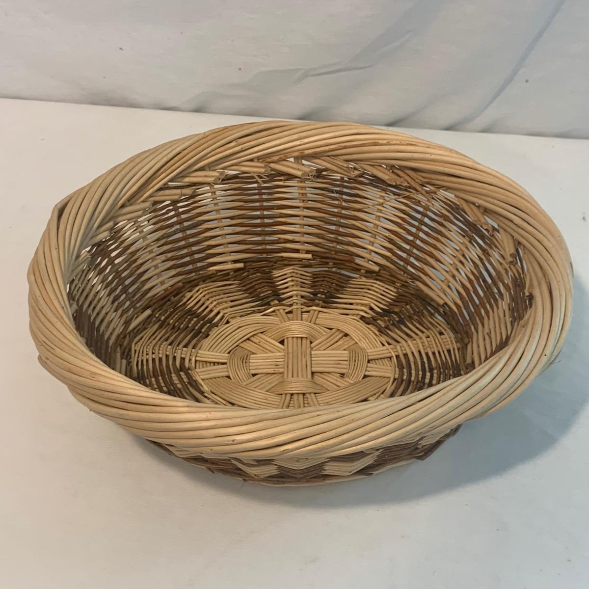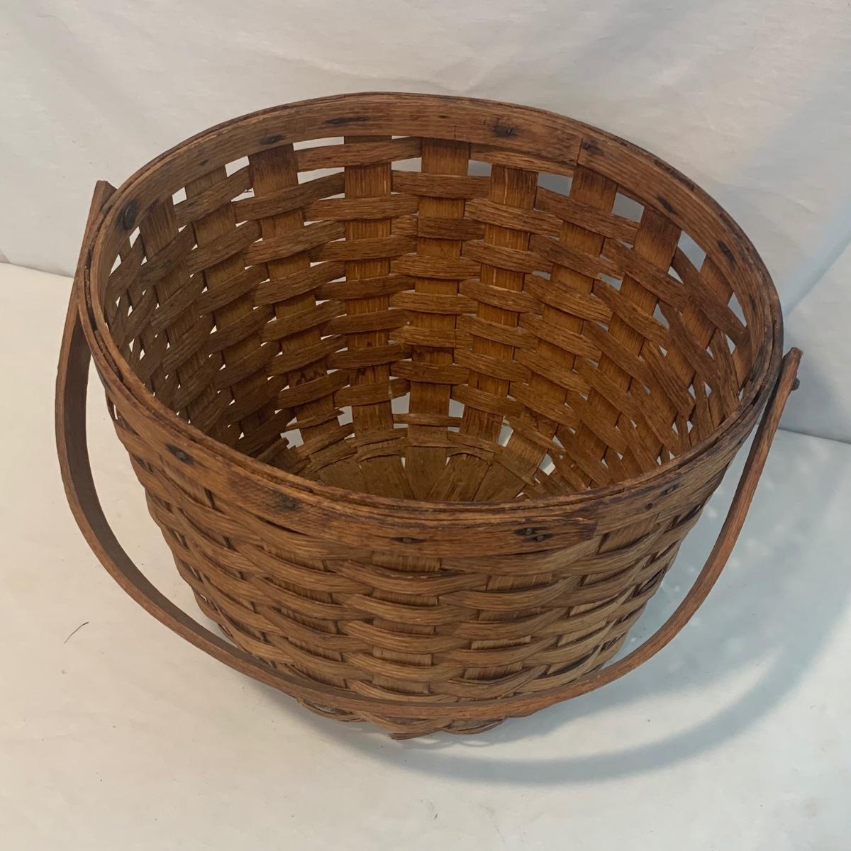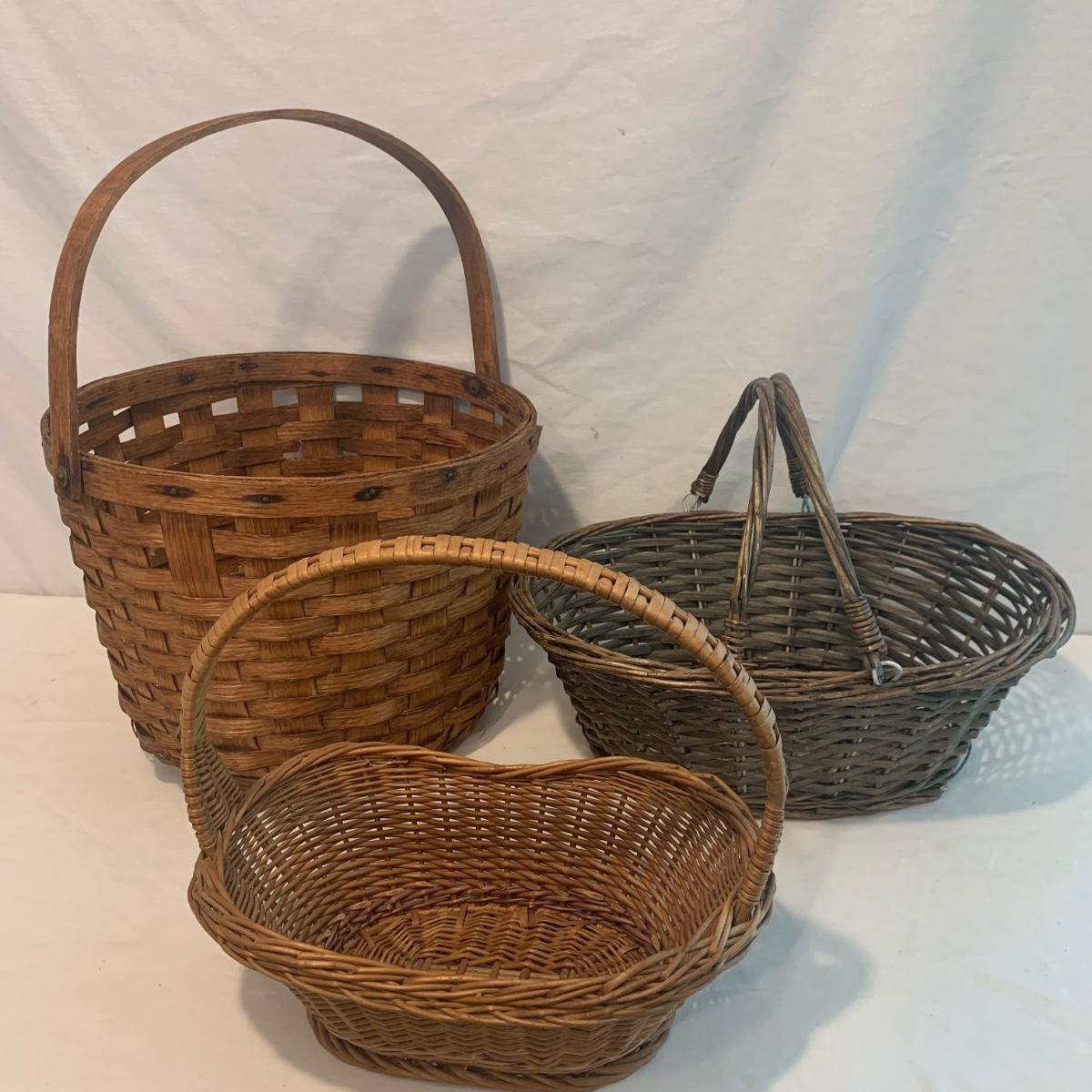 Six woven baskets, five of which have handles. Two have stationary handles while the other three have movable handles. The largest basket is round and measures 13.75”D x 11”H, not including the handle. This one has a little damage; see photos.